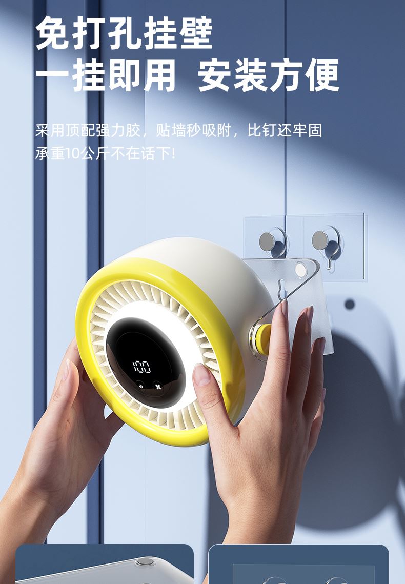 产品材质:ABS 产品功能:100档风力调节 产品容量:3000mAh 产品尺寸:165*166*90.8mm 产品颜色:戴森灰,柠檬色 100档调节,风力随心选;智能数显外屏,档位清晰可见;搭配空调使用,能够加快制冷;可挂壁两用,使用更方便,使用场景更多;小夜灯功能,伴我们安心入眠。