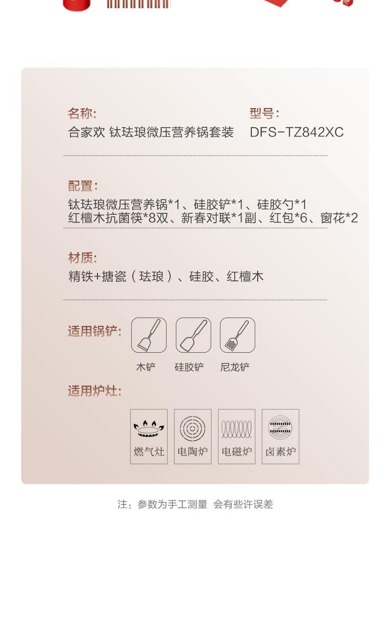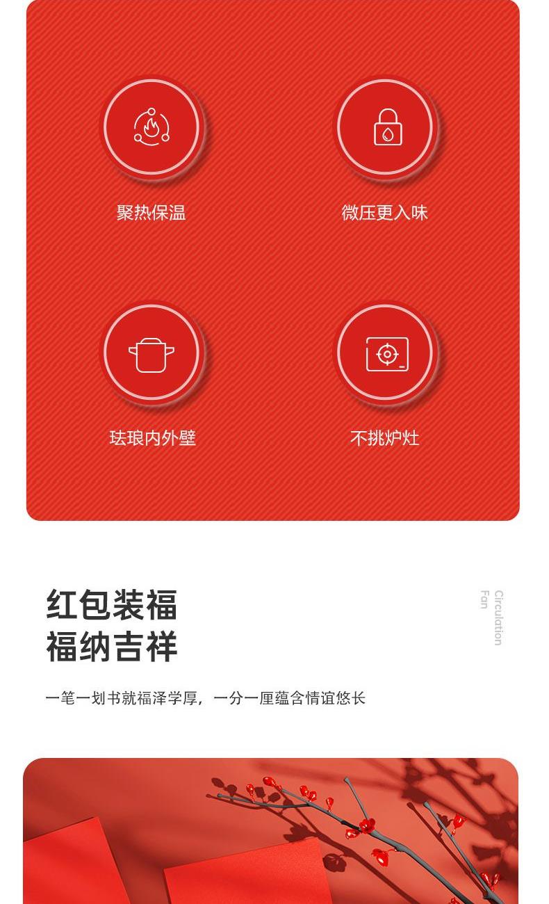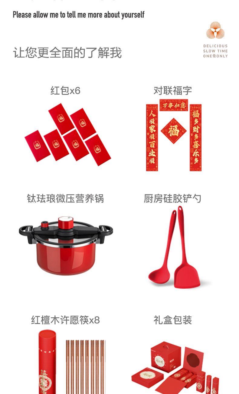 产品配置:钛珐琅微压营养锅*1、硅胶铲*1、硅胶勺*1 红檀木筷*8双、新春对联*1副、红包*6、 窗花*2 产品材质:精铁+搪瓷(珐琅)、硅胶、红檀木 包装方式:精美礼盒+邮购箱 1、团圆是美的仪式,家是永远的港湾。 这一年,我们都在赶路,错过了许多风景。 2、而家人的笑脸,是世间的风景。让我们停下脚步,与家人一起迎新年。 3、红包装福,福纳吉祥。一笔一划书就福泽学厚,一分一厘蕴含情谊悠长。 4、迎新纳福贴春联,红红的春联不仅是节日的装饰,更承载着对新一年的美好祝愿。 5、年味浓的地方总在餐桌上,和重要的人一起见证珍贵时光,指游方寸 筷意生活。吃的是团圆幸福,品的是人生百味,享的是万家安康。 6、愿新年胜旧年,往后岁月,既有诗意,也有烟火。