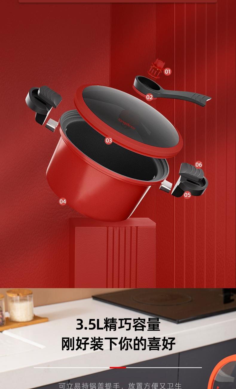 产品口径:22cm 产品容量:3.5L 产品材质:精铁 产品净重:1.8kg 产品毛重:2.6kg 整箱重量:13.6kg 食品级不粘涂层,红色烤漆锅体 微压烹饪,锁住食材新鲜营养 推拉双锁扣耐热双耳推拉锁紧把手,防烫隔热 可视烹煮硅胶密封玻璃可立锅盖,可视烹饪