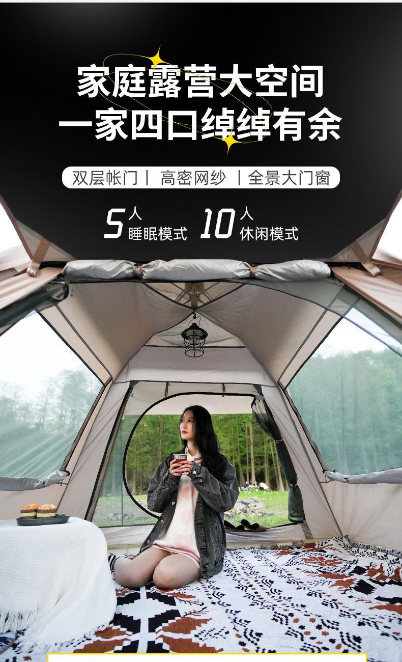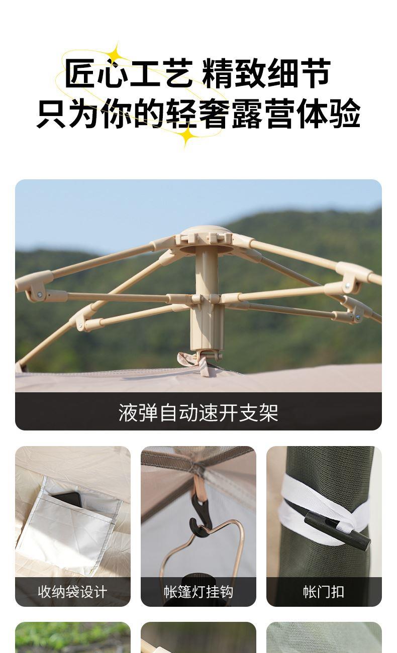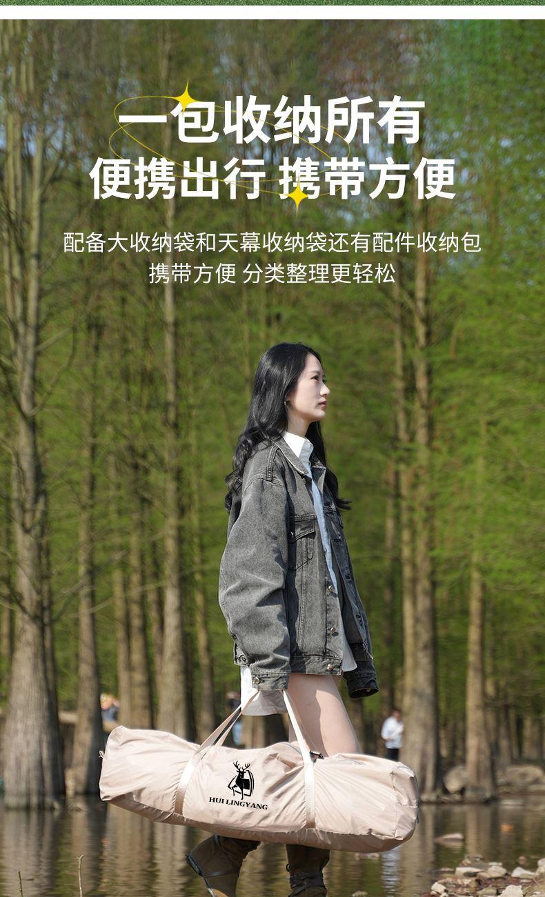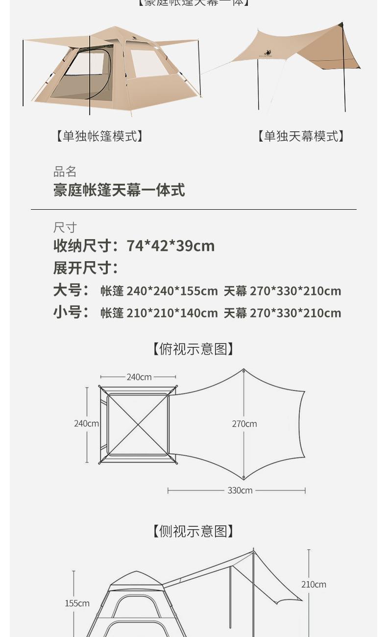 货号:HLY-ZP-24014 展开尺寸:210*210/330*140cm 收纳尺寸:74*42*39cm 重量: 约7.5kg 帐篷结构:单层帐 液压速开,全自动免搭建,一提即可展开;外帐可做沙滩天幕,一帐多用,随机切换满足多种需求 告别闷热环境,宽大高密度网纱双门设计,透气防蚊 宽大空间,可容纳3-4人,畅享一家人舒适露营;强韧防风骨架防断更安全