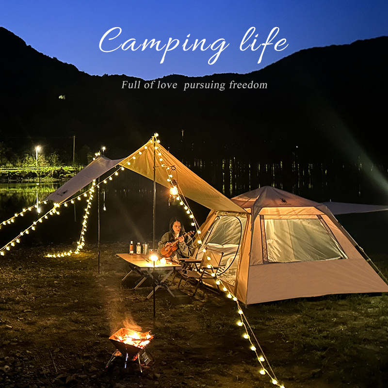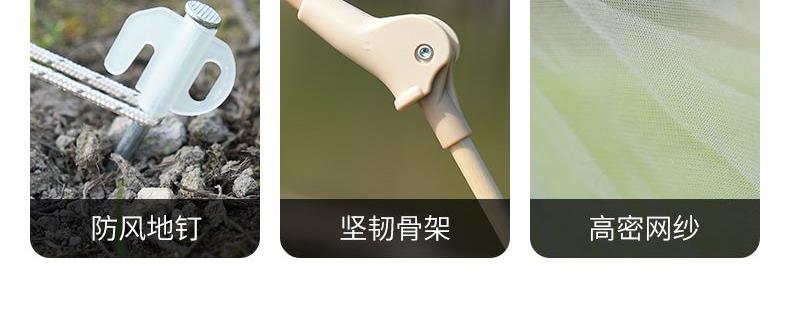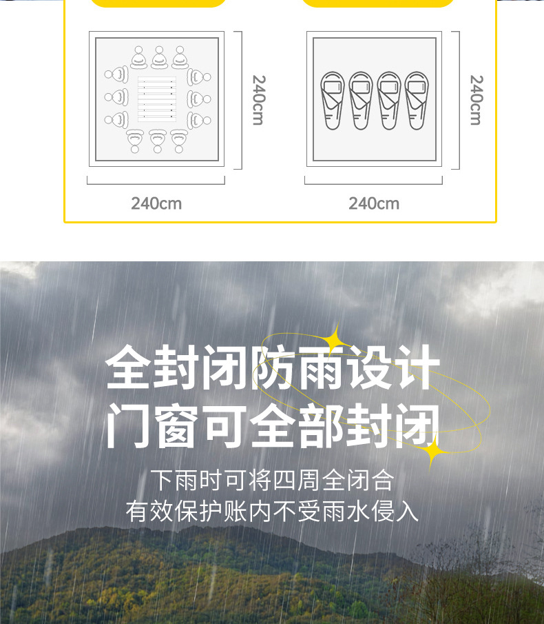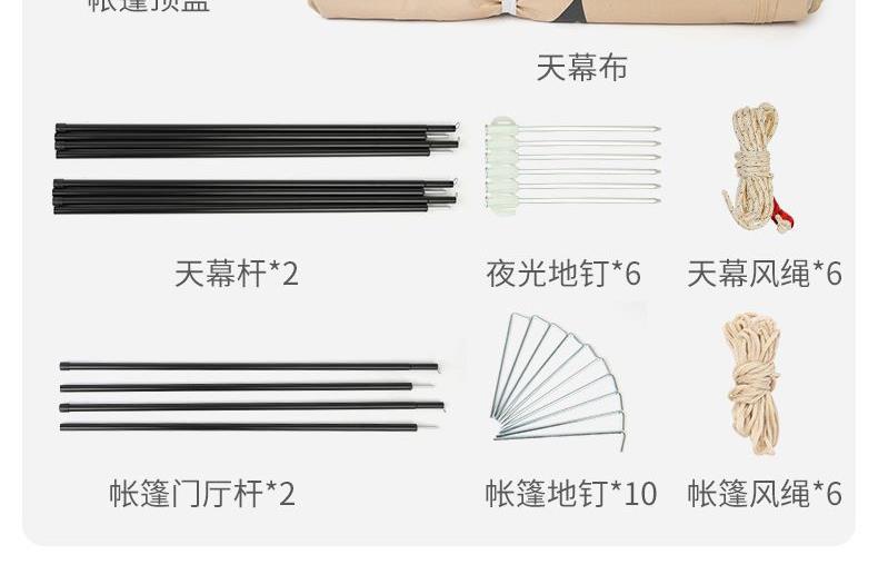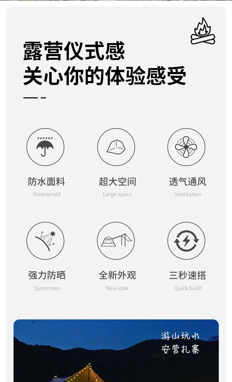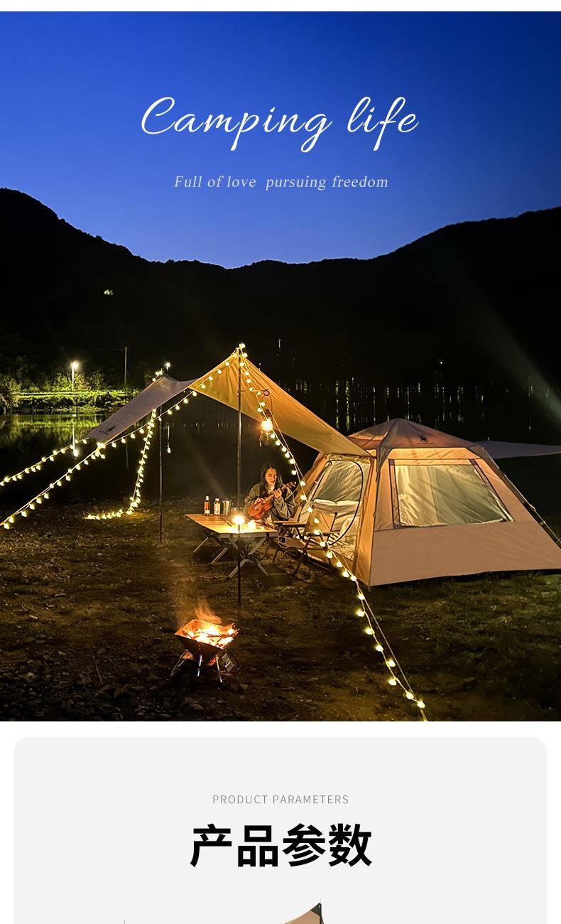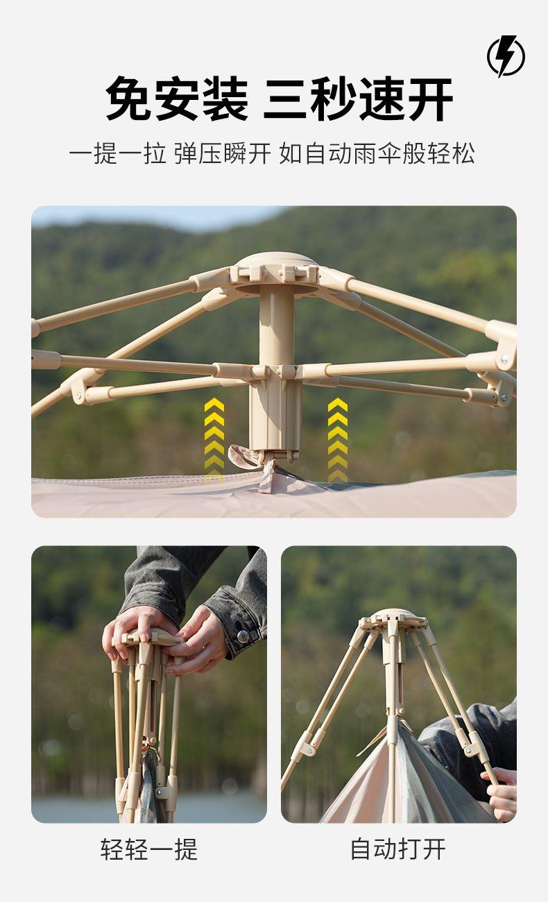 货号:HLY-ZP-24014 展开尺寸:210*210/330*140cm 收纳尺寸:74*42*39cm 重量: 约7.5kg 帐篷结构:单层帐 液压速开,全自动免搭建,一提即可展开;外帐可做沙滩天幕,一帐多用,随机切换满足多种需求 告别闷热环境,宽大高密度网纱双门设计,透气防蚊 宽大空间,可容纳3-4人,畅享一家人舒适露营;强韧防风骨架防断更安全