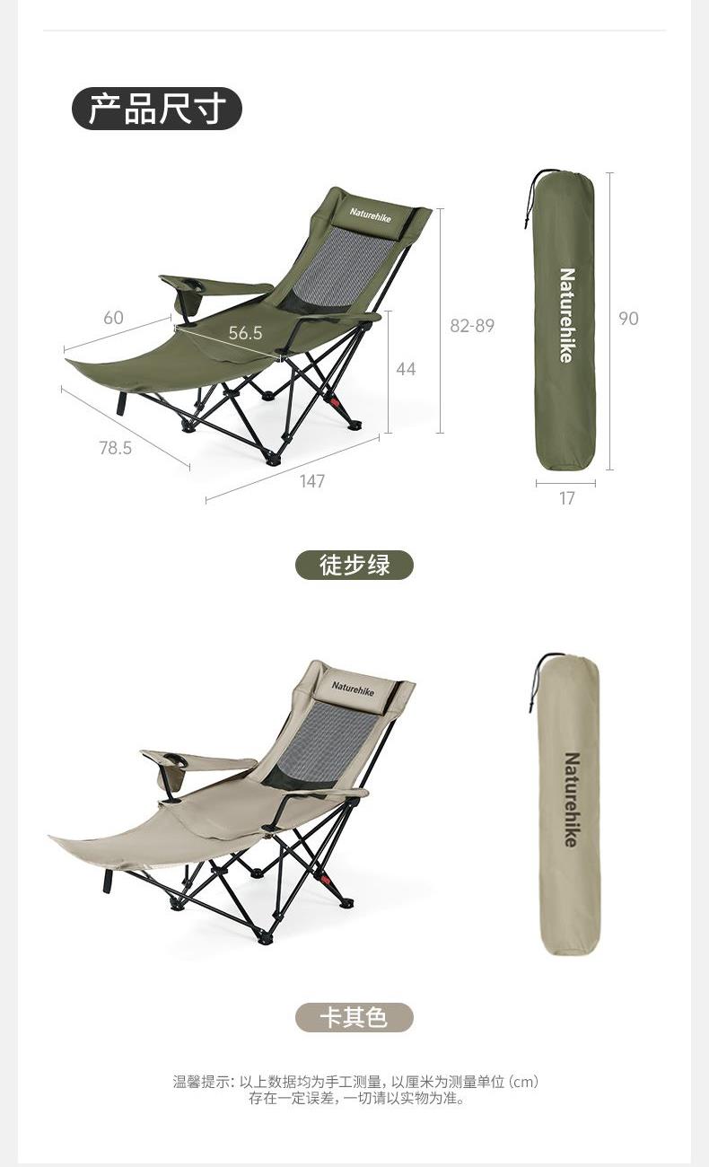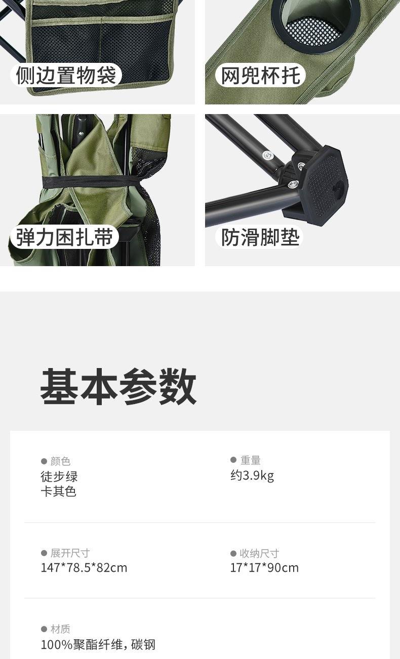 颜色 徒步绿、卡其色 ●展开尺寸 147*78.5*82cm @ 重量 约3.9kg 收纳尺寸 17*17*90cm ·材质 牛津布,碳钢