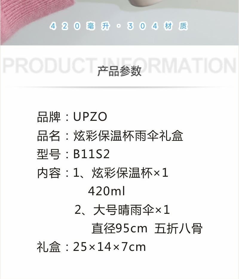 型号: B11S2 产品内容 1、 大号晴雨伞 五折八骨 伞下直径95CM 2、 炫彩保温杯×1 304内胆 PP杯盖 420毫升容量 外盒: 25×14×7cm 大号晴雨伞主题设计融入 五折八骨大伞 外观靓丽 实用性强 420毫升高颜值保温杯 304内胆 精美设计文案