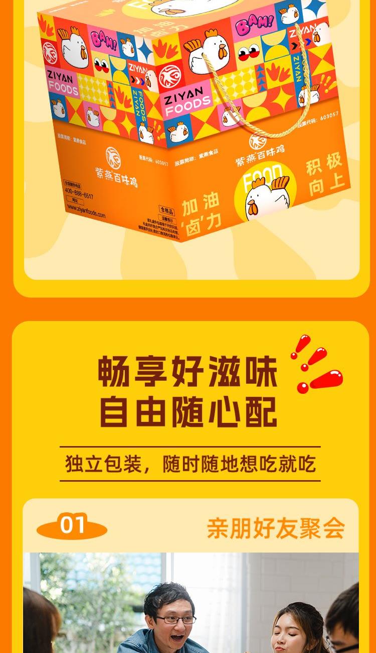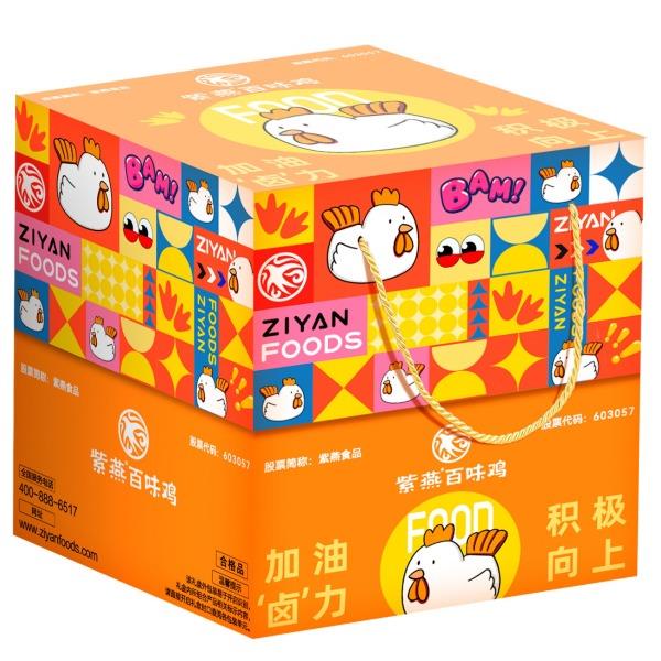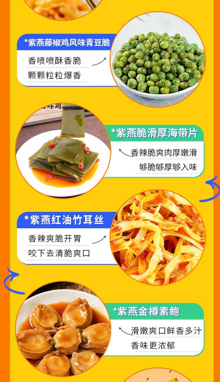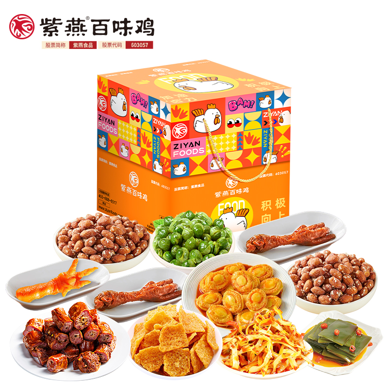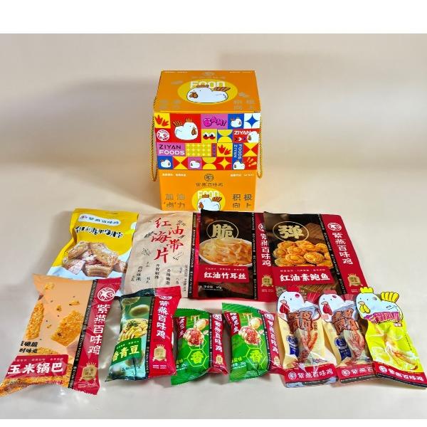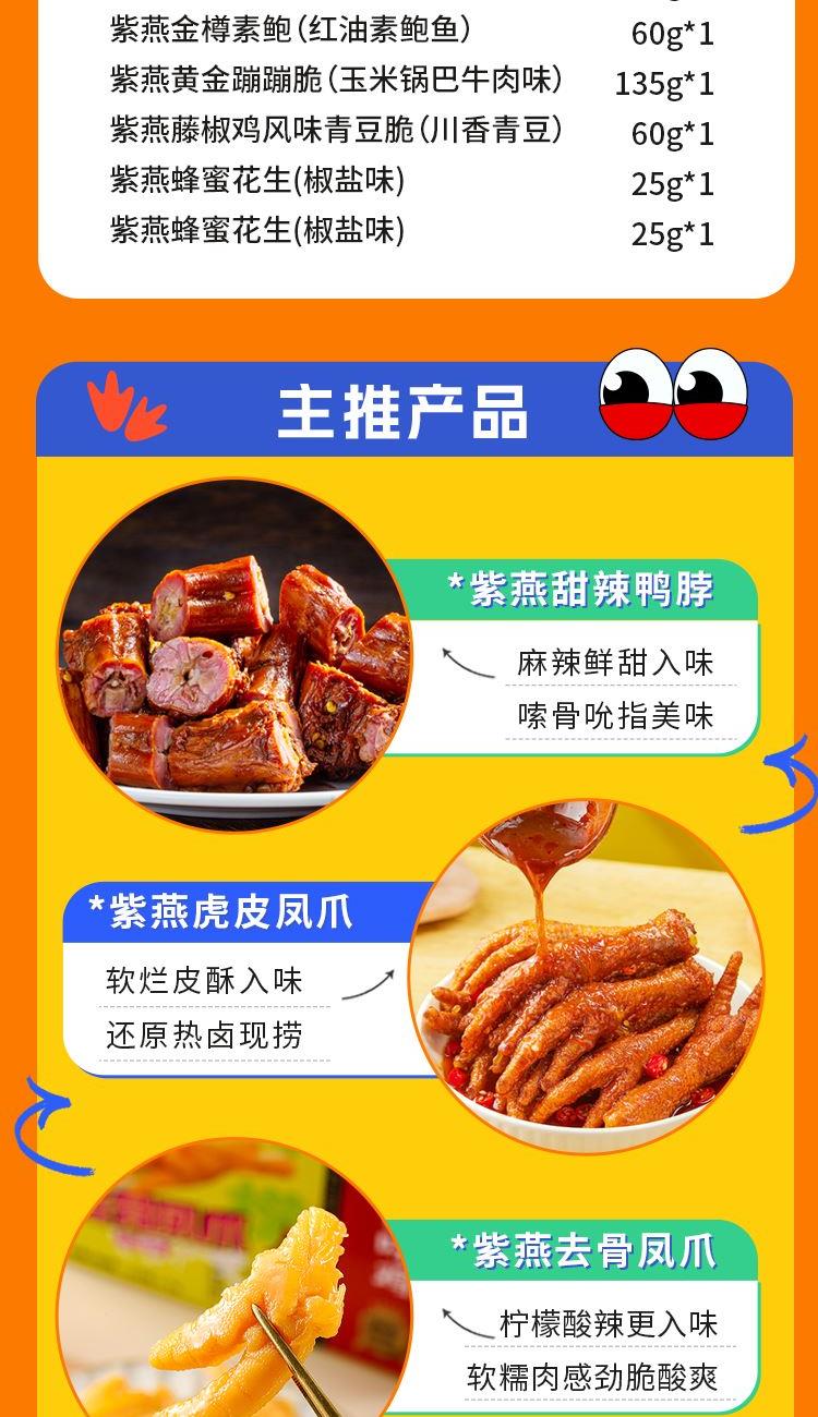 紫燕甜辣鸭脖60g*1 紫燕虎皮凤爪(卤香味)(单只)30g*1 紫燕虎皮凤爪(卤香味)(单只)30g*1 紫燕去骨凤爪(柠檬味)(单只)24g*1 紫燕红油竹耳丝60g*1 紫燕脆滑厚海带片(红油海带片)60g*1 紫燕金樽素鲍(红油素鲍鱼)60g*1 紫燕黄金蹦蹦脆(玉米锅巴牛肉味)135g*1 紫燕藤椒鸡风味青豆脆(川香青豆)60g*1 紫燕蜂蜜花生(椒盐味)25g*1 紫燕蜂蜜花生(椒盐味)25g*1 礼盒+组装+外盒