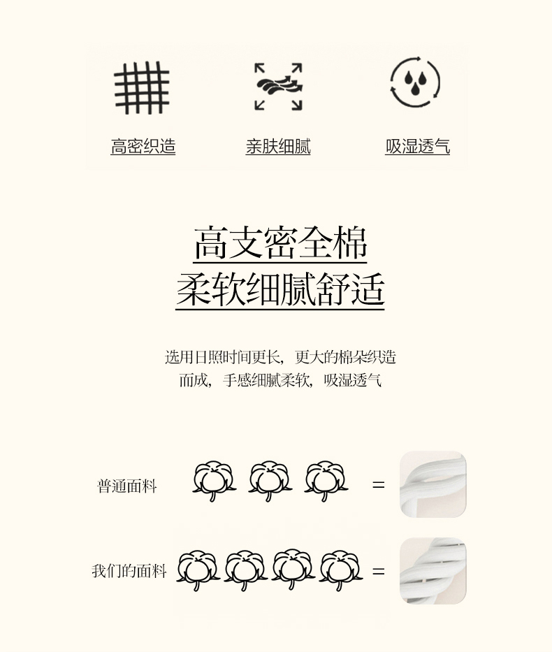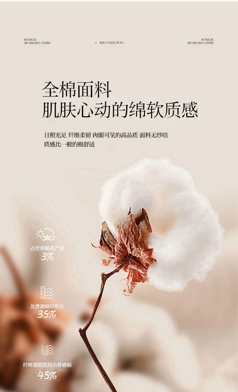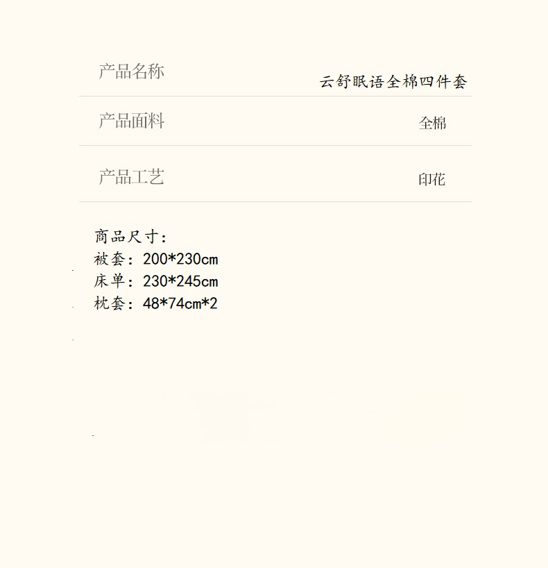被套:200*230cm 床单:230*245cm 枕套:48*74cm*2 面料:全棉 产品包装:精美礼盒 产品特点: 全棉面料舒适、温度平衡,接受皮肤时感到柔软而不僵硬。棉纤维是天然纤维。纯棉织品与肌肤接触无任何刺激,对人体有益无害。