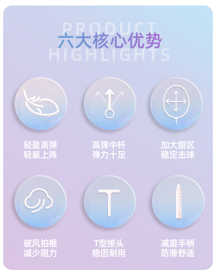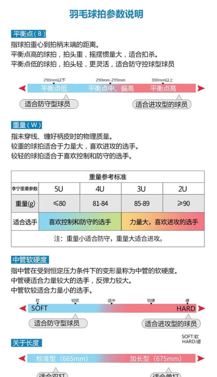 握柄规格:G1 球拍长度:675+1MM 球拍重量:95-100G 承受磅数:18-22LBS 平衡点:320+2MM 拍框材质:铝合金拍杆 材质:碳素纤维中杆 直径:7.0MM 中杆硬度:适中 1.进阶级推荐,攻守两用,耐打,易上手 2.碳铝合金拍框,坚固牢靠,不易变形 3.一体成型接头,稳定耐用,增强球拍打击力度 4.低风阻锥盖,减少空气阻力,挥拍速度更快更灵活 5.舒适防滑手柄,手感舒适不震手,吸汗防滑