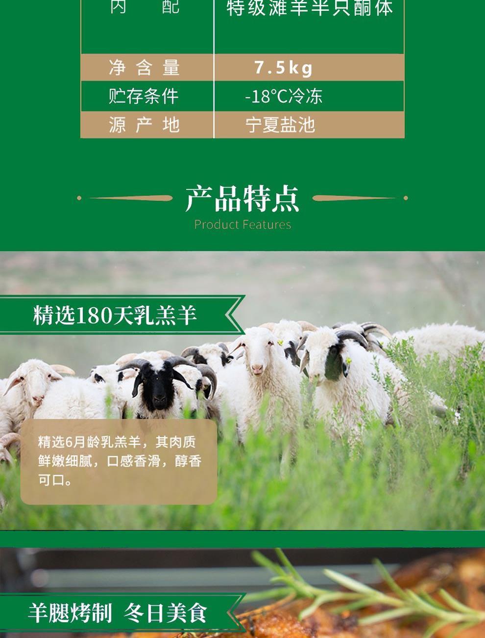配置: 特级滩羊半只酮体 7.5kg 一方水土,养育一方特色滩羊盐池滩羊食百草 “吃中草药 (甘草、苦豆子)喝弱碱水"长大的羊。 中和体内酸性,使得肉质鲜嫩细腻,脂肪分布均匀原切滩羊羊肉不腥不膻。 宁夏盐池县 自然环境优异,气候冬长夏短 日照充足, 土地呈盐碱化,使得水源呈弱碱性, 盐池草原呈半沙漠化,其中含名贵中草药约110种左右 新鲜屠宰,保证肉质鲜美!