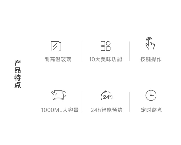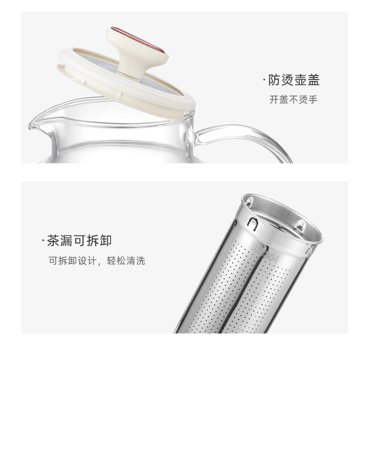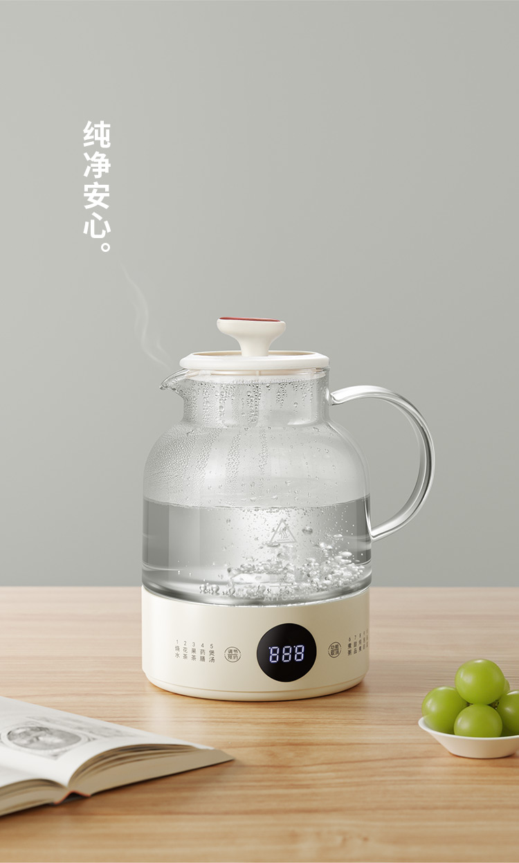 额定电压:220V~ 额定频率:50Hz 额定功率:800W 产品容量:1.0 L 重 量:0.9kg 颜 色:奶油白 包装尺寸:192*192*252mm 包装清单:主机、滤网、壶体、说明书 主要材质:高硼硅玻璃 1.大功率加热,轻松快煮 2.可视高硼硅玻璃 耐冷热 3.茶水分离,提升茶汤品质 4.24小时预约,1分钟内提壶记忆 5.10大精选功能,解锁花样暖饮