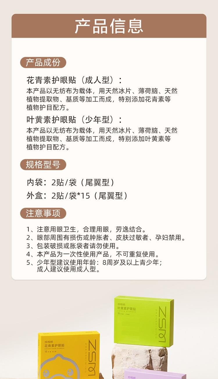 规格: 15对/盒 内袋2贴/袋(尾翼型) 外盒:2贴/袋*15(尾翼型) 商品毛重:169.00g 本产品以无纺布为载体,用天然冰片、薄荷脑、天然植物提取物、基质等加工而成,特别添加叶黄素等植物护目配方。