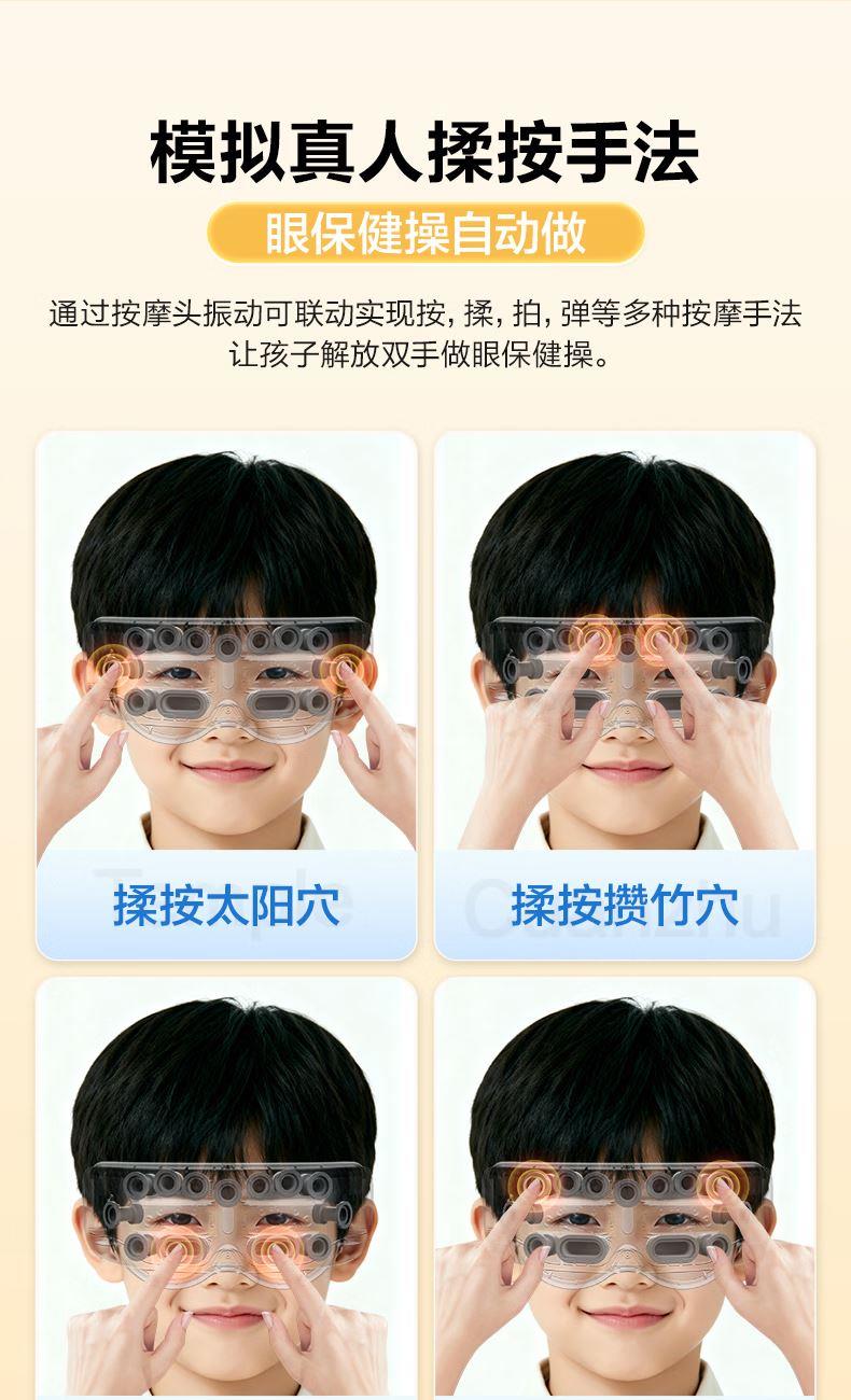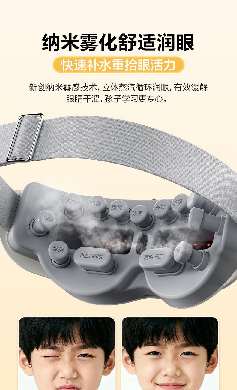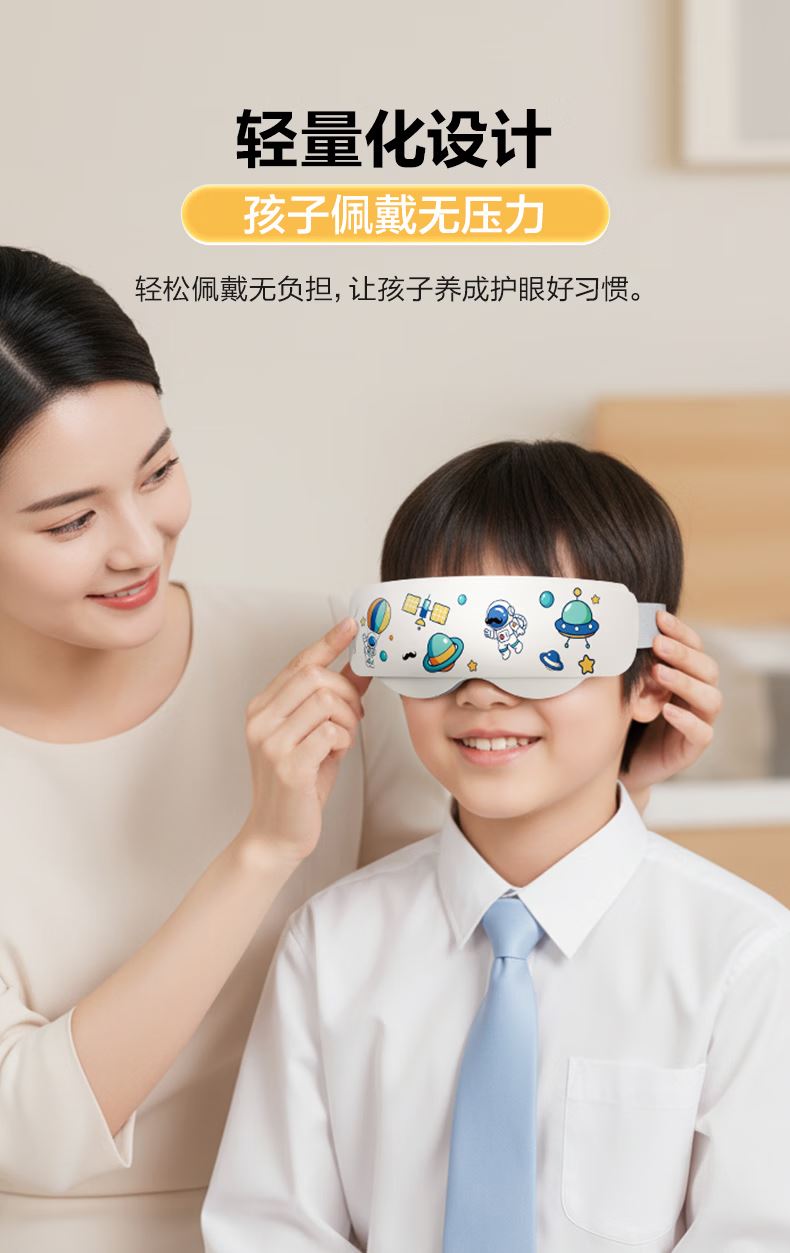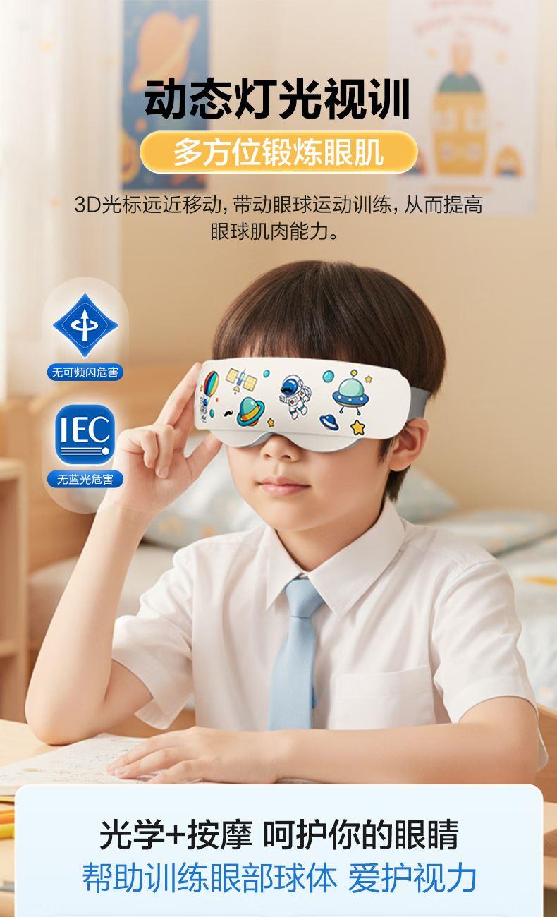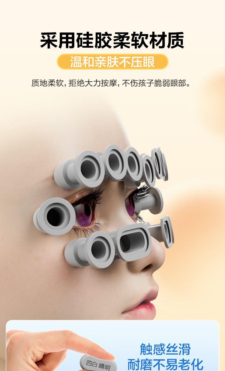 档位调节:五档调节 额定功率:10W 额定电压:5V 供电方式:Type-C 操控方式:按键式 功能:温感热敷 多模式按摩 按摩手法:点震按摩 包装清单:主机+充电线+使用说明书(含保修卡)+注水器*1+贴纸*2 专为儿童设计,科学保护眼视力 舒压+润眼+视训,三效合一,实力护眼 15大穴位覆盖,点对点精放松 模拟真人揉按手法,眼健操自动做 动态灯光视训,多方位锻炼眼肌