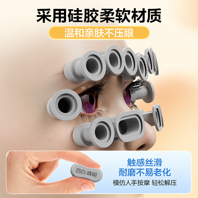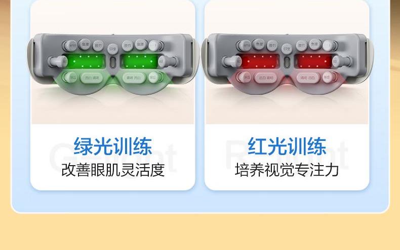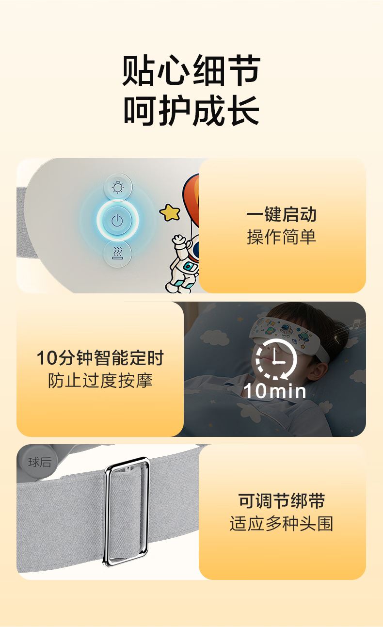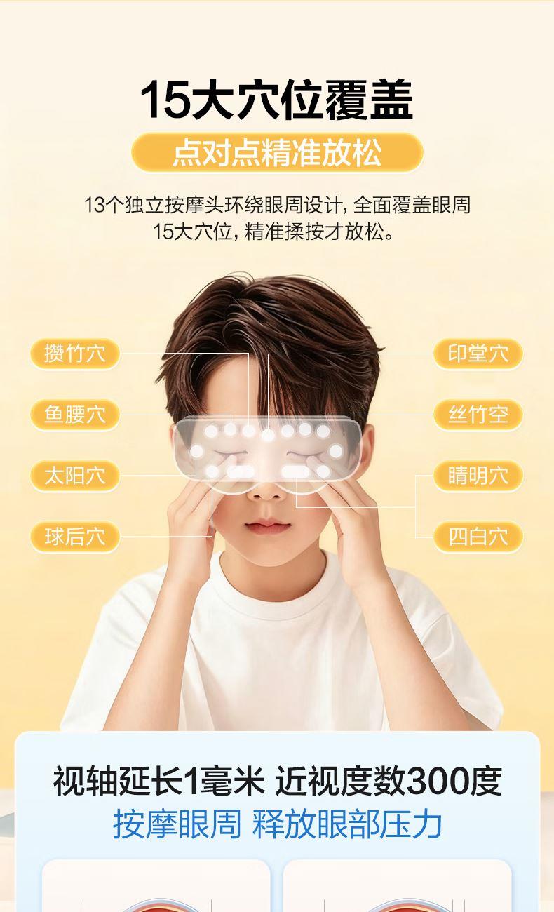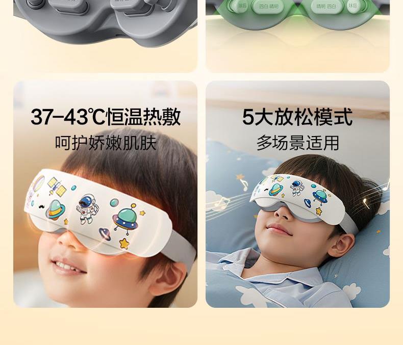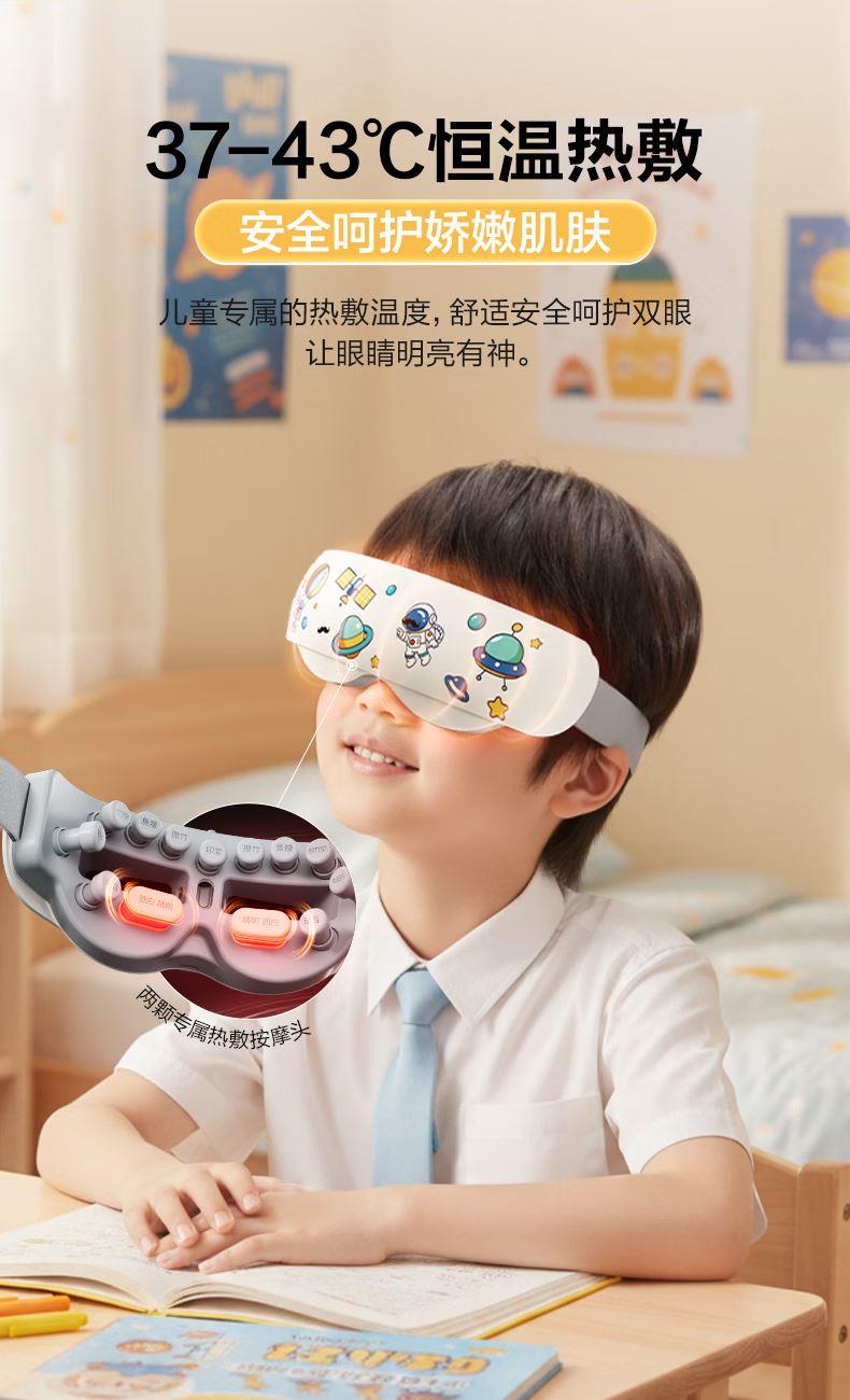 档位调节:五档调节 额定功率:10W 额定电压:5V 供电方式:Type-C 操控方式:按键式 功能:温感热敷 多模式按摩 按摩手法:点震按摩 包装清单:主机+充电线+使用说明书(含保修卡)+注水器*1+贴纸*2 专为儿童设计,科学保护眼视力 舒压+润眼+视训,三效合一,实力护眼 15大穴位覆盖,点对点精放松 模拟真人揉按手法,眼健操自动做 动态灯光视训,多方位锻炼眼肌