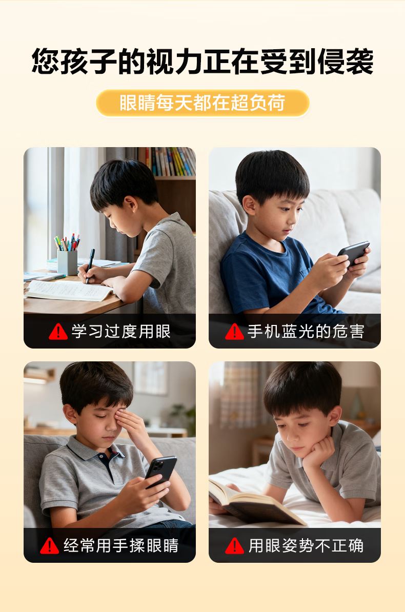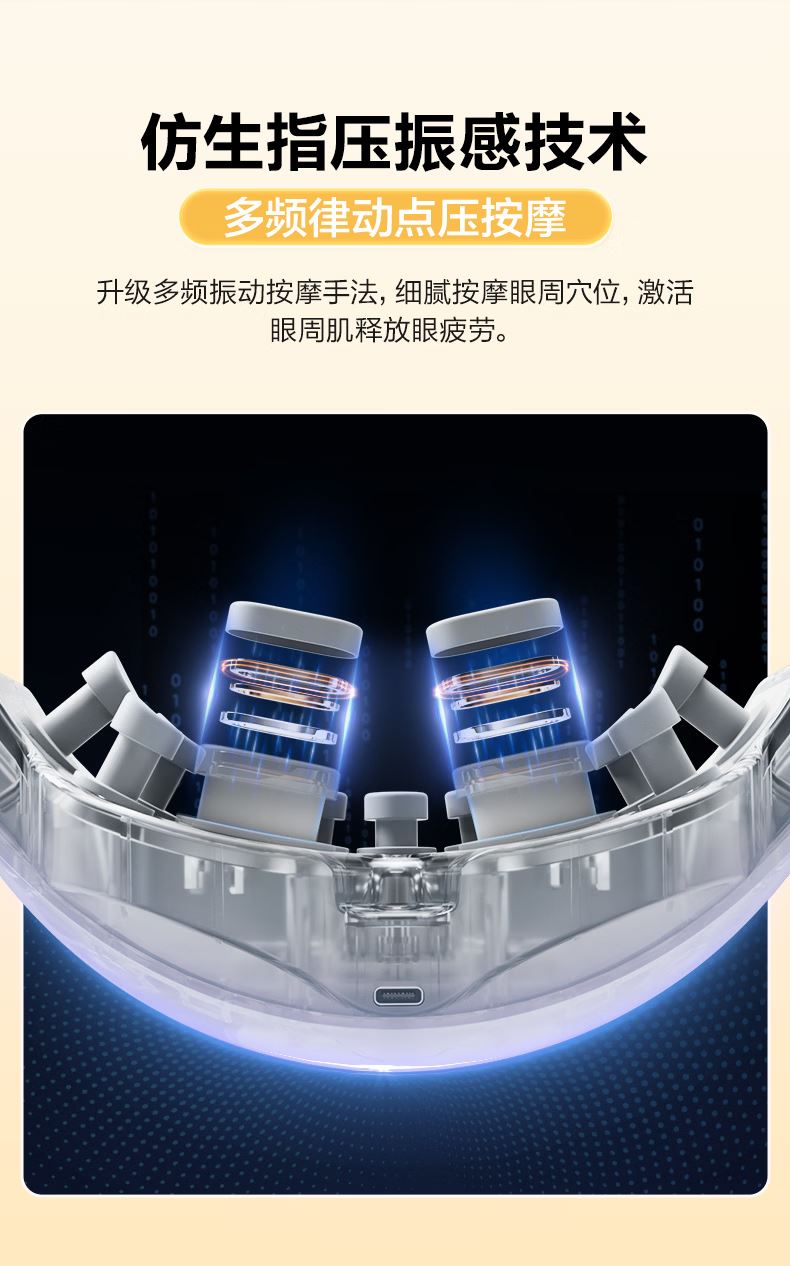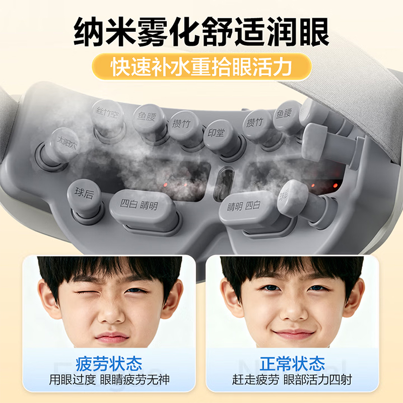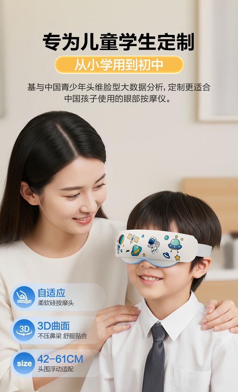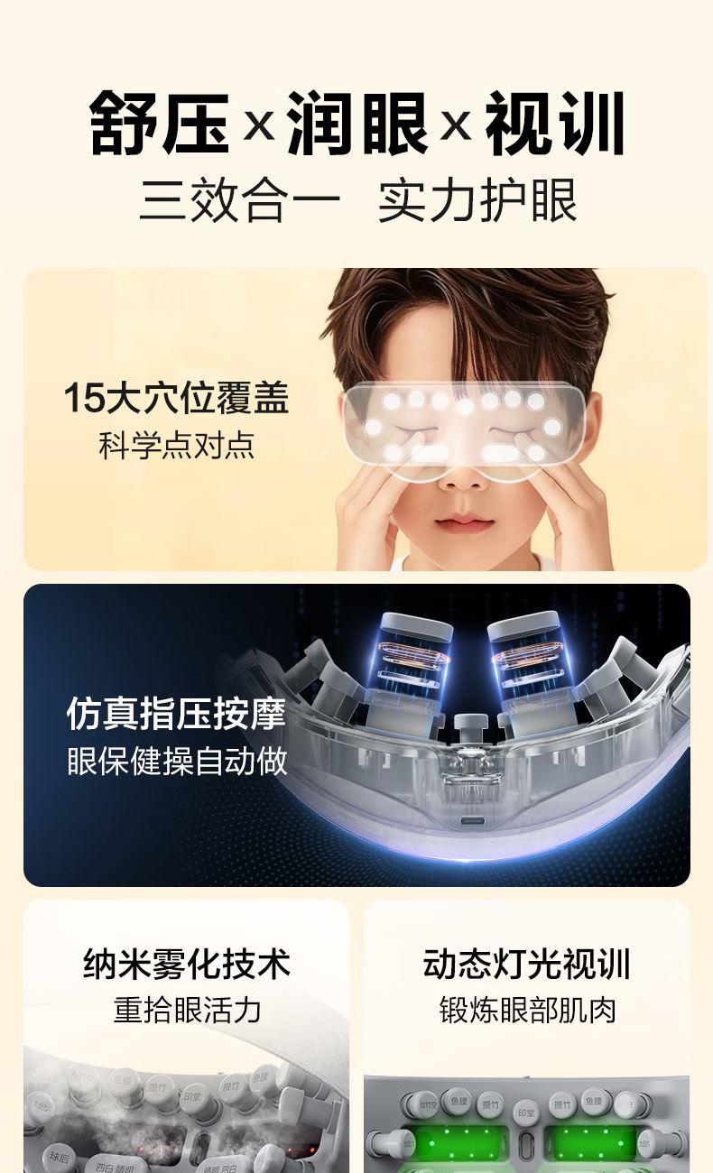 档位调节:五档调节 额定功率:10W 额定电压:5V 供电方式:Type-C 操控方式:按键式 功能:温感热敷 多模式按摩 按摩手法:点震按摩 包装清单:主机+充电线+使用说明书(含保修卡)+注水器*1+贴纸*2 专为儿童设计,科学保护眼视力 舒压+润眼+视训,三效合一,实力护眼 15大穴位覆盖,点对点精放松 模拟真人揉按手法,眼健操自动做 动态灯光视训,多方位锻炼眼肌