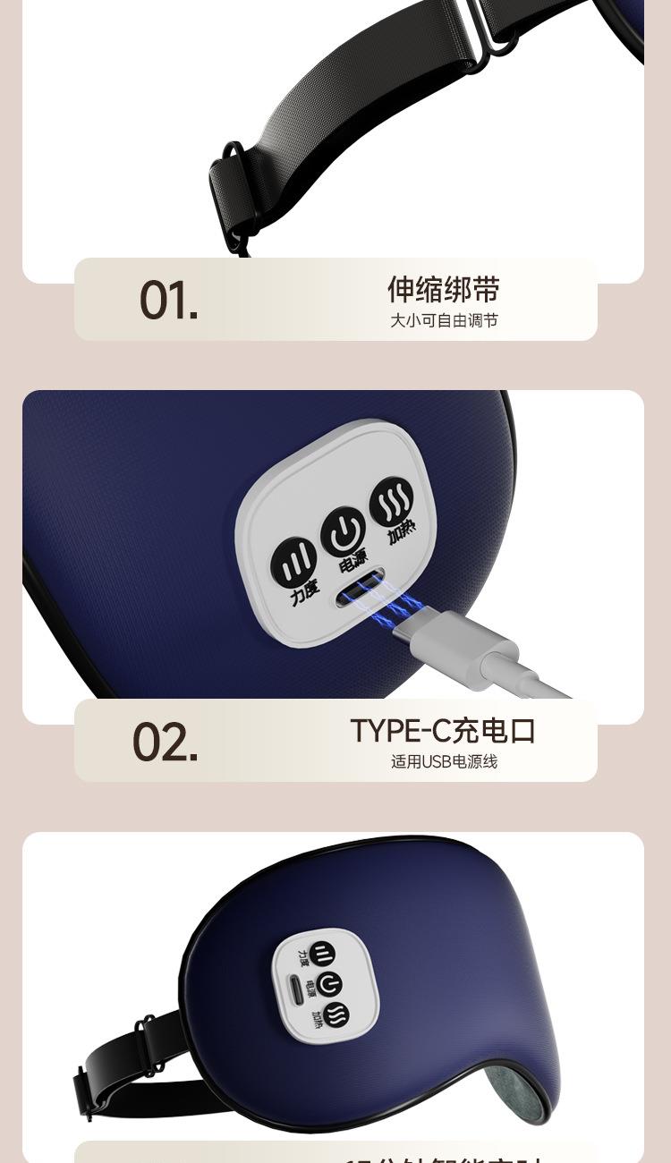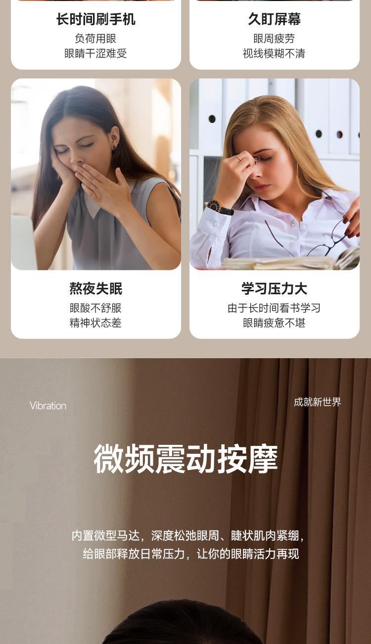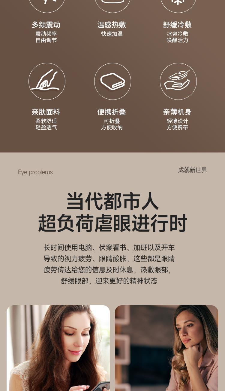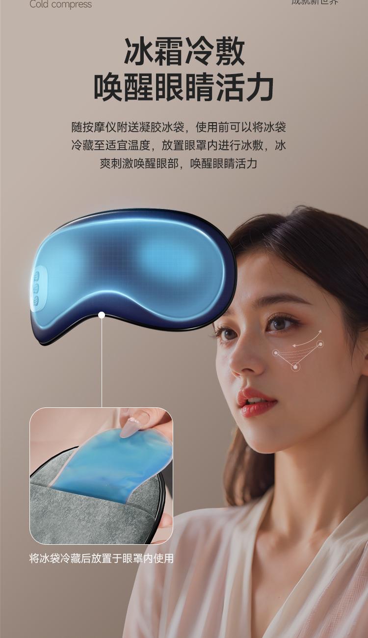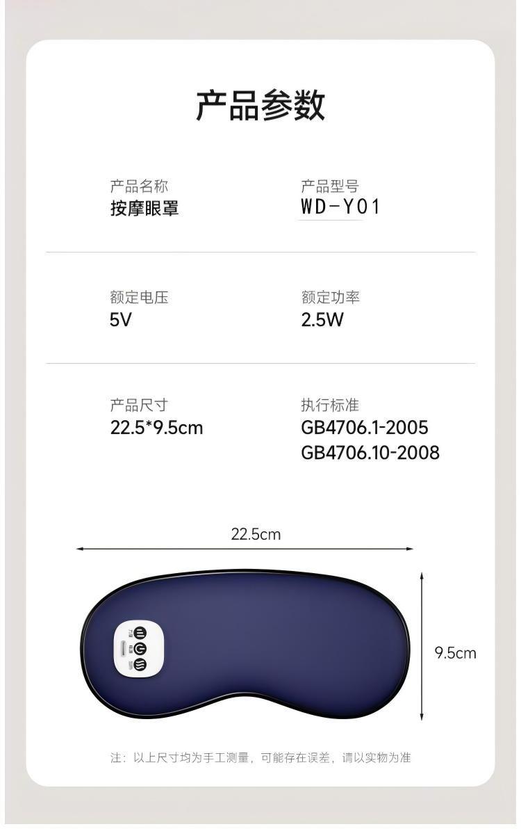型号:WD-Y01 电压:5V 功率:2.5W 电池:900mA 按摩热敷冷敷遮光多功能合一 亲肤透气层让眼部自在“深呼吸 42°恒温热敷唤醒双眼活力 冰霜冷敷唤醒眼睛活力 舒适遮光,V形波纹更贴合眼部 无线束缚让眼部变得随心所欲