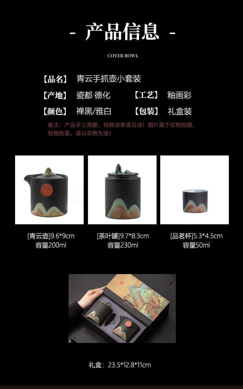 云舒套装配置:手抓壶*1,茶叶罐*1,品茗杯*2, 手抓壶:9.6*8.5cm,容量 200ml, 茶叶罐:9.7*8.3cm,容量230ml, 品茗杯:5.3*4.5cm,容量50ml。 青云套装配置:手抓壶*1,茶叶罐*1,品茗杯*2, 手抓壶:9.6*9cm,容量 200ml, 茶叶罐:9.7*8.3cm,容量230ml, 品茗杯:5.3*4.5cm,容量50ml。 包装:礼盒装。