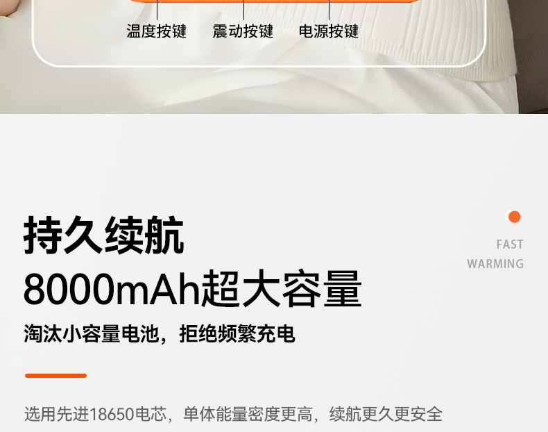 主打艾灸热敷 【大面积热敷】:石墨烯发热片 5秒速热,发热面积高达21000mm²,腰部全覆盖,此款升级腰部、腹部都有发热效果。 【药草滋养】:陈艾红花 艾灸熏蒸,暖腰祛湿 【高频震动】:高频震动马达7000转/分,三档模式,多重享受 【超长续航】:8000毫安超大容量,无需频繁充电。