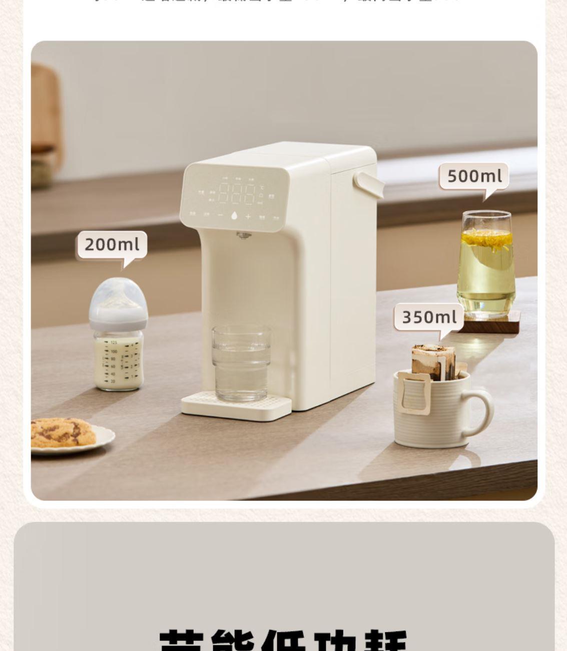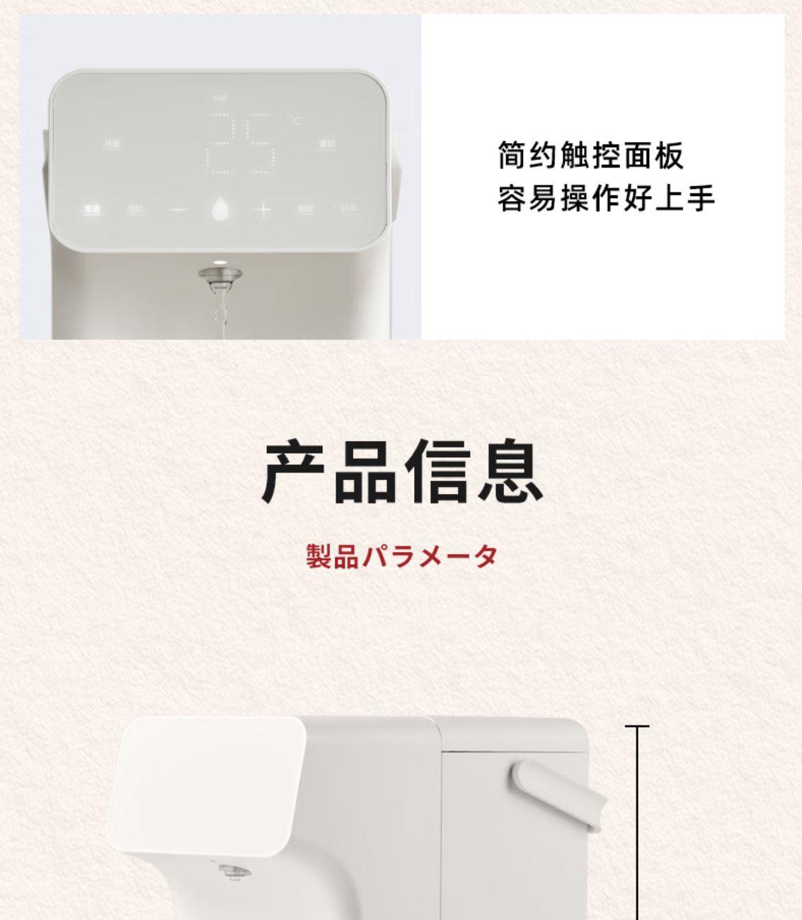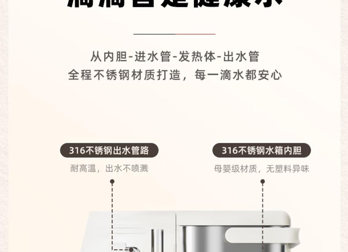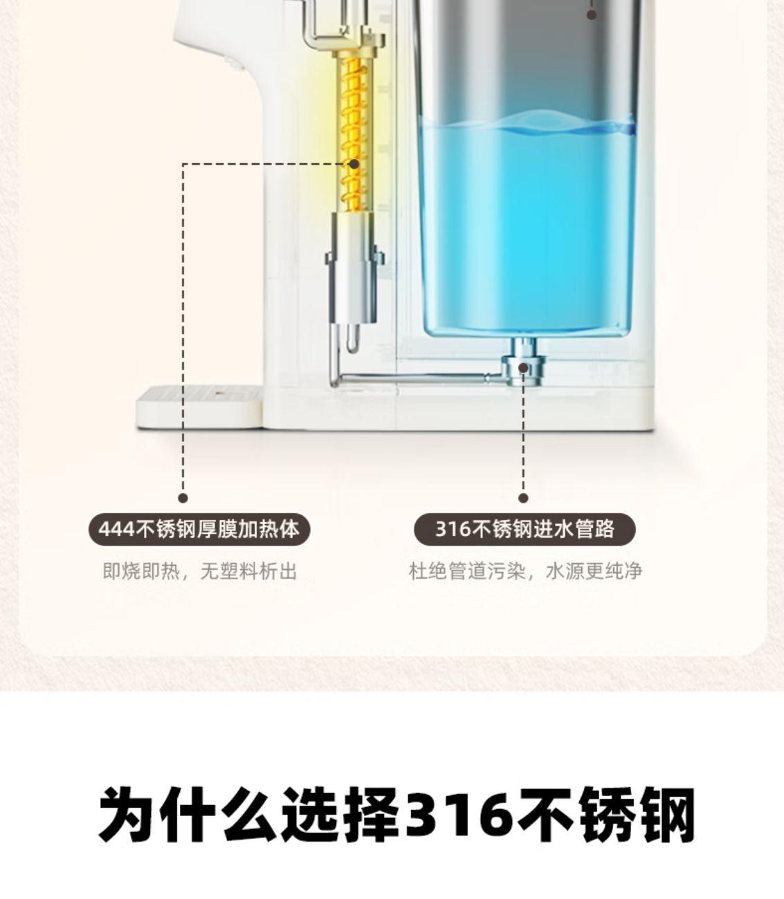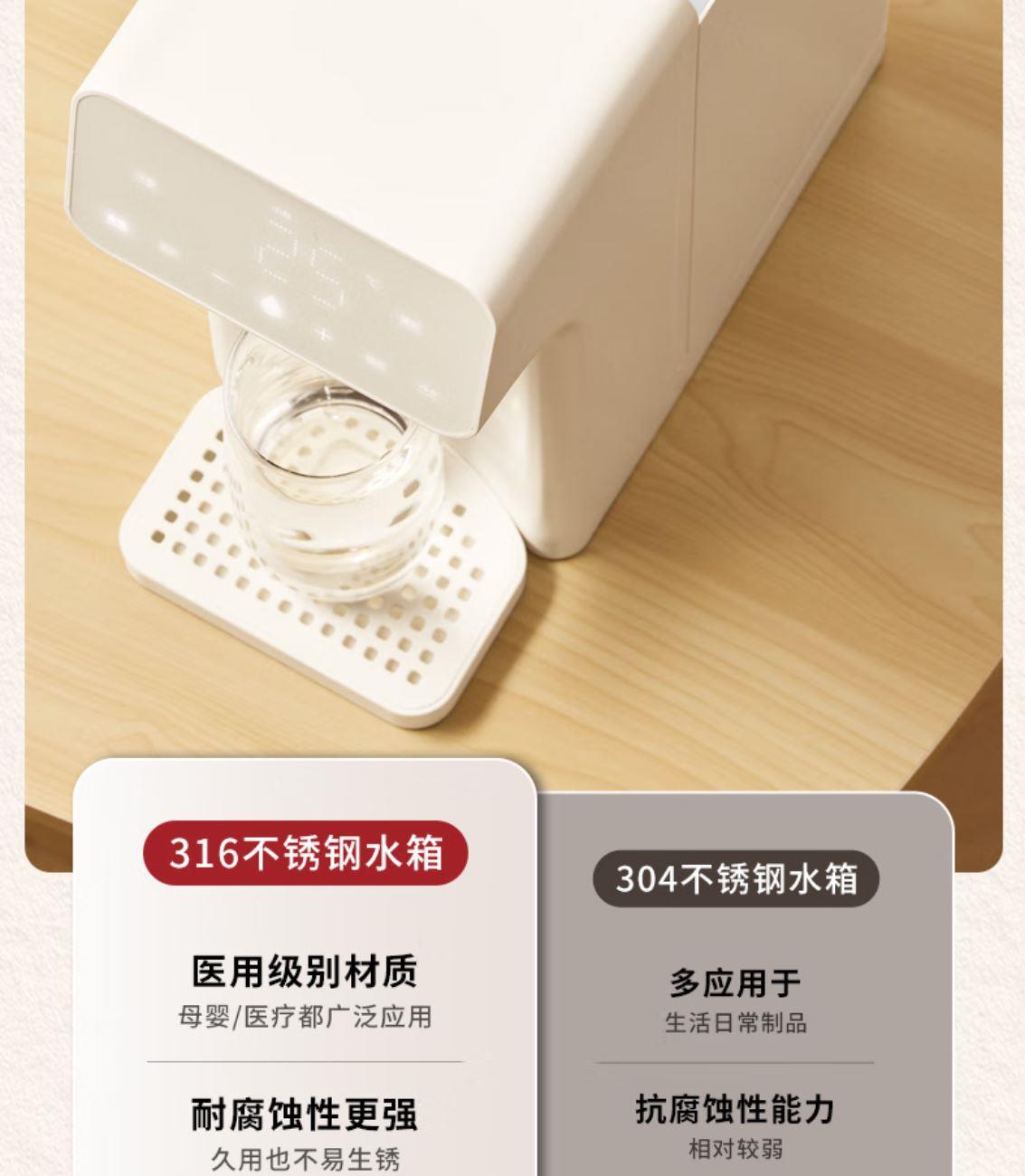 316L不锈钢,母婴级安心水箱 全水路食品级无双酚 A 多段定温模式、±1℃可调节 水路安全、食品级材质、 0异味,0双酚A 柔光夜晚氛围灯 定量取水、轻音制水 即热式节能低耗 产品重量:约 1.6kg 额定电压:220V~ 额定频率:50Hz 额定功率:2000W 产品尺寸:160*150*47mm