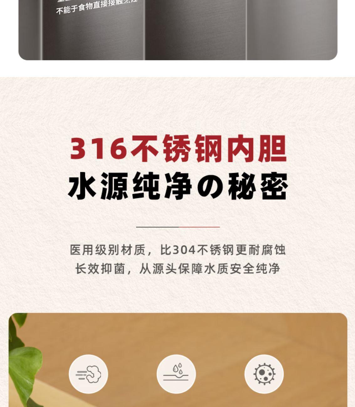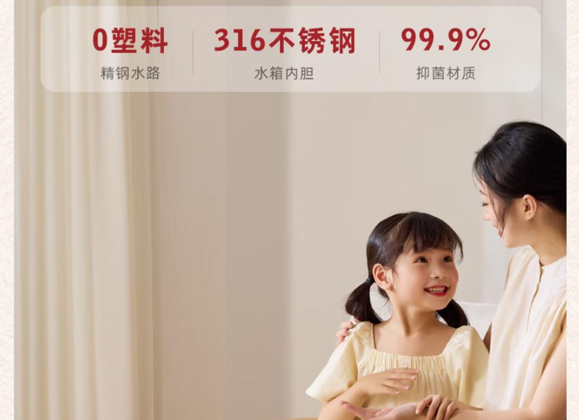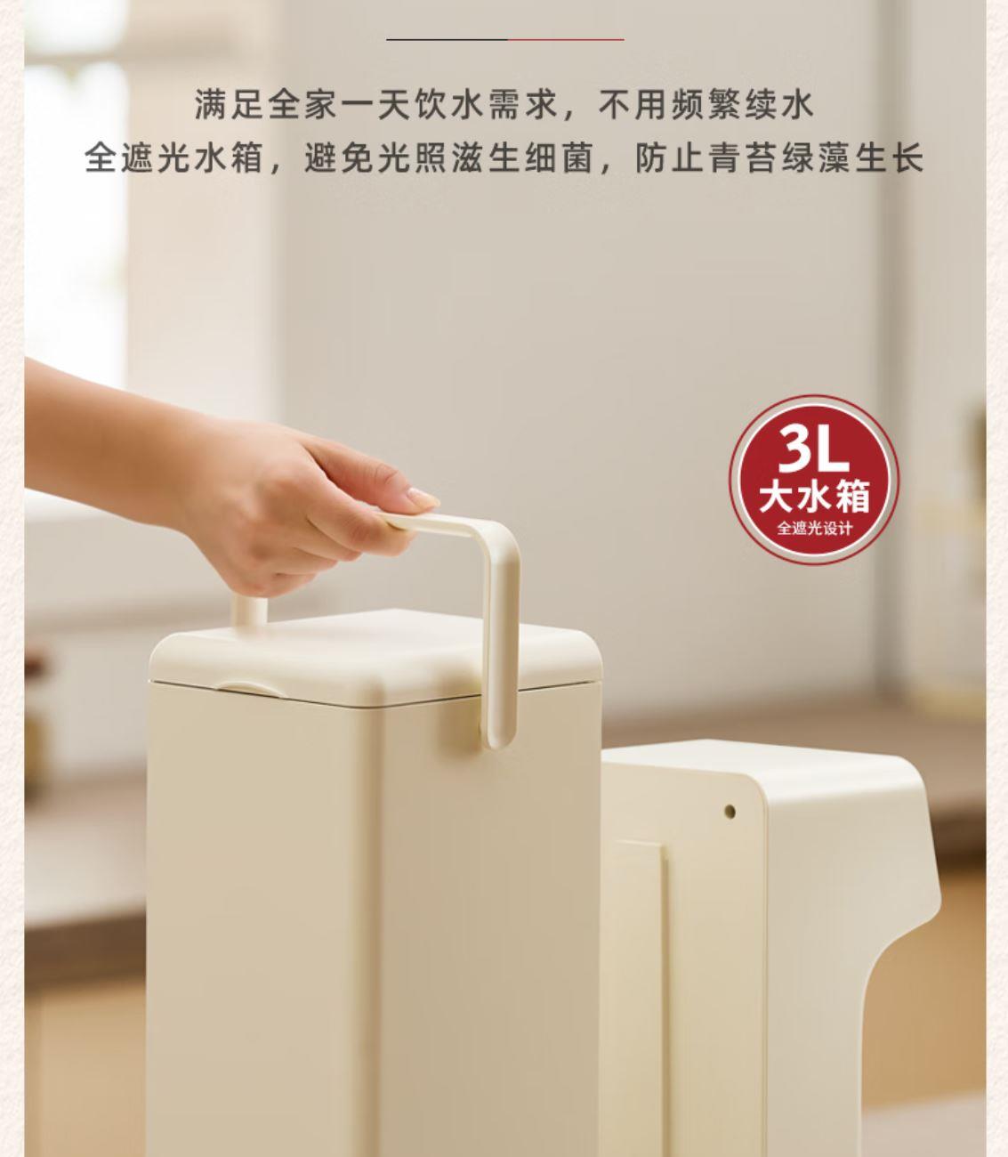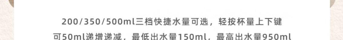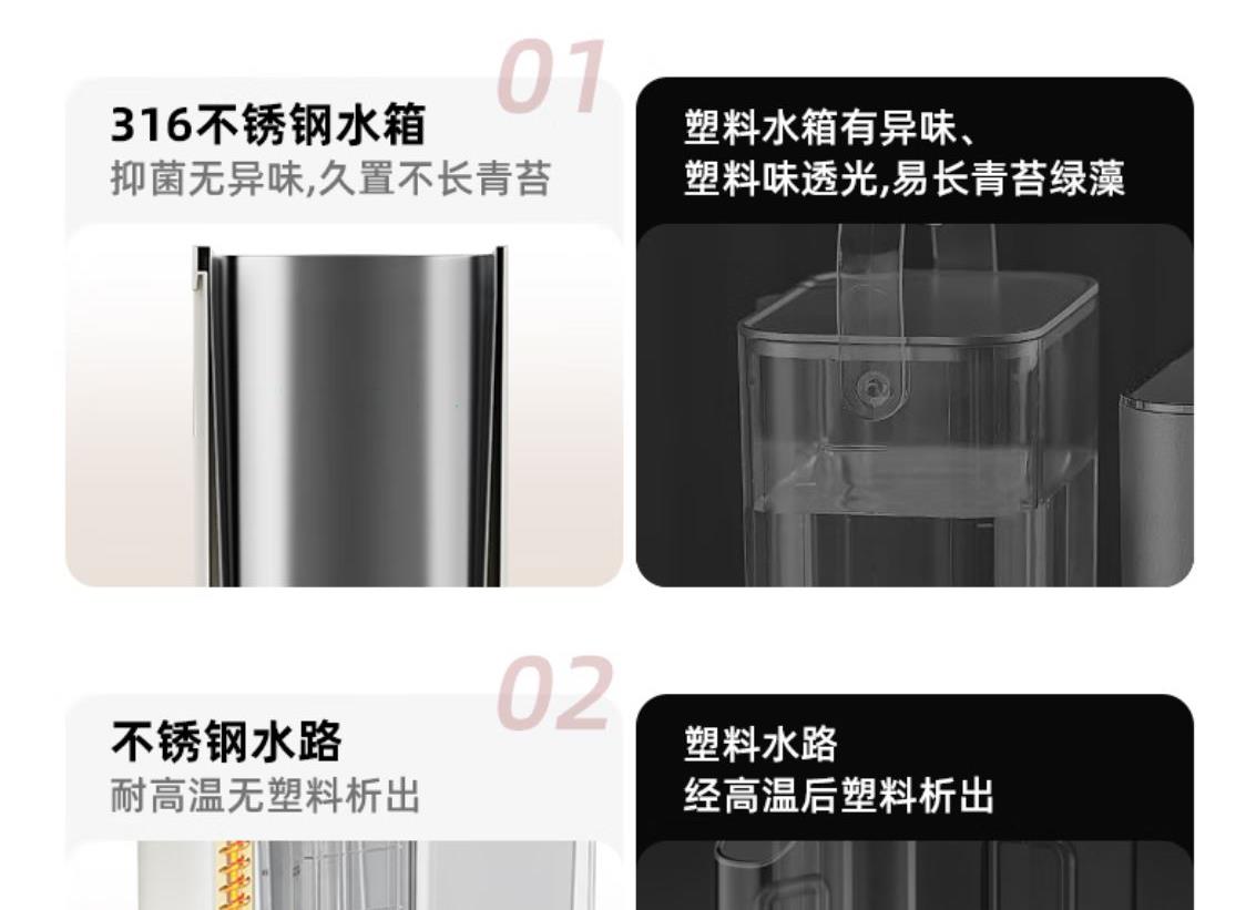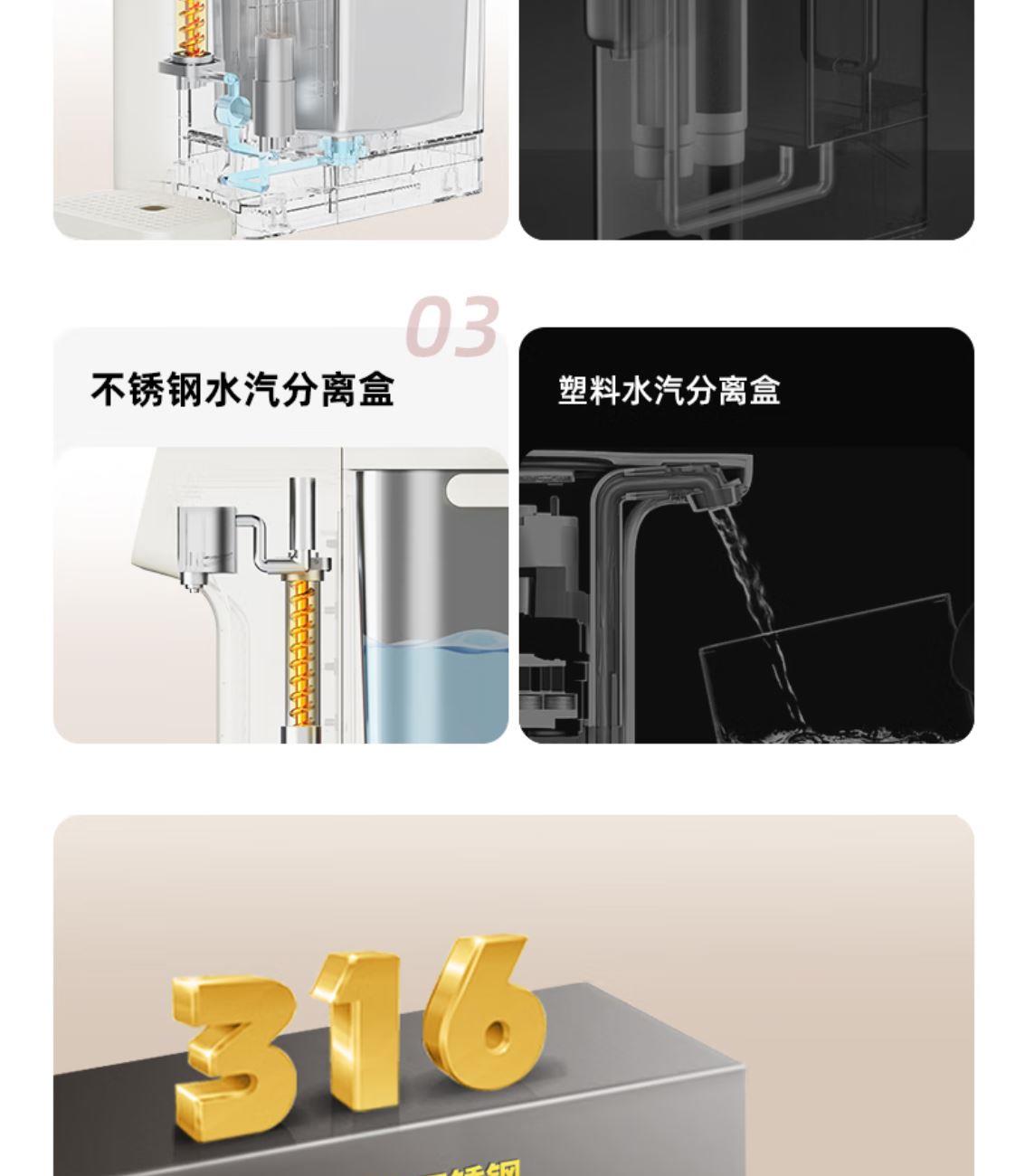 316L不锈钢,母婴级安心水箱 全水路食品级无双酚 A 多段定温模式、±1℃可调节 水路安全、食品级材质、 0异味,0双酚A 柔光夜晚氛围灯 定量取水、轻音制水 即热式节能低耗 产品重量:约 1.6kg 额定电压:220V~ 额定频率:50Hz 额定功率:2000W 产品尺寸:160*150*47mm