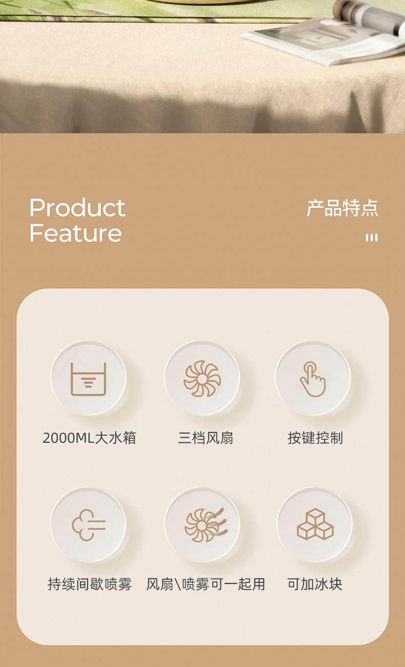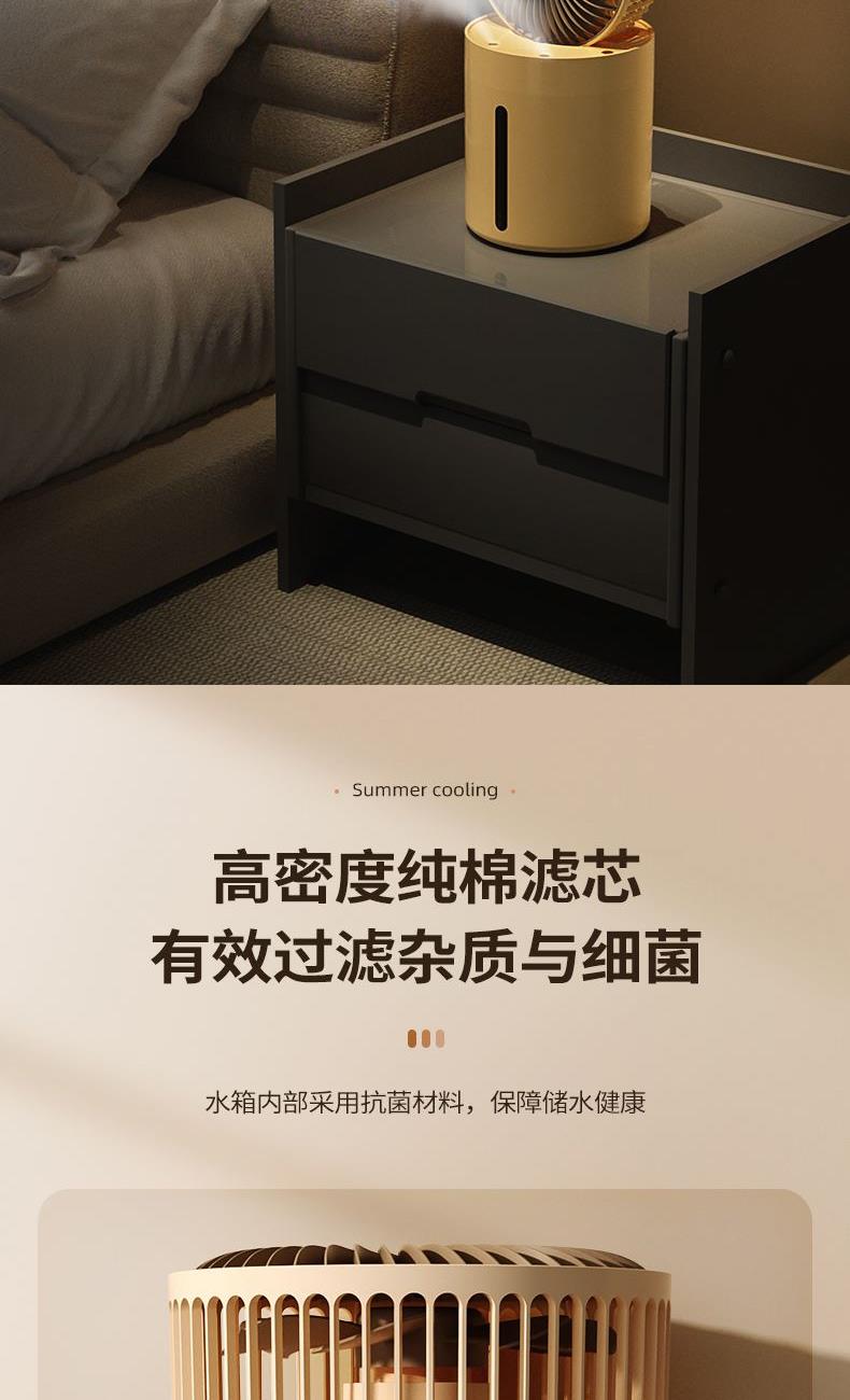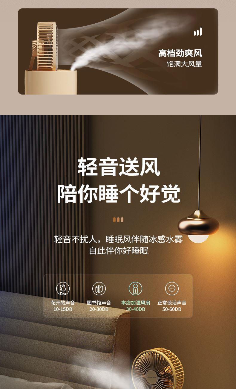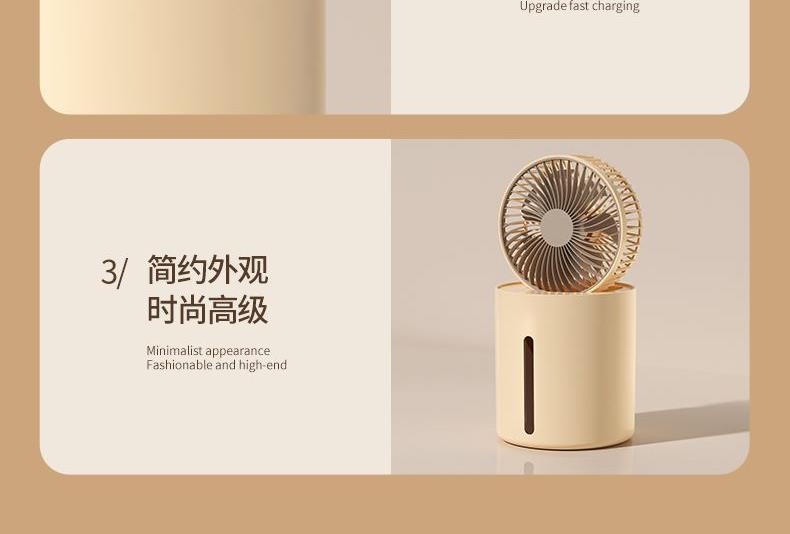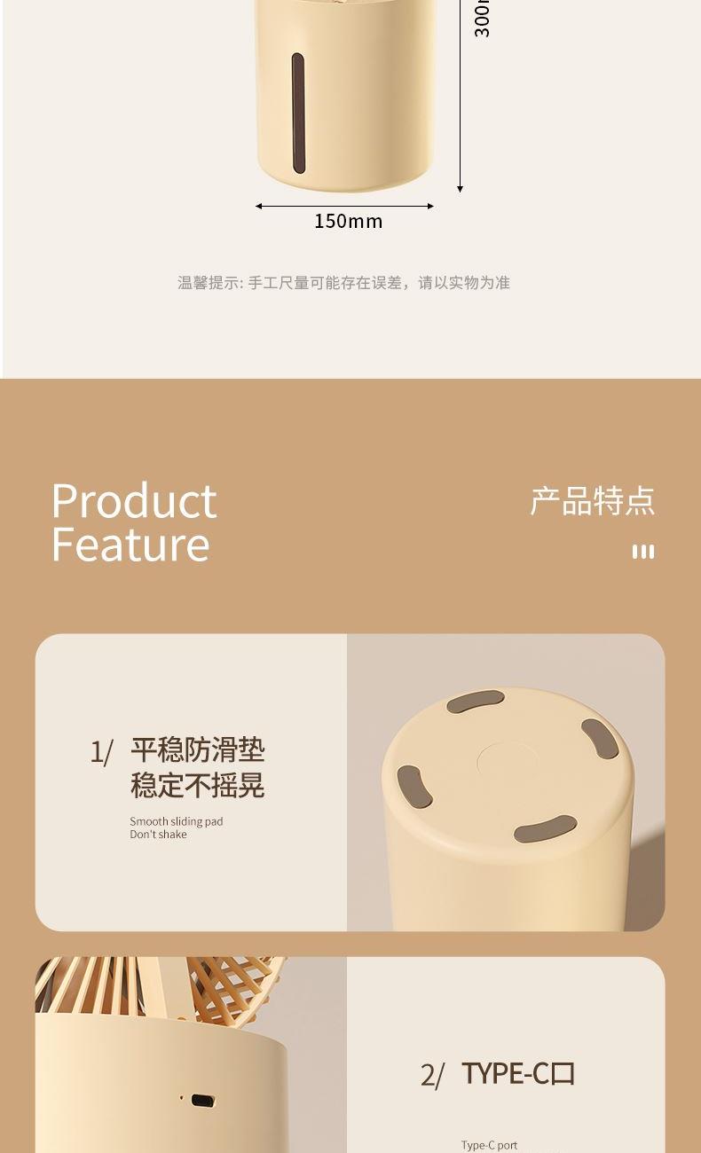 100ML/h加湿量速润全屋 2L容量水箱,满足长时间加湿 3档风力调节,照顾不同人群 缺水自动断电保护 轻音电机,安静不打扰 可折叠设计,方便收纳 扇头多角度变换,满足各种需求 产品材质:ABS 电压/功率 : 5V ==8.5W 供电方式 : Type-C接口 加湿量 : 60-100ML/h 水箱容量 : 2000ML 产品净重:600g 产品尺寸:150*150*295mm 彩盒尺寸:160*160*230mm 数量/箱:30台 外箱尺寸:830*350*730mm
