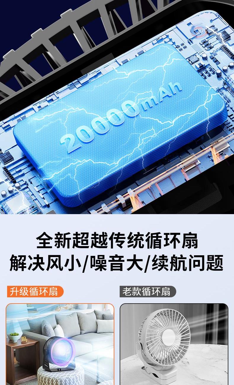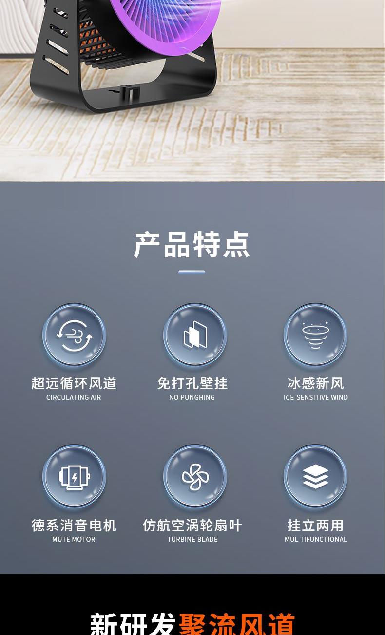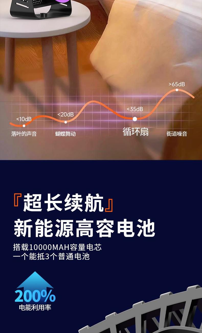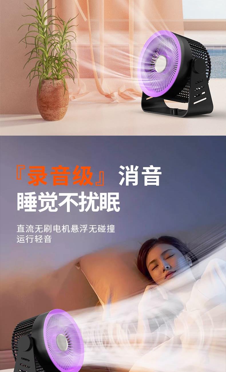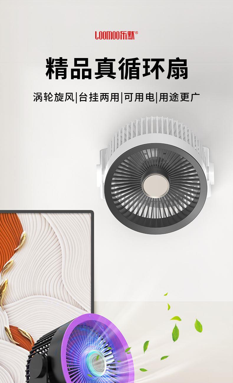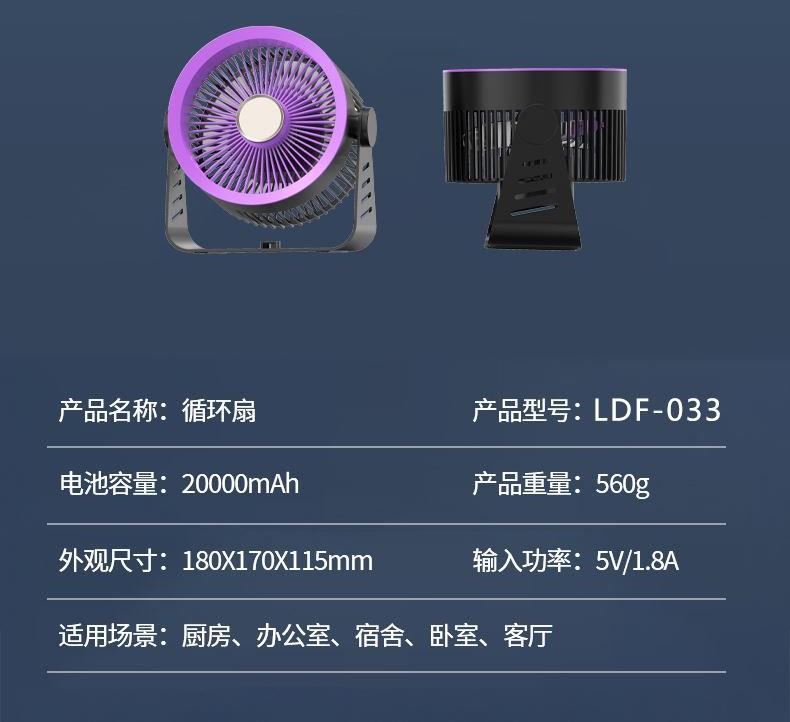 型号: LDF-033 材质:PP+ABS+电子原件 电池类型:锂离子电池 电池容量:2400mAh 输入功率:5V-1.8A 额度功率:1.5W 档位调节:五档风速 颜色:黑色、灰色 精品真循环扇涡轮旋风、台挂两用、新研发聚流风道,超远大面积送风黑科技,进口消音电机,悬浮无碰撞运行更轻音;五档风力调节,无电机的嗡鸣声和震动,让你安心入睡。