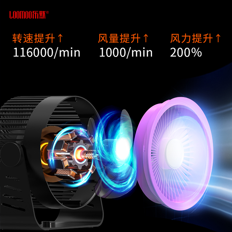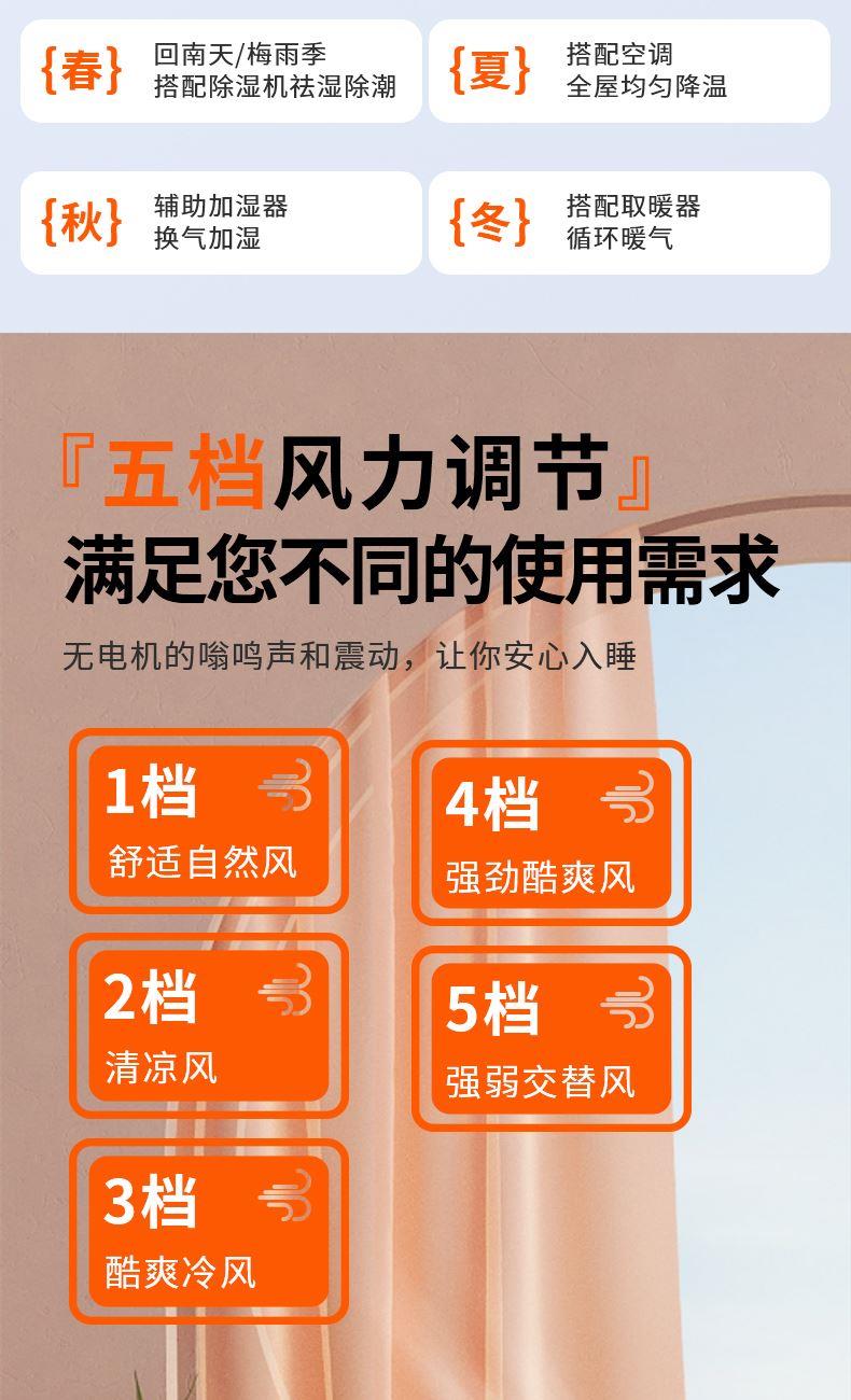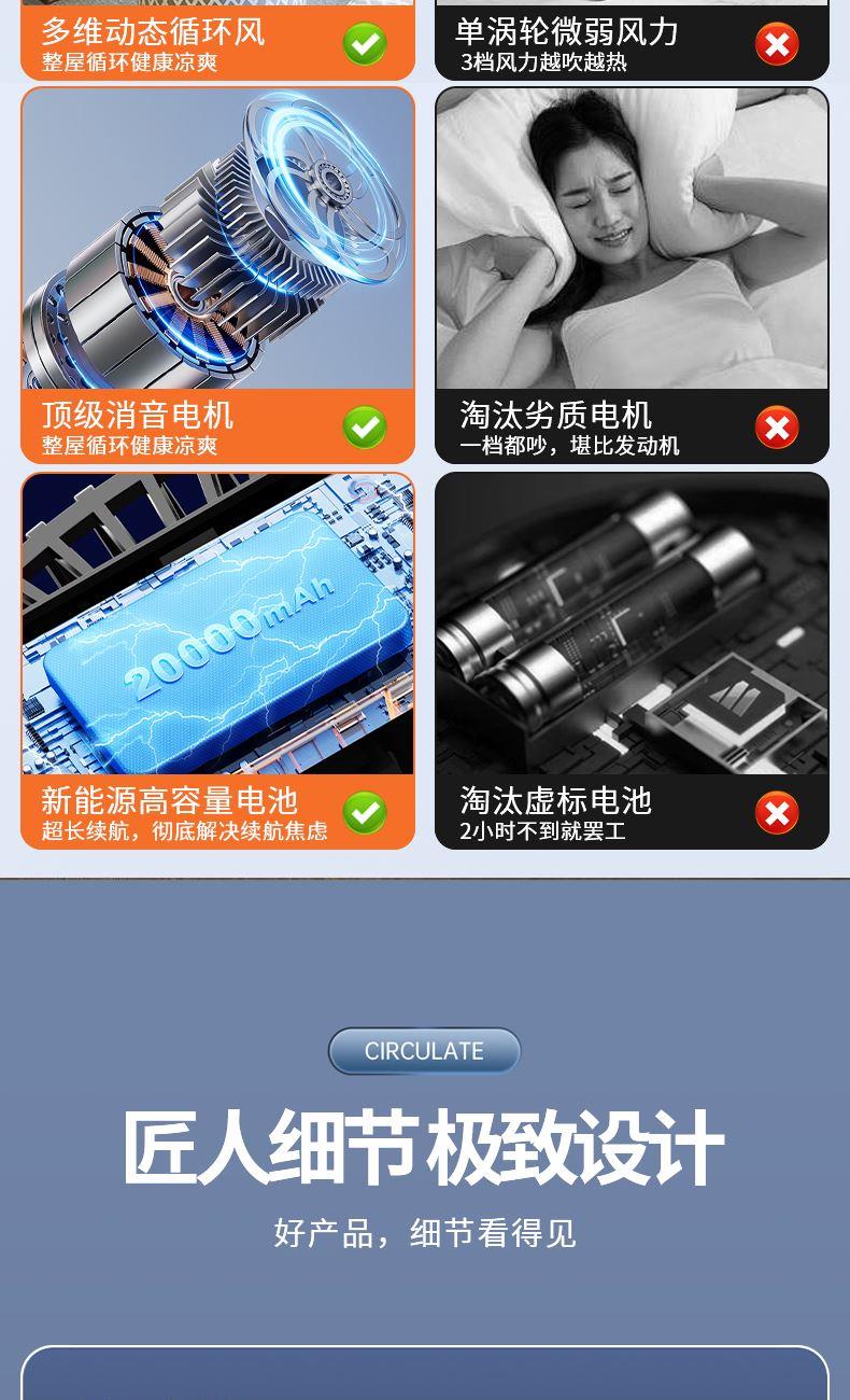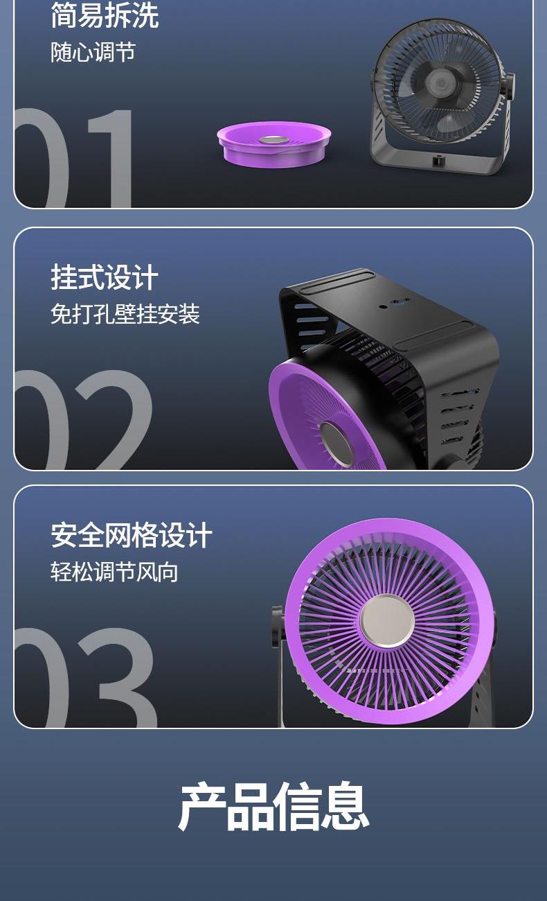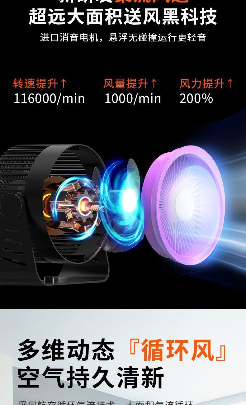 型号: LDF-033 材质:PP+ABS+电子原件 电池类型:锂离子电池 电池容量:2400mAh 输入功率:5V-1.8A 额度功率:1.5W 档位调节:五档风速 颜色:黑色、灰色 精品真循环扇涡轮旋风、台挂两用、新研发聚流风道,超远大面积送风黑科技,进口消音电机,悬浮无碰撞运行更轻音;五档风力调节,无电机的嗡鸣声和震动,让你安心入睡。