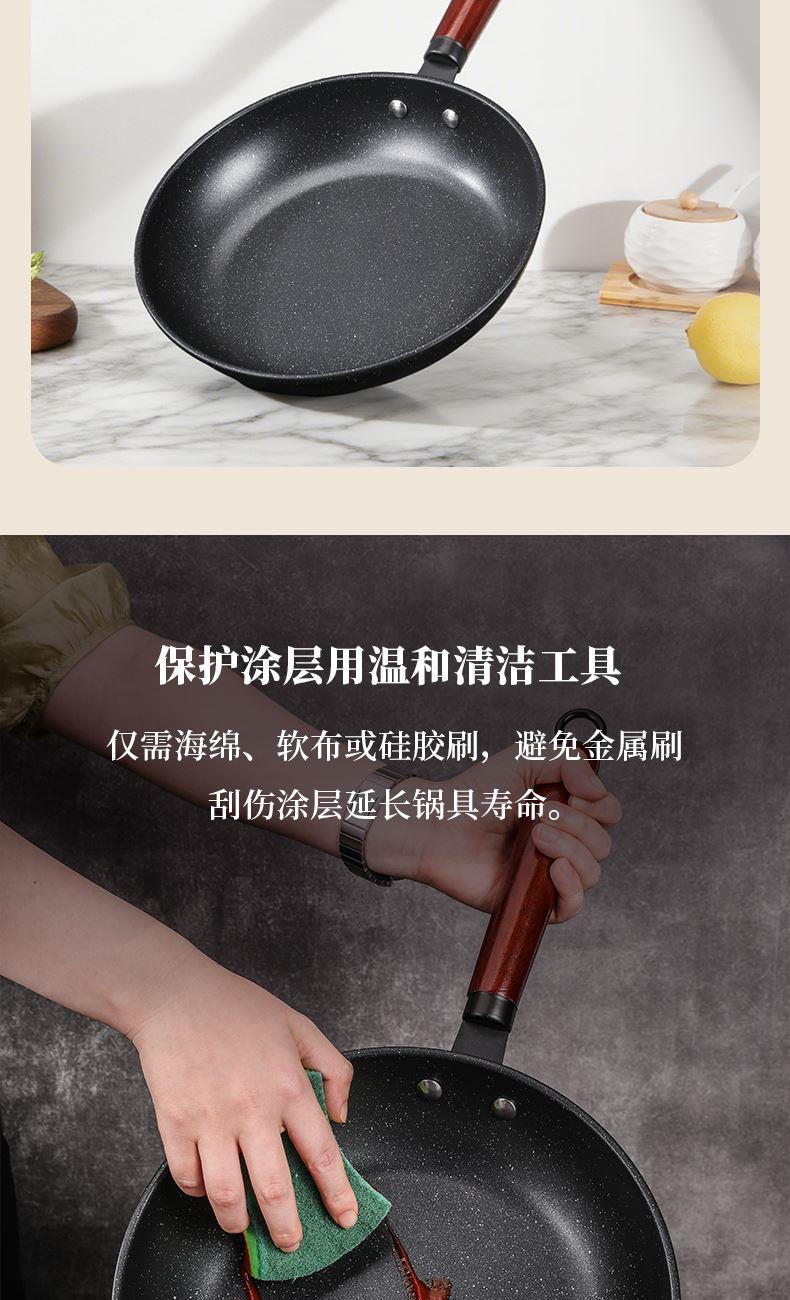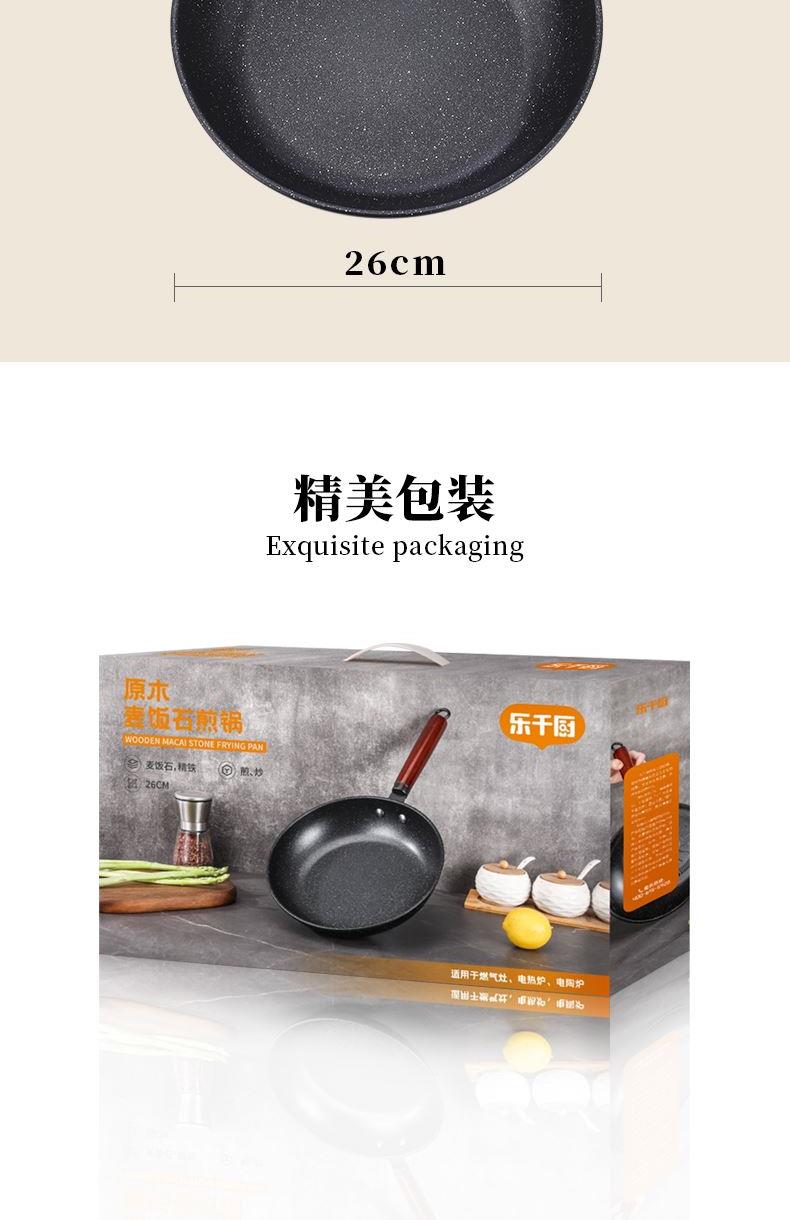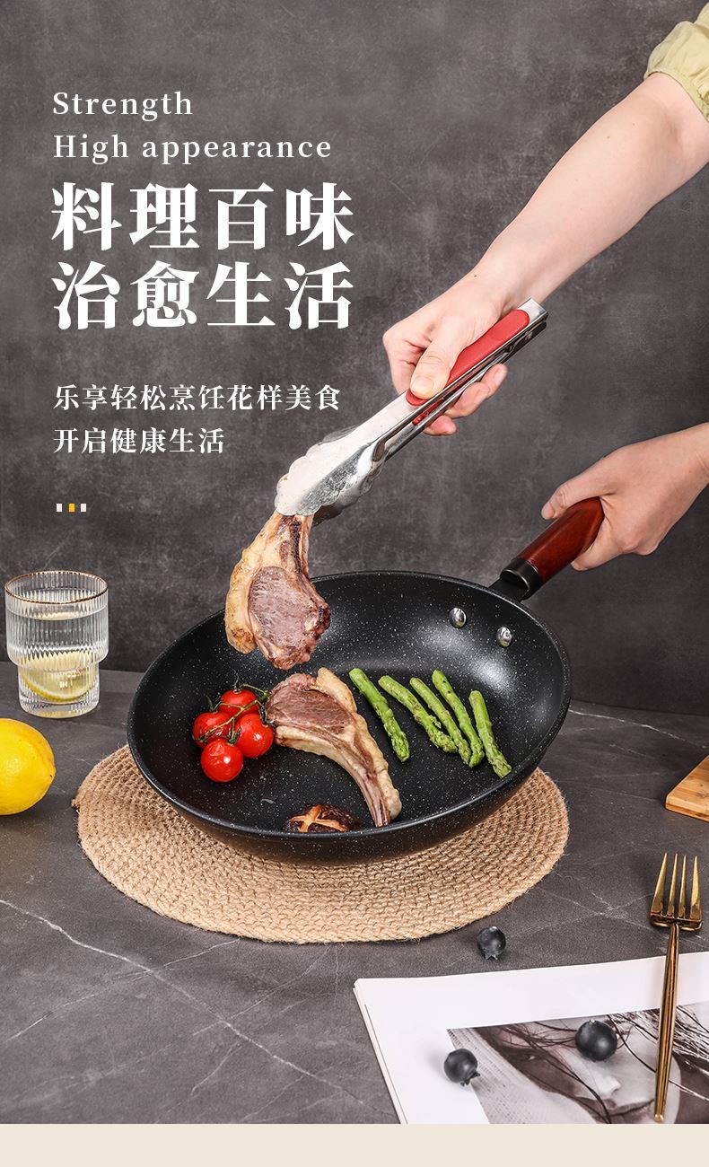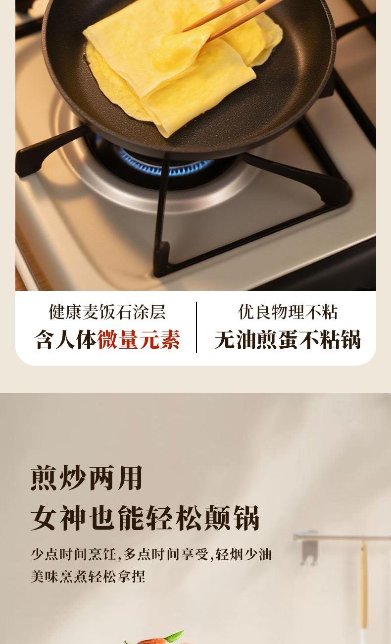 规 格:26cm煎锅 产品材质:优质精铁 适用灶具:煤气明火,电陶炉 包装尺寸:L27.8*W7.8*H47.5CM 1、采用麦饭石工艺以及优质精铁打造锅身,采用耐高温不沾涂层工艺,油烟少,不粘效果强。 2、煎牛排、煎蛋、煎鱼;煎炒两用,功能强大。