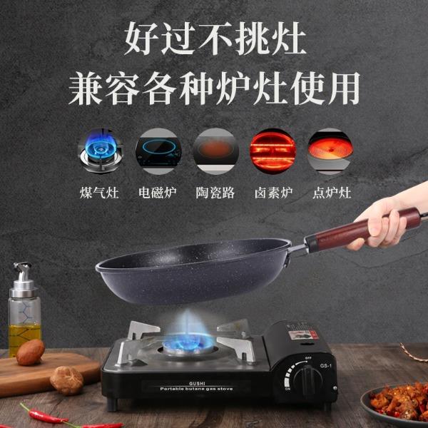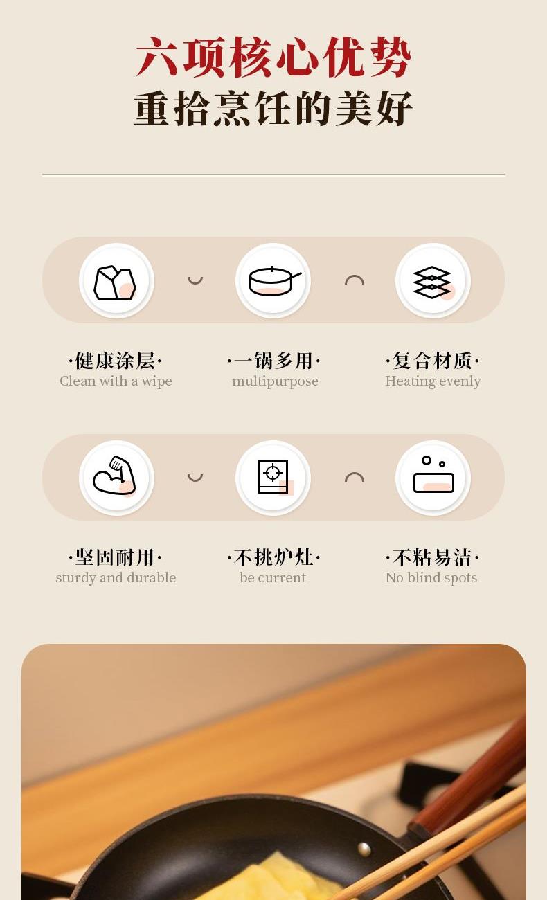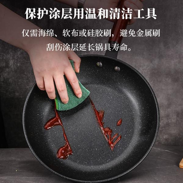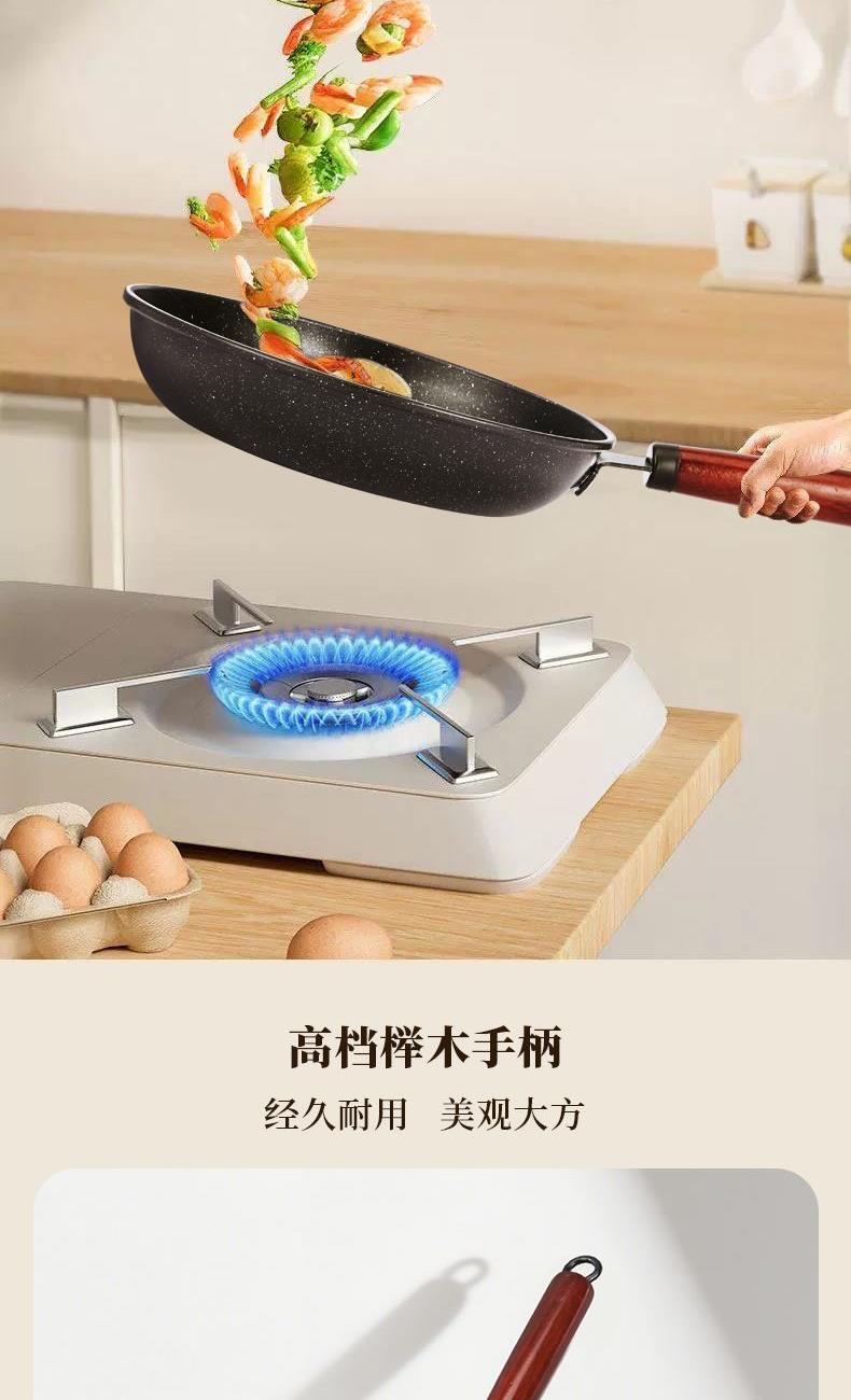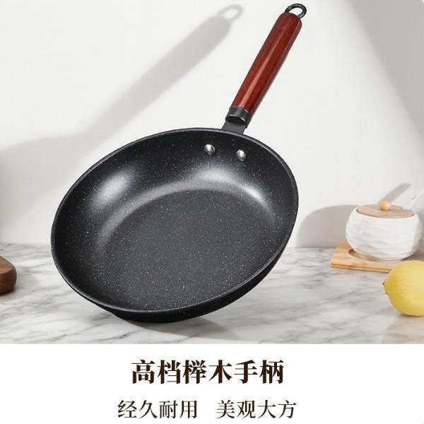 规 格:26cm煎锅 产品材质:优质精铁 适用灶具:煤气明火,电陶炉 包装尺寸:L27.8*W7.8*H47.5CM 1、采用麦饭石工艺以及优质精铁打造锅身,采用耐高温不沾涂层工艺,油烟少,不粘效果强。 2、煎牛排、煎蛋、煎鱼;煎炒两用,功能强大。