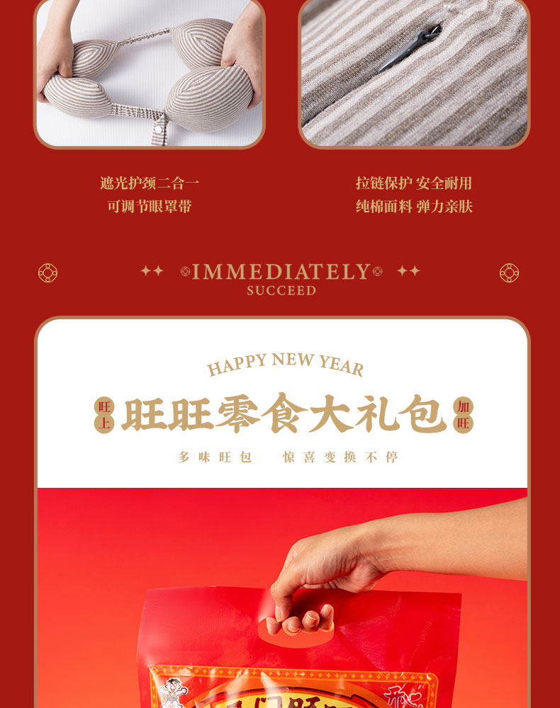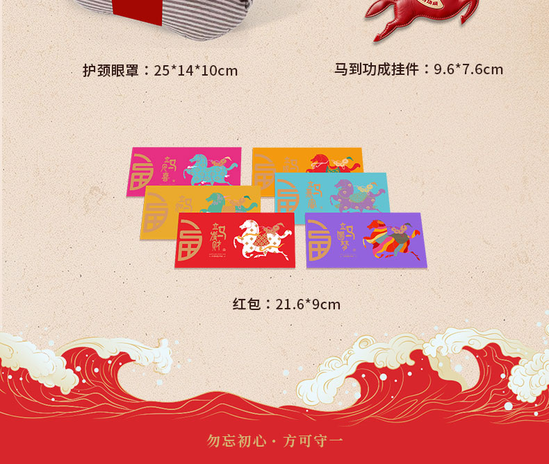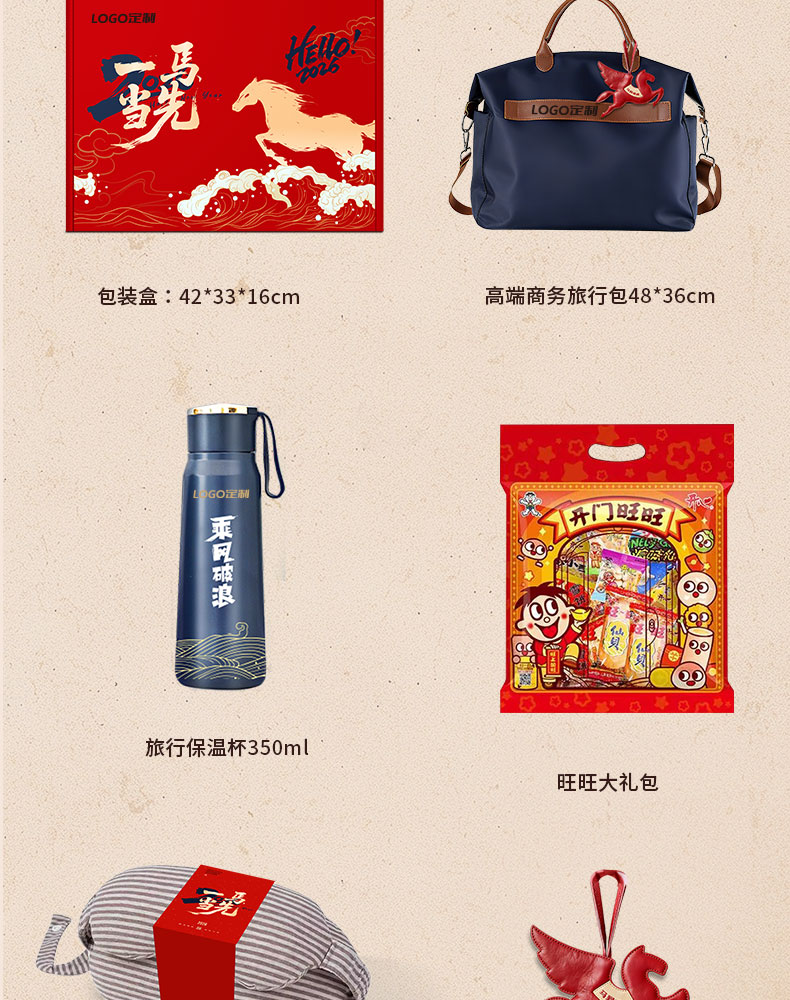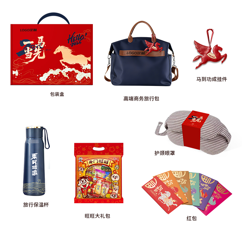 1.商务旅行包装 2.专属飞马钥匙扣挂于 3.乘风破浪保温杯 4. 多功能呵护眼罩与枕颈 5.旺旺大礼包 6. 6个红包藏满新年期