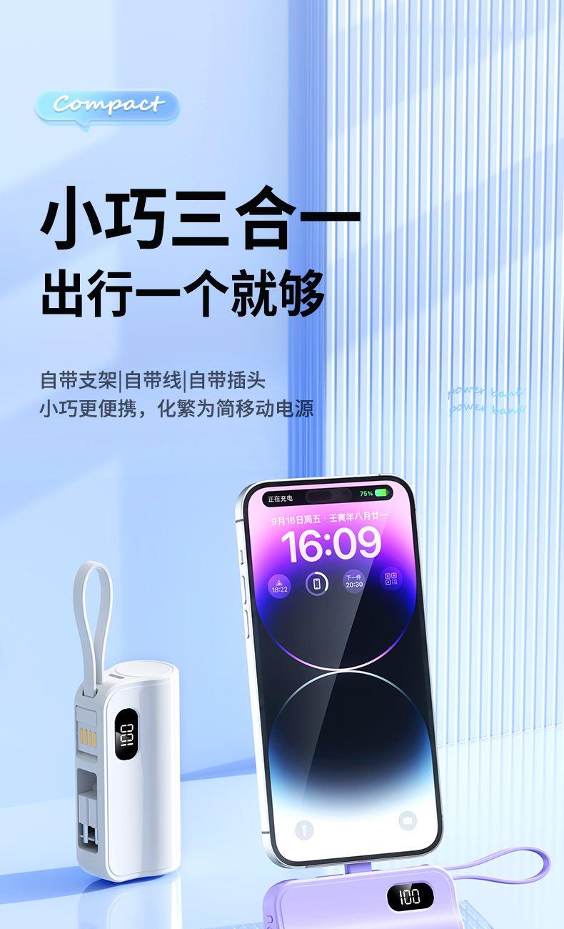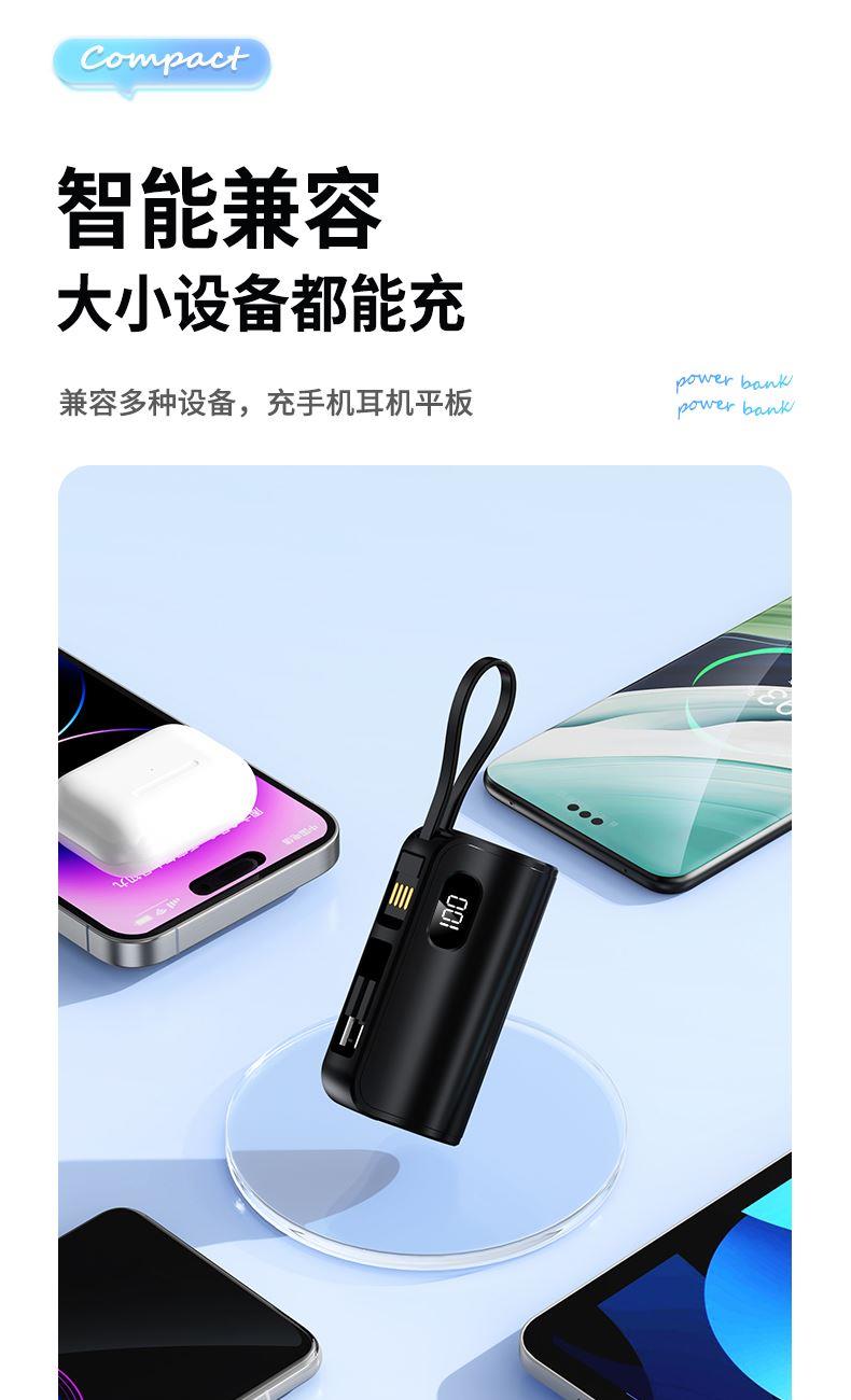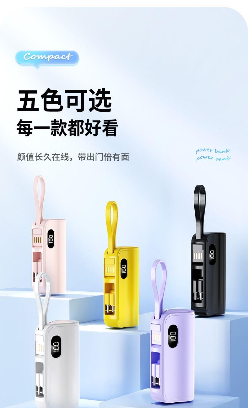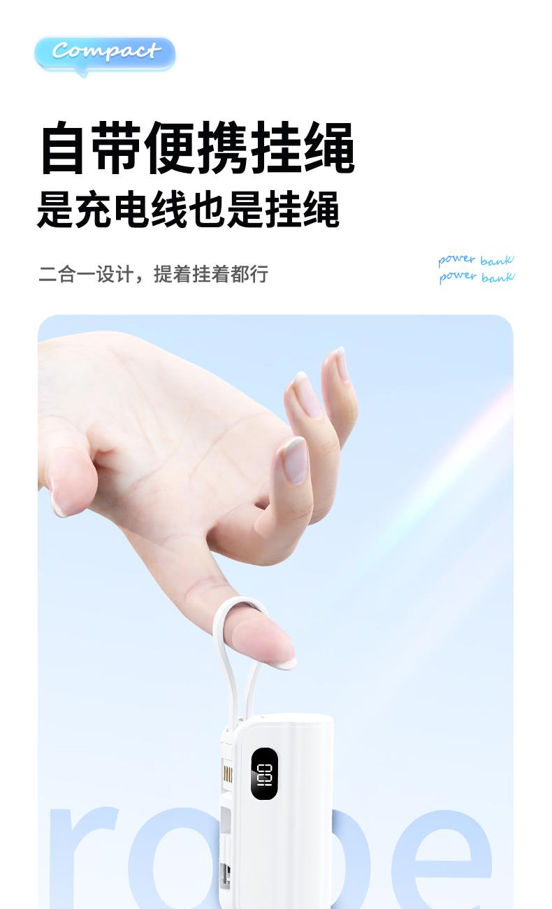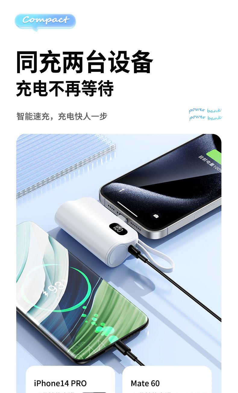 口袋胶囊自带线移动电源K13 型 号: K13 电池 :21700*1pcs 电池类型 :21700电芯 容量:5000mAh 材质 :ABS+PC 尺寸 :78*47*25MM 功能特点 仅口红般大小,精巧玲珑; 5000毫安容量,应急高手,保证顺畅沟通; 自带苹果接口和Type-c尾插接口,带USB充电线,各种机型轻松应对