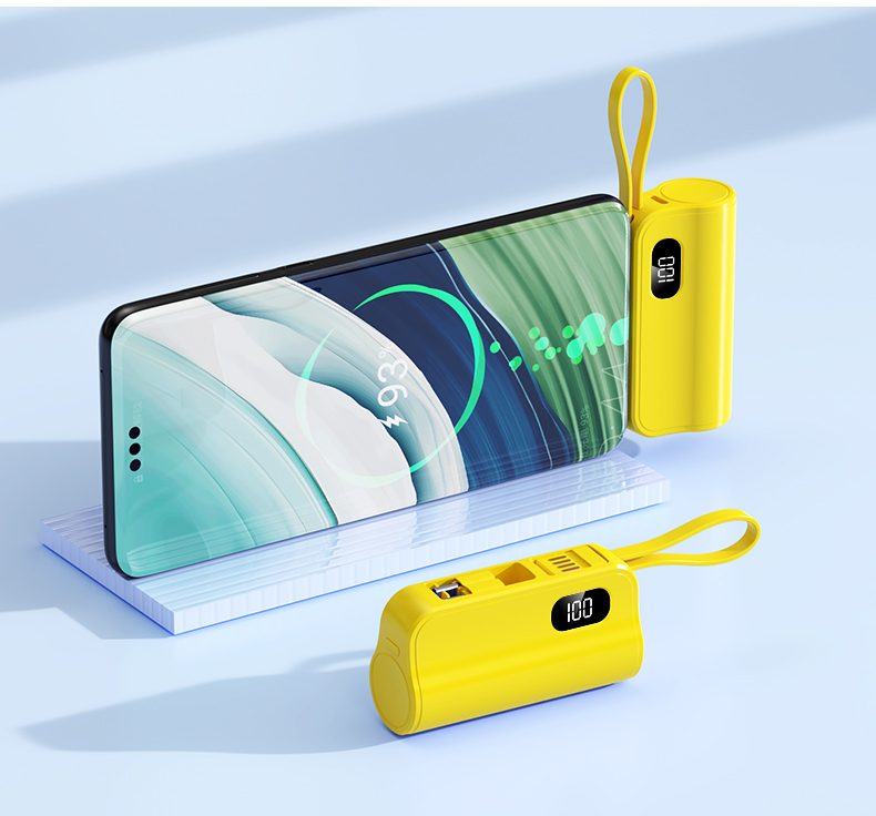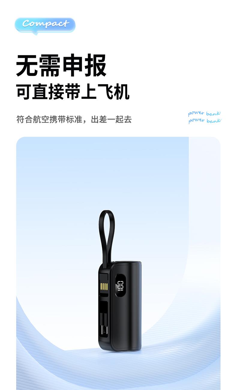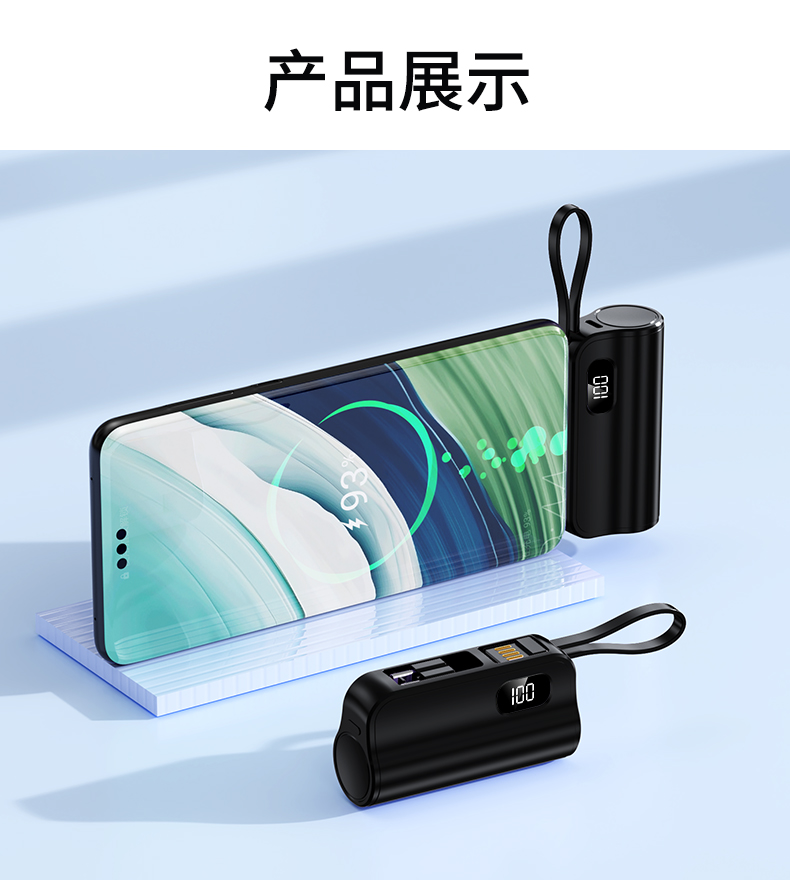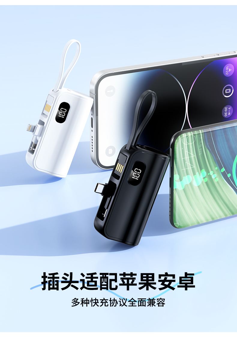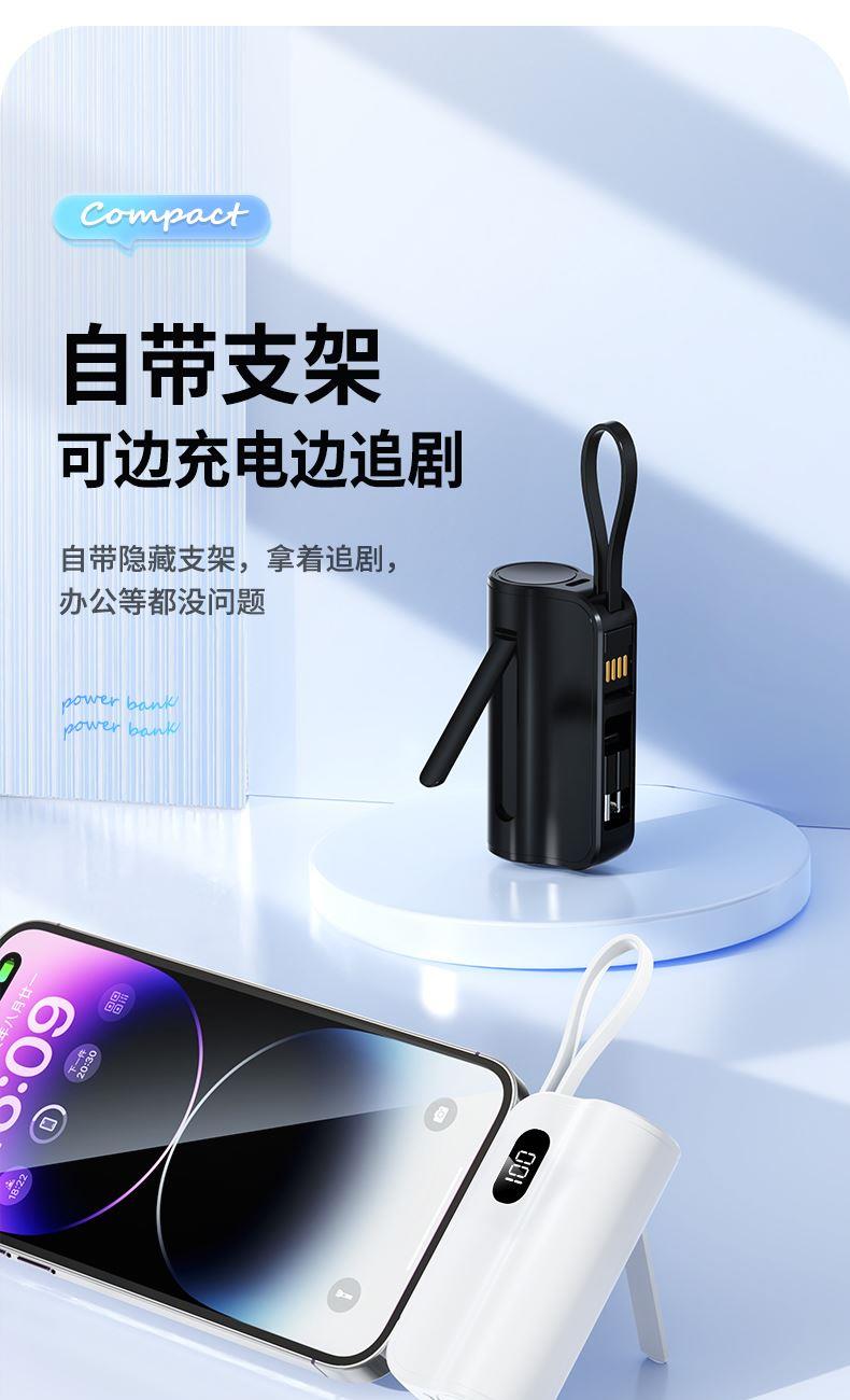 口袋胶囊自带线移动电源K13 型 号: K13 电池 :21700*1pcs 电池类型 :21700电芯 容量:5000mAh 材质 :ABS+PC 尺寸 :78*47*25MM 功能特点 仅口红般大小,精巧玲珑; 5000毫安容量,应急高手,保证顺畅沟通; 自带苹果接口和Type-c尾插接口,带USB充电线,各种机型轻松应对