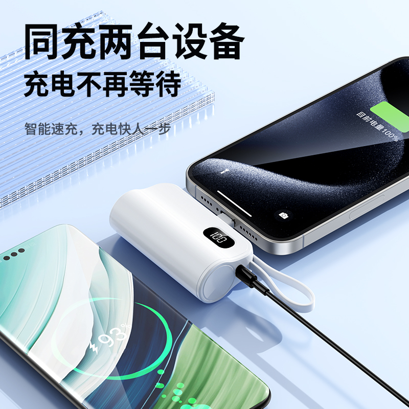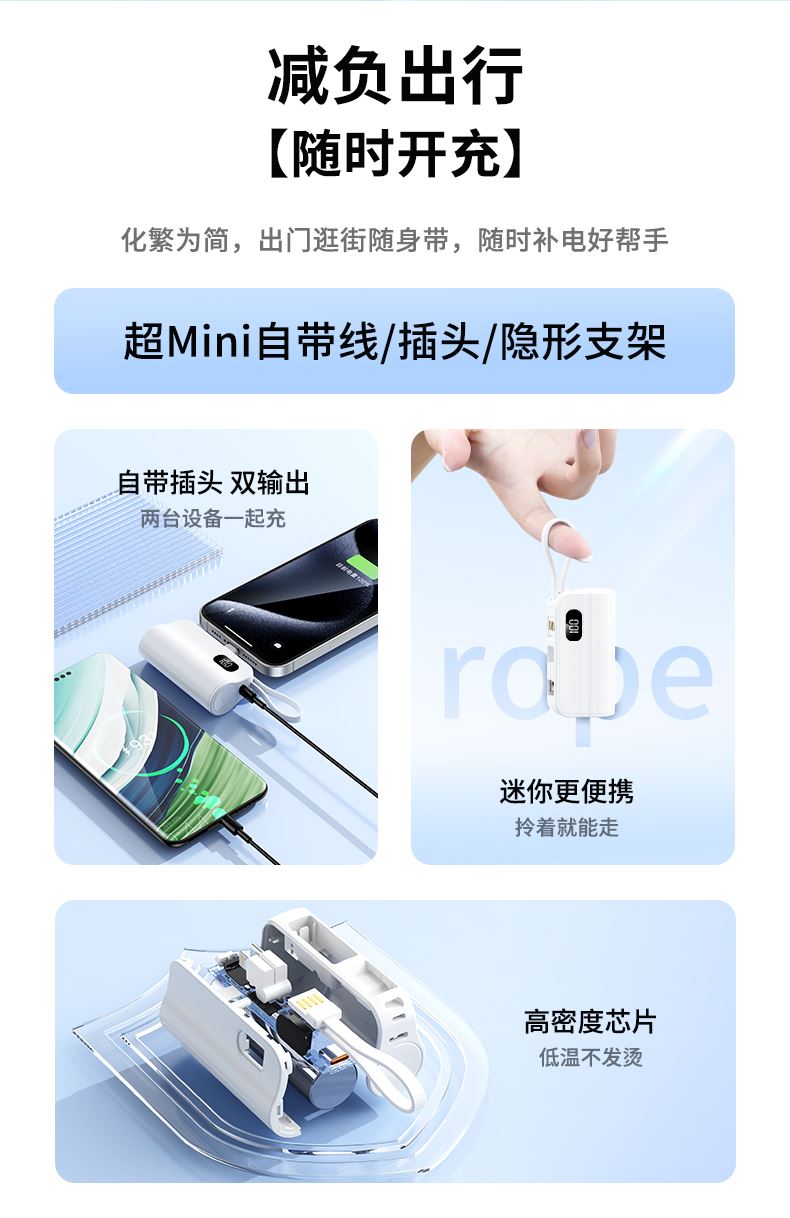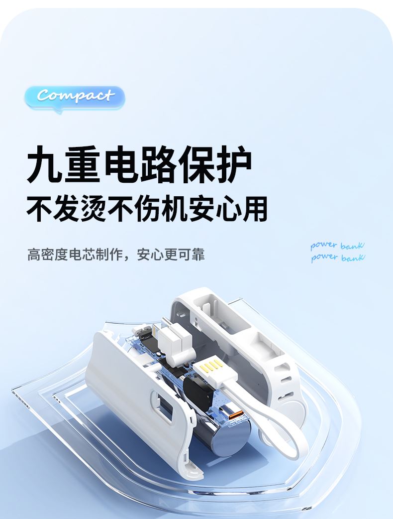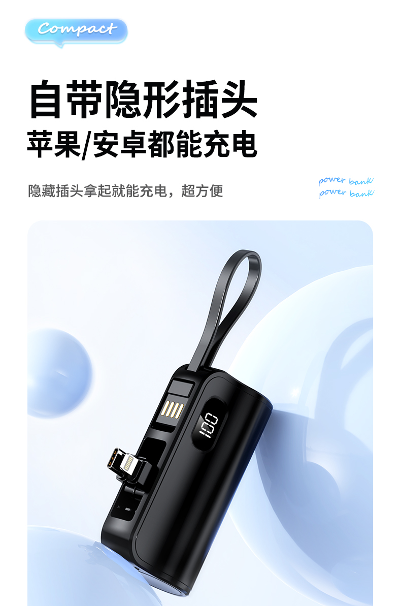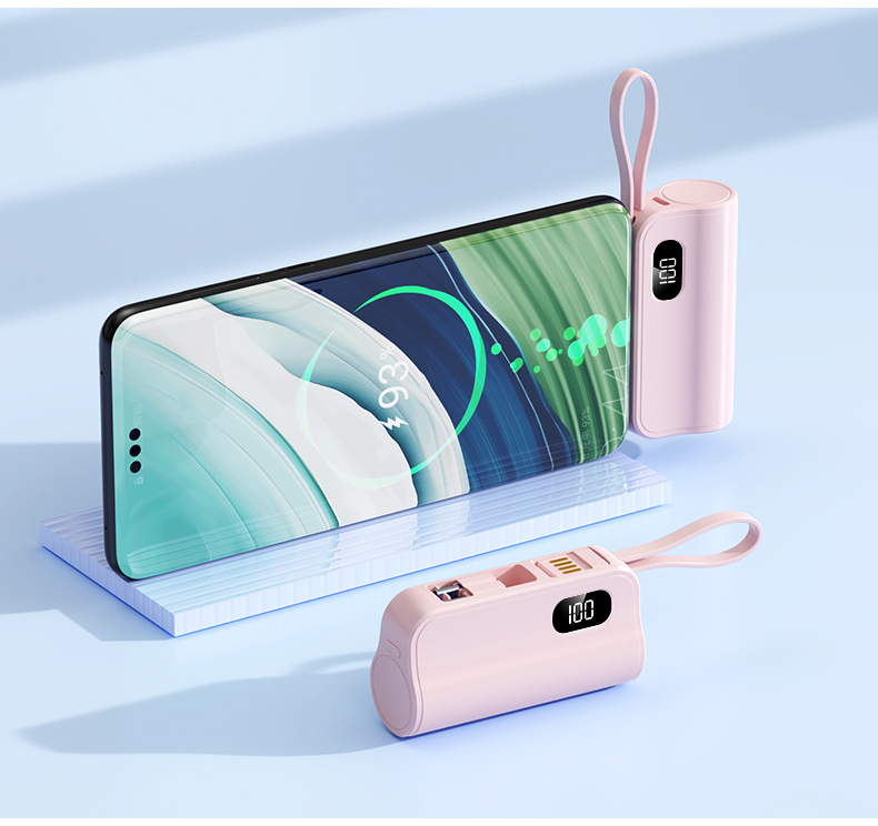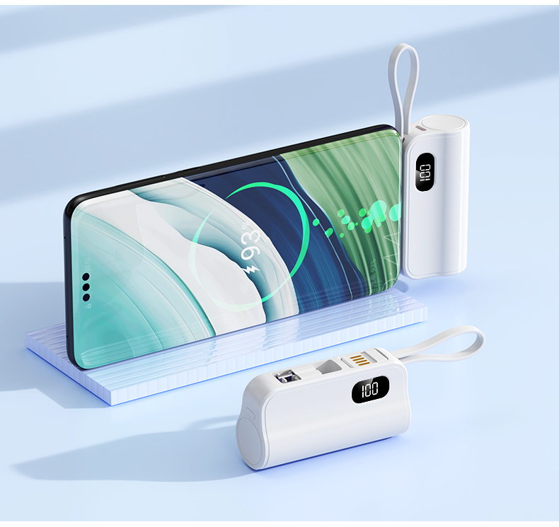 口袋胶囊自带线移动电源K13 型 号: K13 电池 :21700*1pcs 电池类型 :21700电芯 容量:5000mAh 材质 :ABS+PC 尺寸 :78*47*25MM 功能特点 仅口红般大小,精巧玲珑; 5000毫安容量,应急高手,保证顺畅沟通; 自带苹果接口和Type-c尾插接口,带USB充电线,各种机型轻松应对