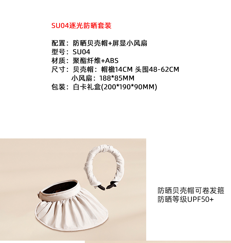 配置:防晒贝壳帽+屏显小风扇 型号:SU04 材质:聚酯纤维+ABS 尺寸:贝壳帽:帽檐14cm 头围48-62cm 小风扇:188*85mm 包装:白卡礼盒(200*190*90mm)