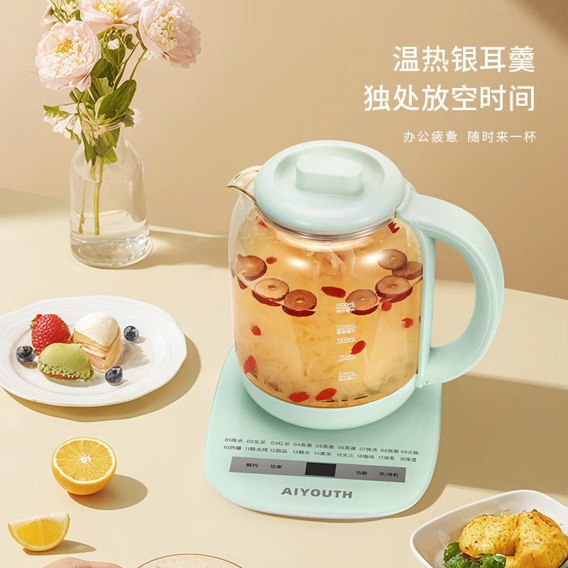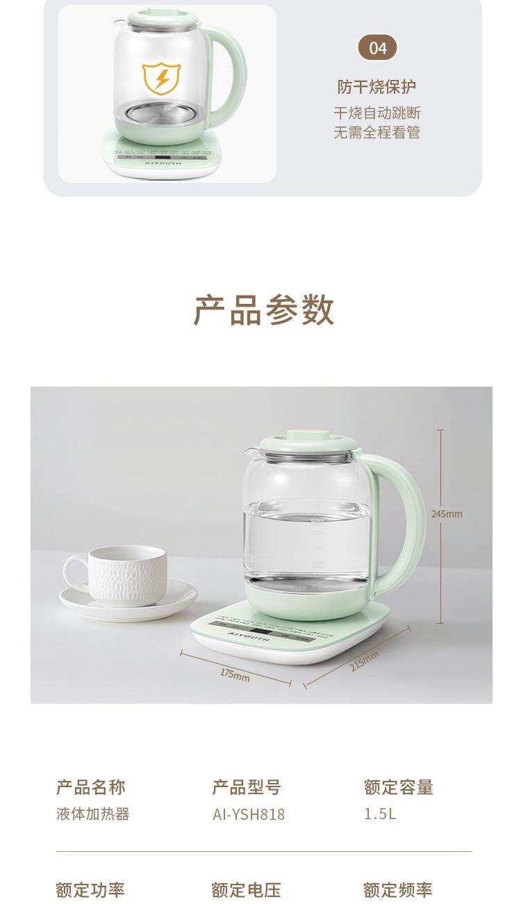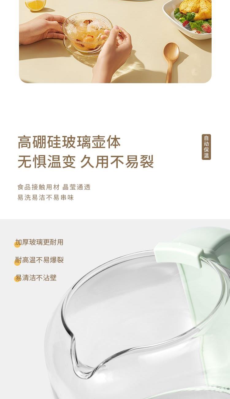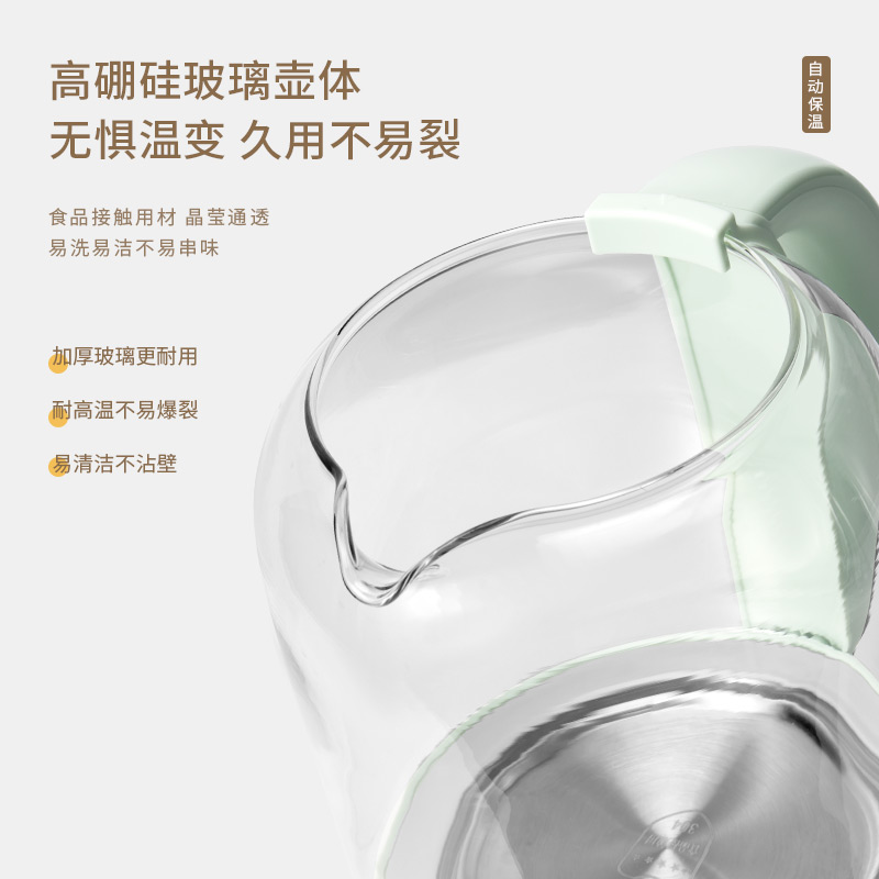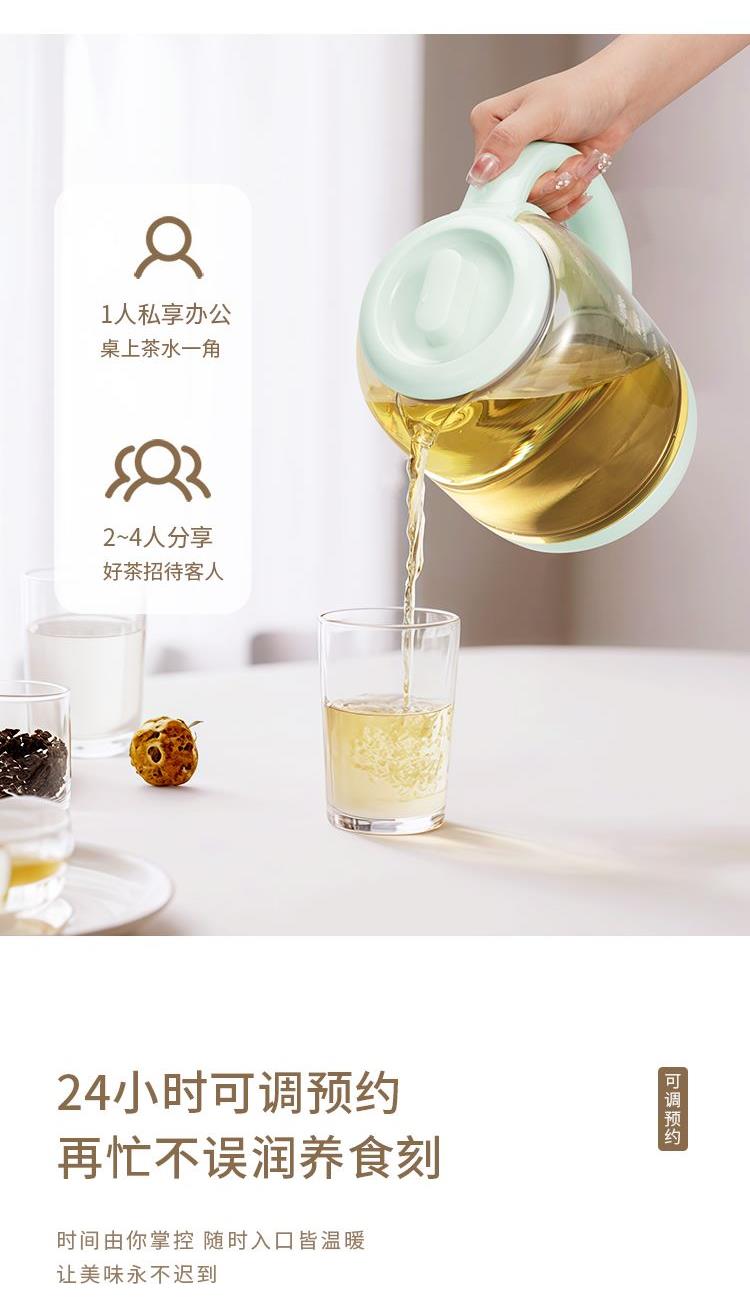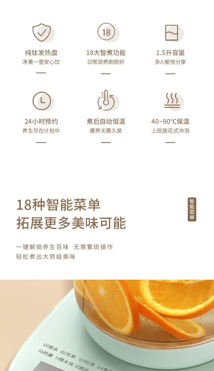 额定电压:220V~ 额定频率: 50HZ 额定功率:800W 额定容量:1.5L 产品颜色:浅绿色 产品重量:1.4kg 包装尺寸:252*210*260mm 产品尺寸:245*215*175mm 1.5升大容量,家居、办公都好用,想喝就在手边上 24小时智能预约+12段智能恒温,满足各式茶饮水温需求 24小时智能预约+12段智能恒温,满足各式茶饮水温需求 高硼硅玻璃壶体,壶身分离设计,清洗无死角,加水倒水更顺手 18种丰富菜单,满足四季日常茶汤饮,养生花样多多,轻松煮出大师级美味 纯钛黑科技发热盘,耐腐蚀性强,加热均匀快速 800大功率,快速沸腾不久等。60秒提壶记忆,壶体复位自动续煮无需重设程序
