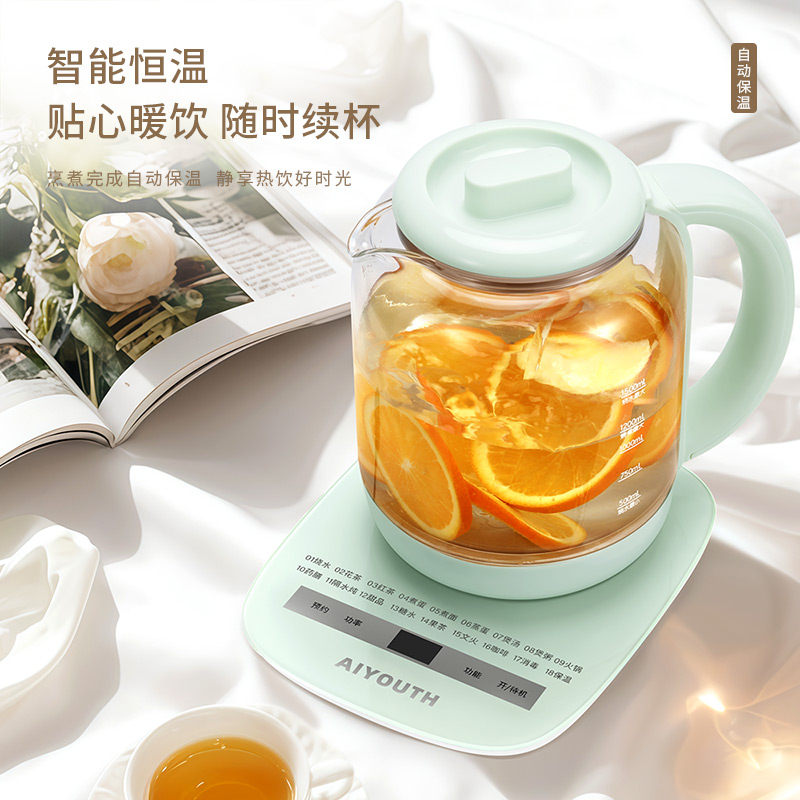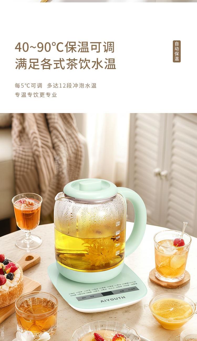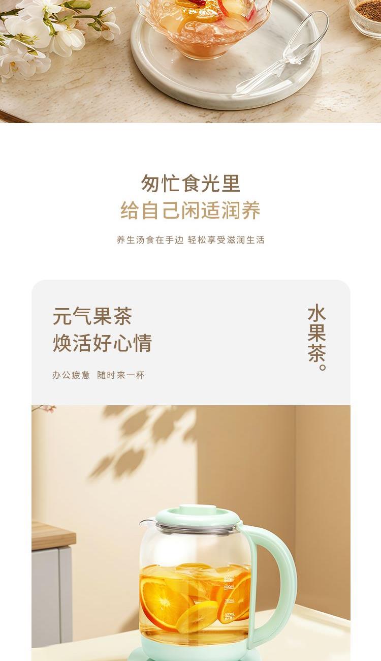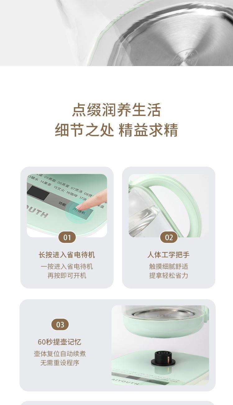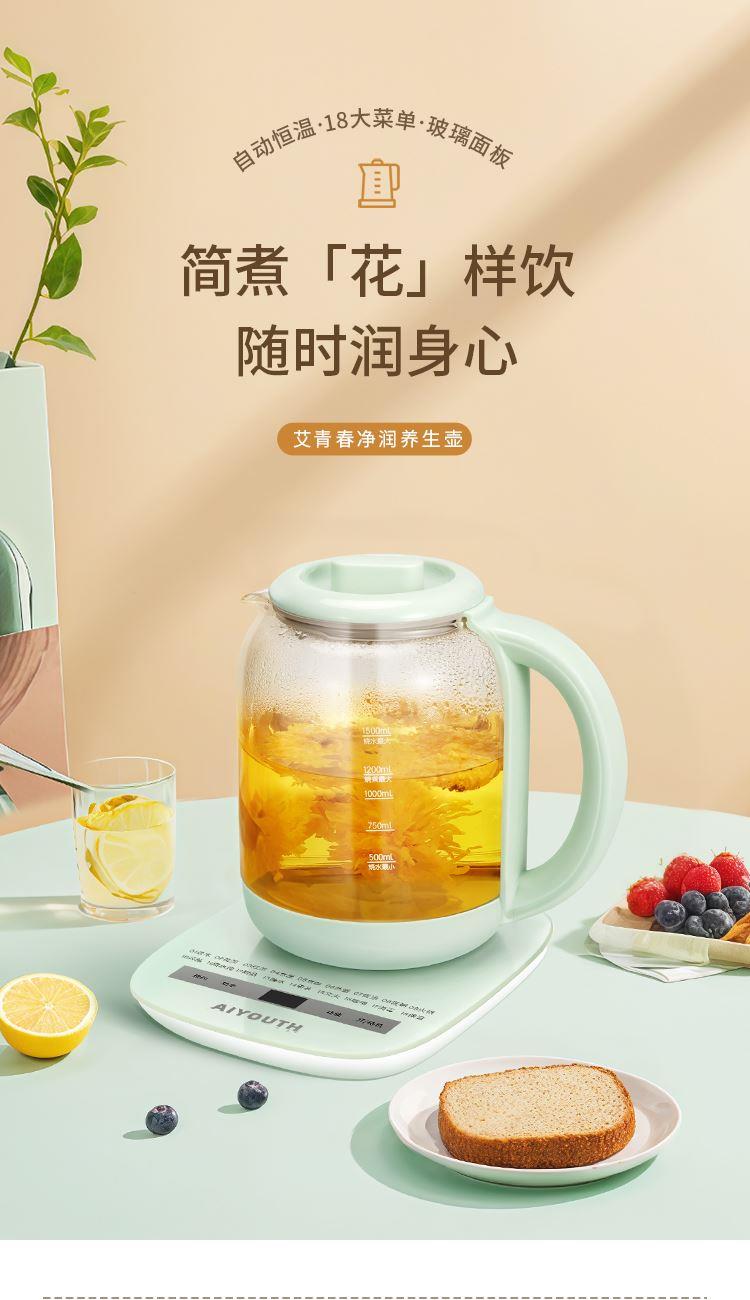 额定电压:220V~ 额定频率: 50HZ 额定功率:800W 额定容量:1.5L 产品颜色:浅绿色 产品重量:1.4kg 包装尺寸:252*210*260mm 产品尺寸:245*215*175mm 1.5升大容量,家居、办公都好用,想喝就在手边上 24小时智能预约+12段智能恒温,满足各式茶饮水温需求 24小时智能预约+12段智能恒温,满足各式茶饮水温需求 高硼硅玻璃壶体,壶身分离设计,清洗无死角,加水倒水更顺手 18种丰富菜单,满足四季日常茶汤饮,养生花样多多,轻松煮出大师级美味 纯钛黑科技发热盘,耐腐蚀性强,加热均匀快速 800大功率,快速沸腾不久等。60秒提壶记忆,壶体复位自动续煮无需重设程序
