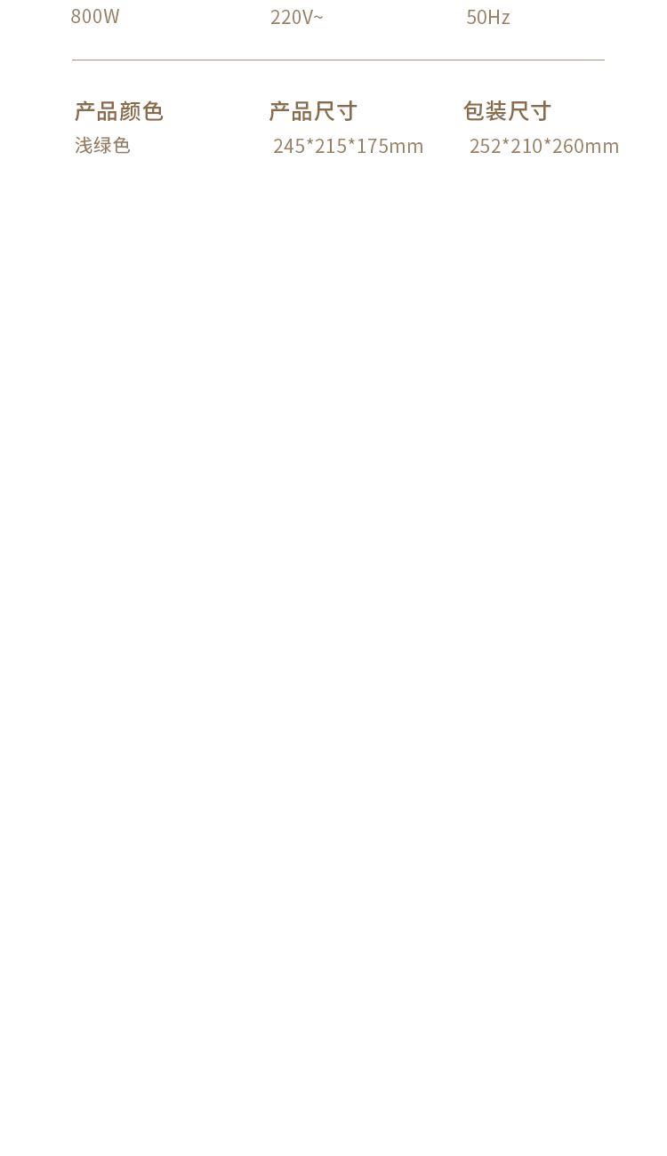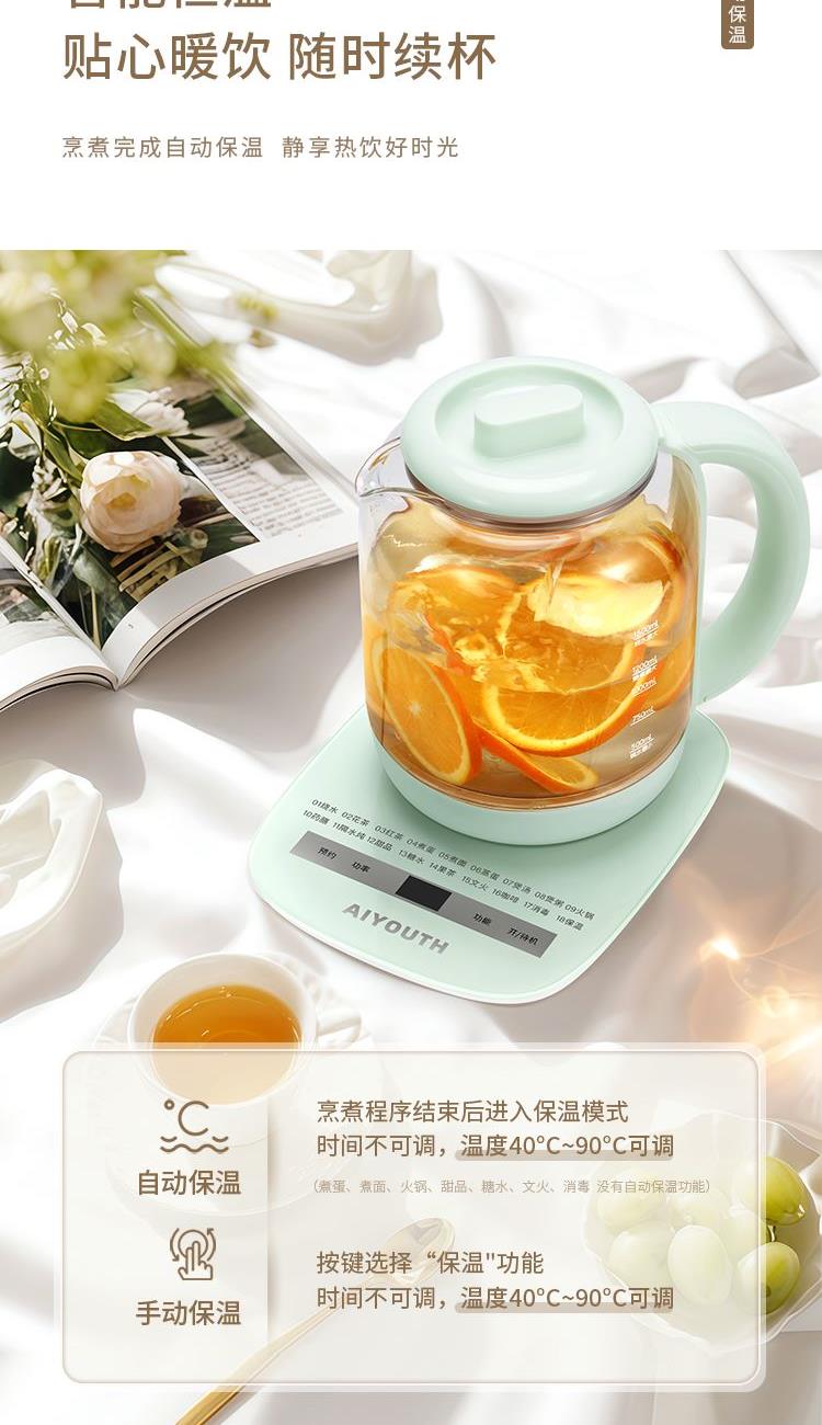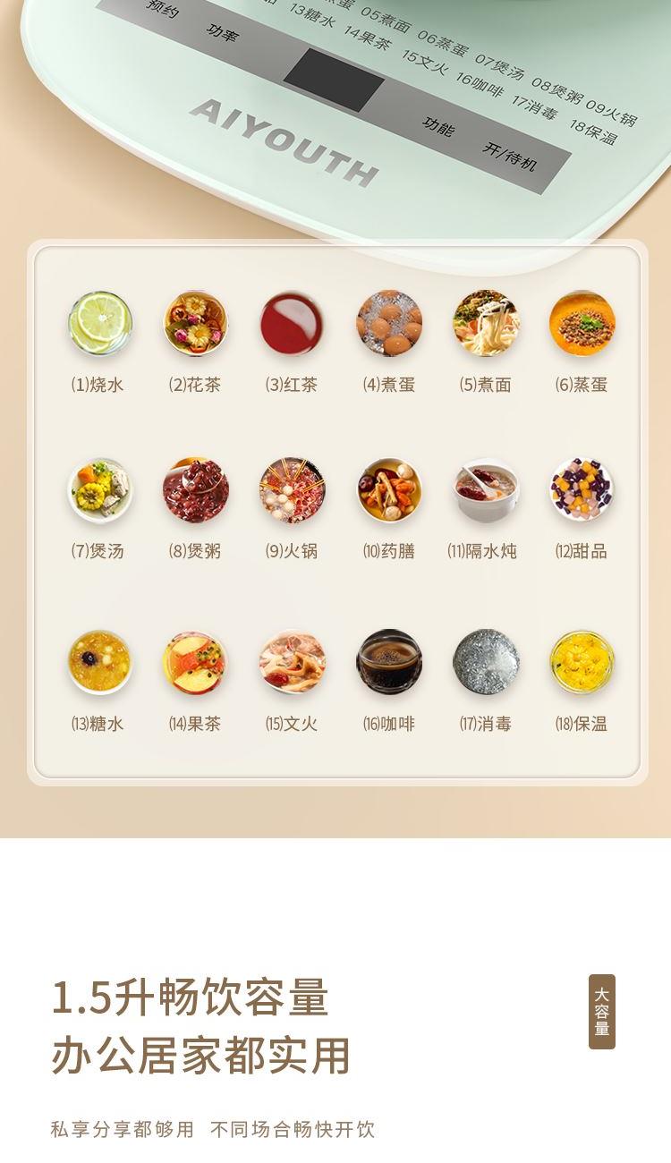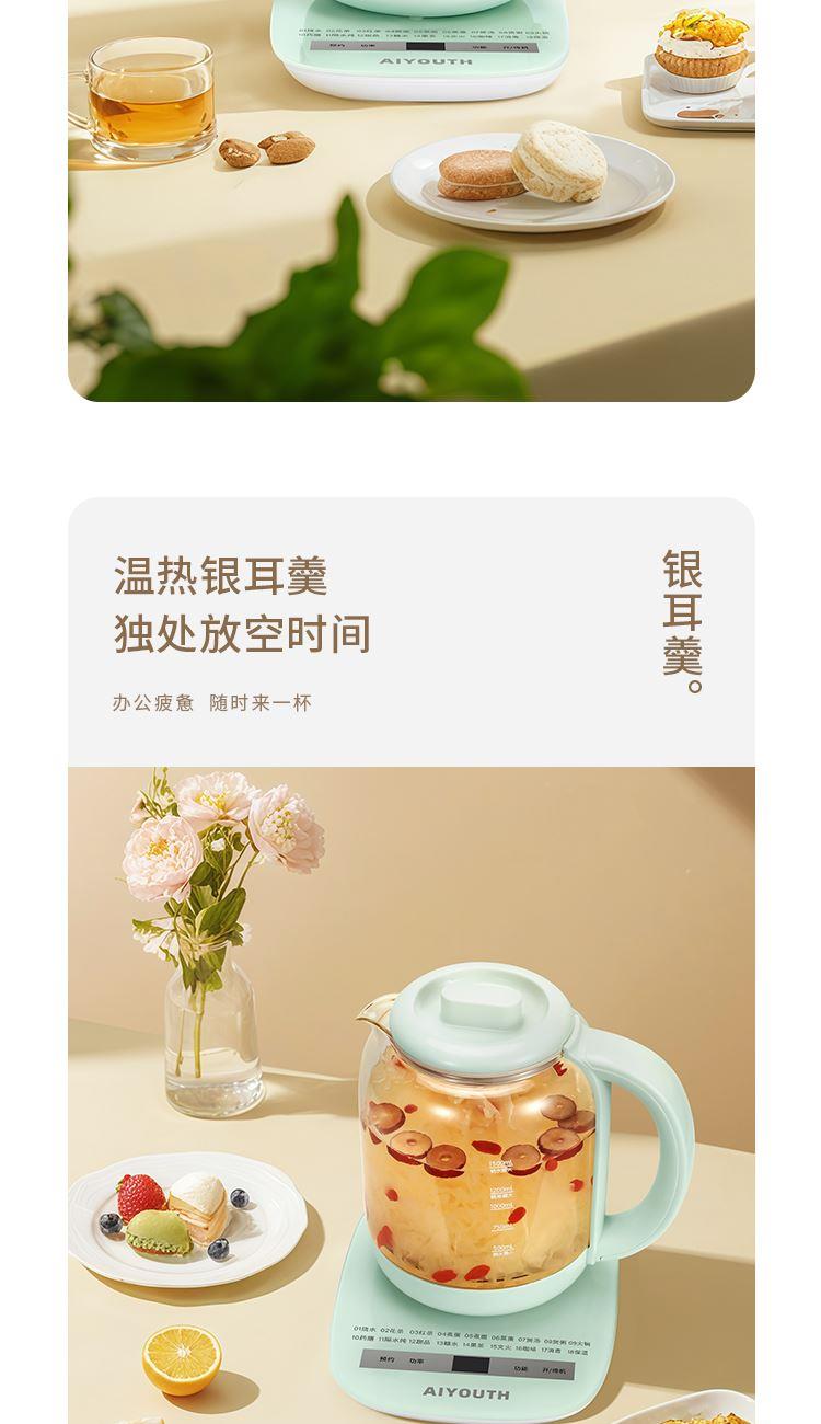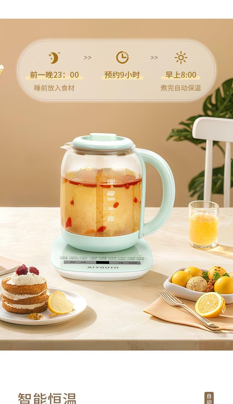额定电压:220V~ 额定频率: 50HZ 额定功率:800W 额定容量:1.5L 产品颜色:浅绿色 产品重量:1.4kg 包装尺寸:252*210*260mm 产品尺寸:245*215*175mm 1.5升大容量,家居、办公都好用,想喝就在手边上 24小时智能预约+12段智能恒温,满足各式茶饮水温需求 24小时智能预约+12段智能恒温,满足各式茶饮水温需求 高硼硅玻璃壶体,壶身分离设计,清洗无死角,加水倒水更顺手 18种丰富菜单,满足四季日常茶汤饮,养生花样多多,轻松煮出大师级美味 纯钛黑科技发热盘,耐腐蚀性强,加热均匀快速 800大功率,快速沸腾不久等。60秒提壶记忆,壶体复位自动续煮无需重设程序