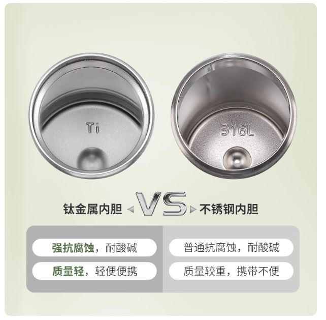 颜 色:绿色GG/粉色PK/蓝色BL 容 量:400ml 类 型:钛杯 定 制:可以定制 材 质:纯钛 保 温:6小时约60°C 保 冷:6小时约11°C以下