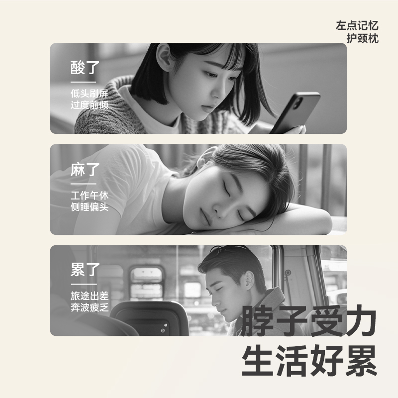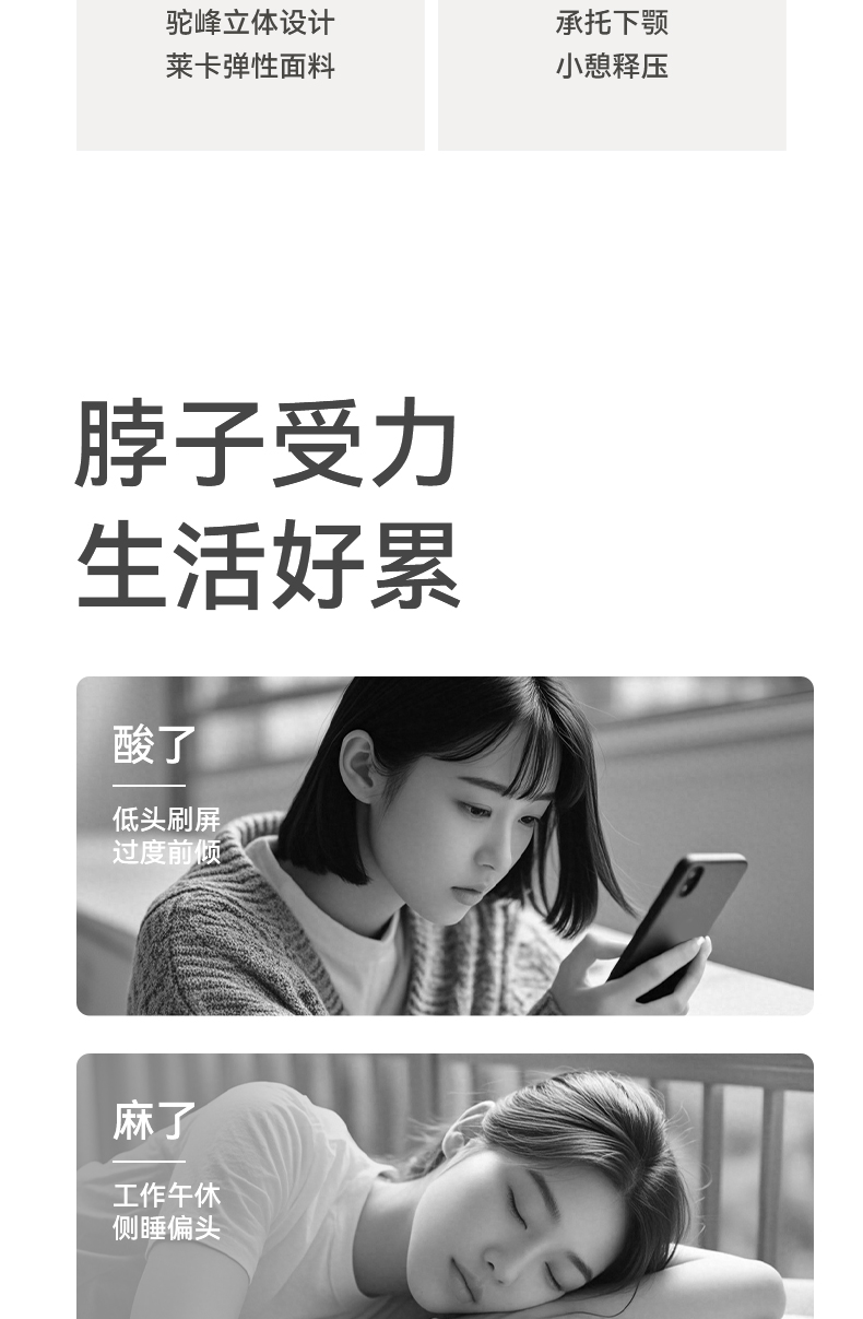 ●整体包裹性强:通过精心计算与测试,护颈枕的整体形状与尺寸被优化为能够紧密贴合用户的头部与颈部曲线,这种设计有助于减少睡眠中的翻身次数,延长深度睡眠时间。