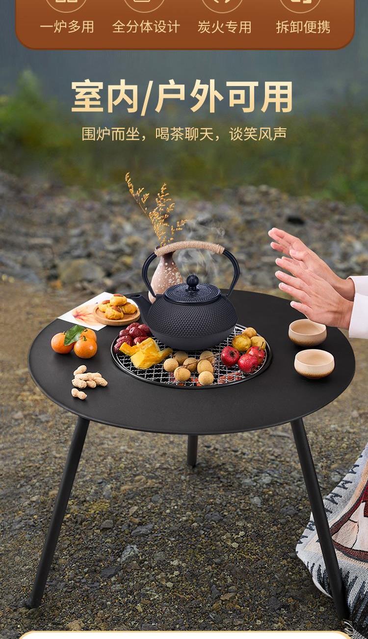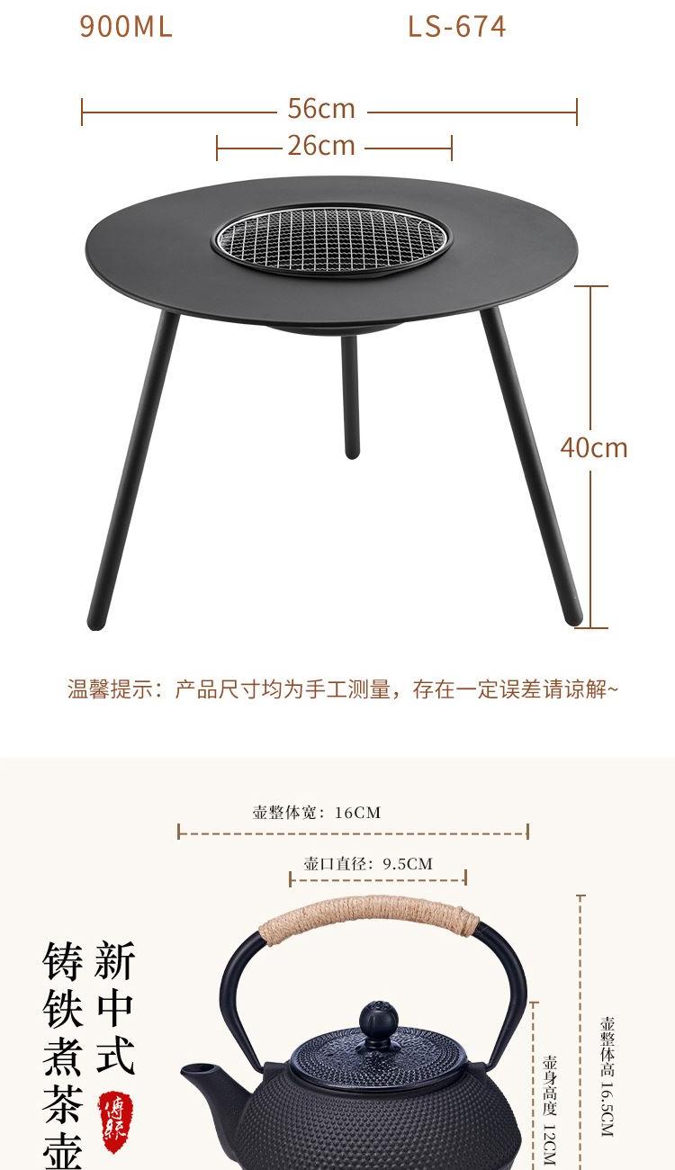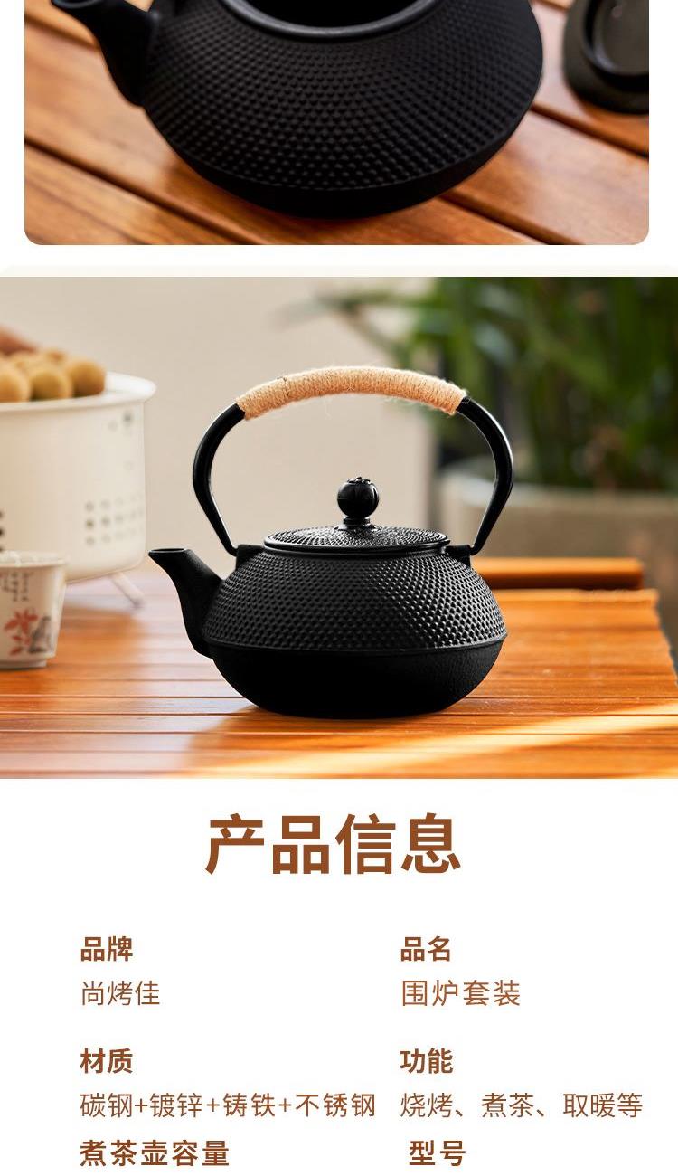 材质;碳钢+镀锌+铸铁+不锈钢 功能:烧烤、煮茶、取暖等 煮茶壶容量:900ML 型号:LS-674 围炉、煮茶壶、炭、炭夹、起盘器、煎盘