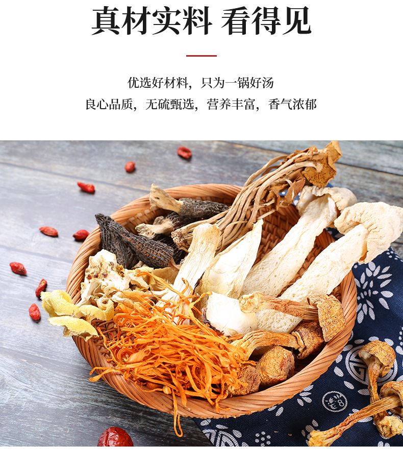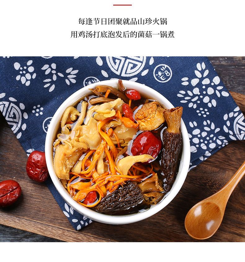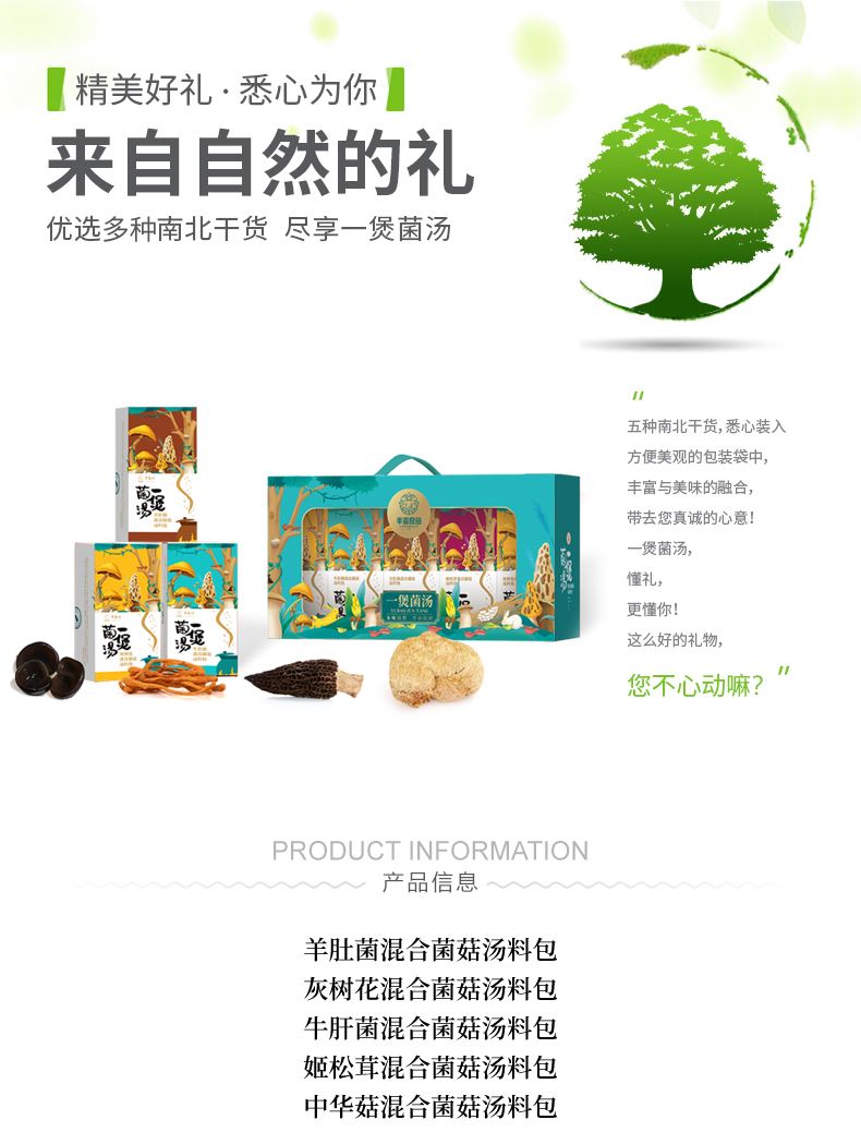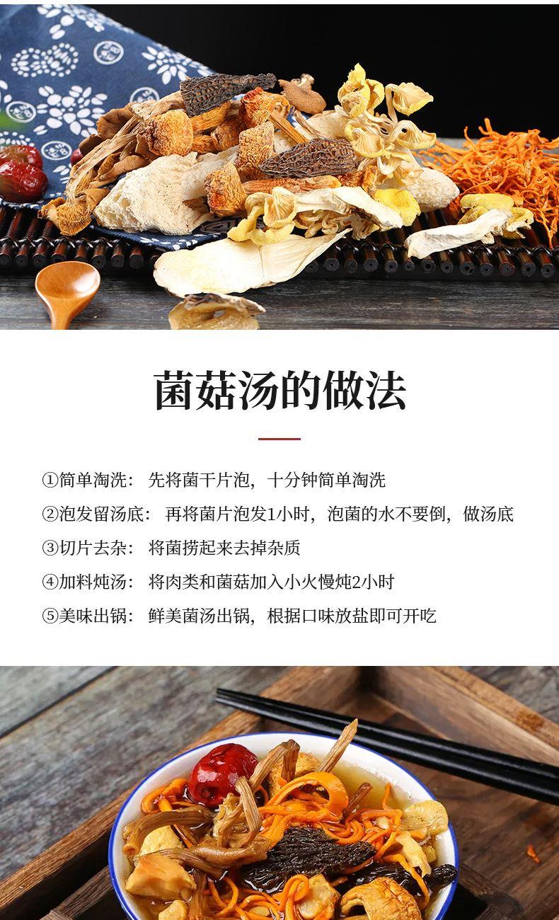 产品配置: 羊肚菌混合菌菇汤料包60g 灰树花混合菌菇汤料包60g 牛肝菌混合菌菇汤料包60g 姬松茸混合菌菇汤料包60g 中华菇混合菌菇汤料包60g 净含量:300g 礼盒尺寸:56*9*28cm 羊肚菌、牛肝菌等鲜菌入料,五种菌菇汤料包,一包一味, 煮出山野鲜香,为餐桌添珍馐。