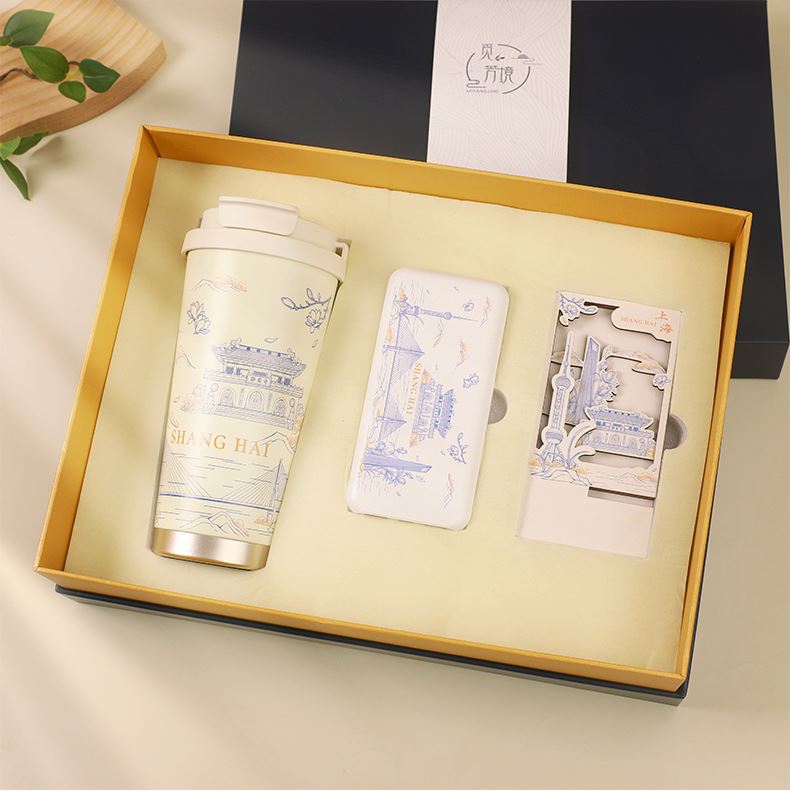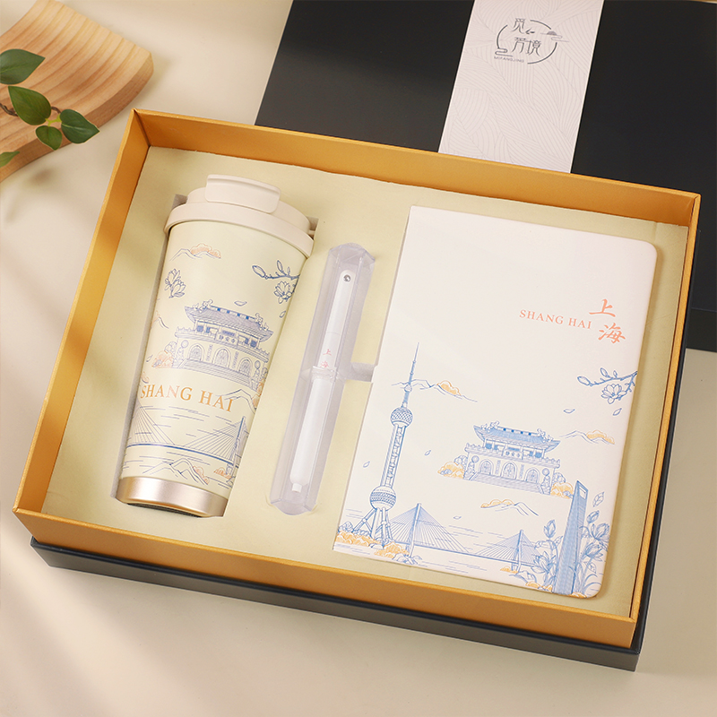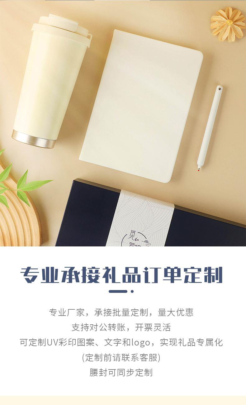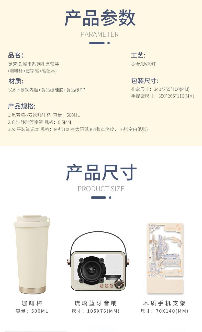 1.觅芳境--双饮咖啡杯 容量:500ml 内胆:316 外壳:304 杯盖:食品级PP 吸管:食品级硅胶 吸嘴:食品级PP 密封圈:食品级硅胶 2.自洁转动签字笔 规格:0.5mm 3.A5平装笔记本 规格:80张100克太阳纸 (64张点格纹,16张空白纸张) 礼盒尺寸:340*255*100(MM) 手提袋尺寸:350*265*110(MM)