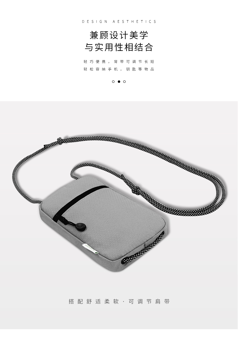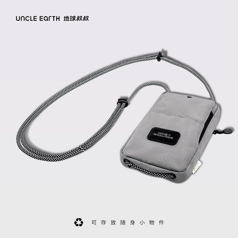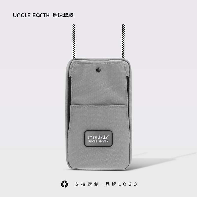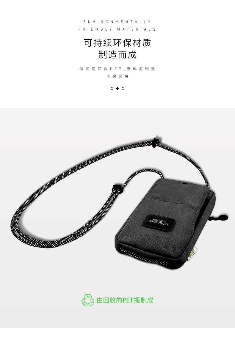 1.由回收塑料瓶RPET制成,相当于回收利用了2个500ml的PET塑料瓶 2.挂绳一拉即和,磁吸封口,快速存取手机或者钱包 3.可调节携带挂绳,作为斜挎包佩戴 4. PET防水防污面料,无畏雨天 5.外部拉链口袋,存放硬币钥匙等小物件 6.拥有RCS国际环保回收认证标准