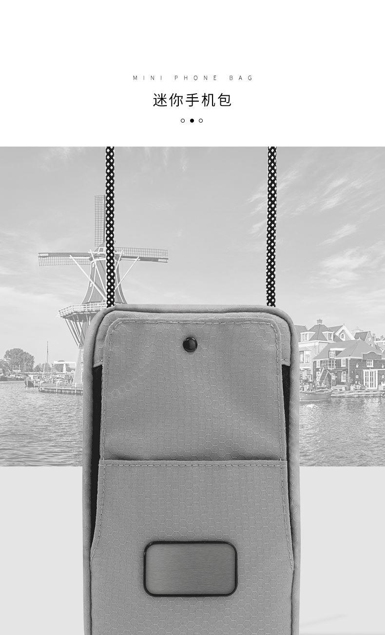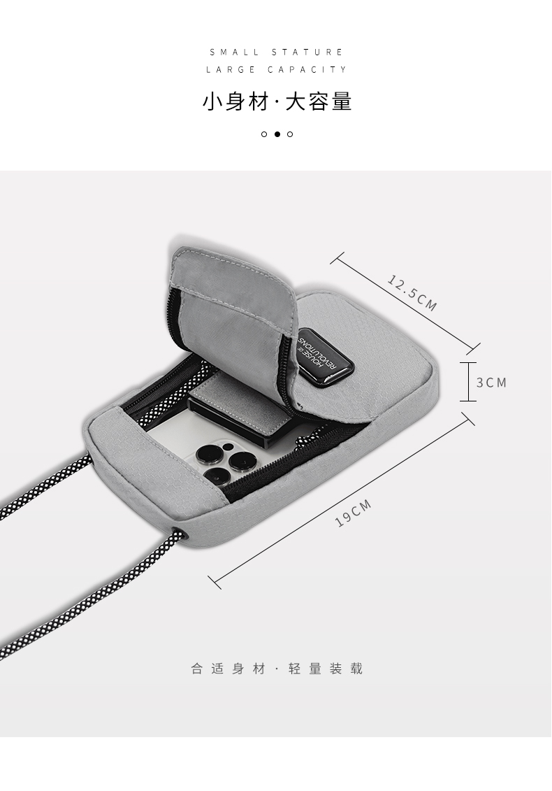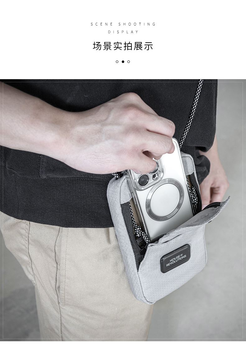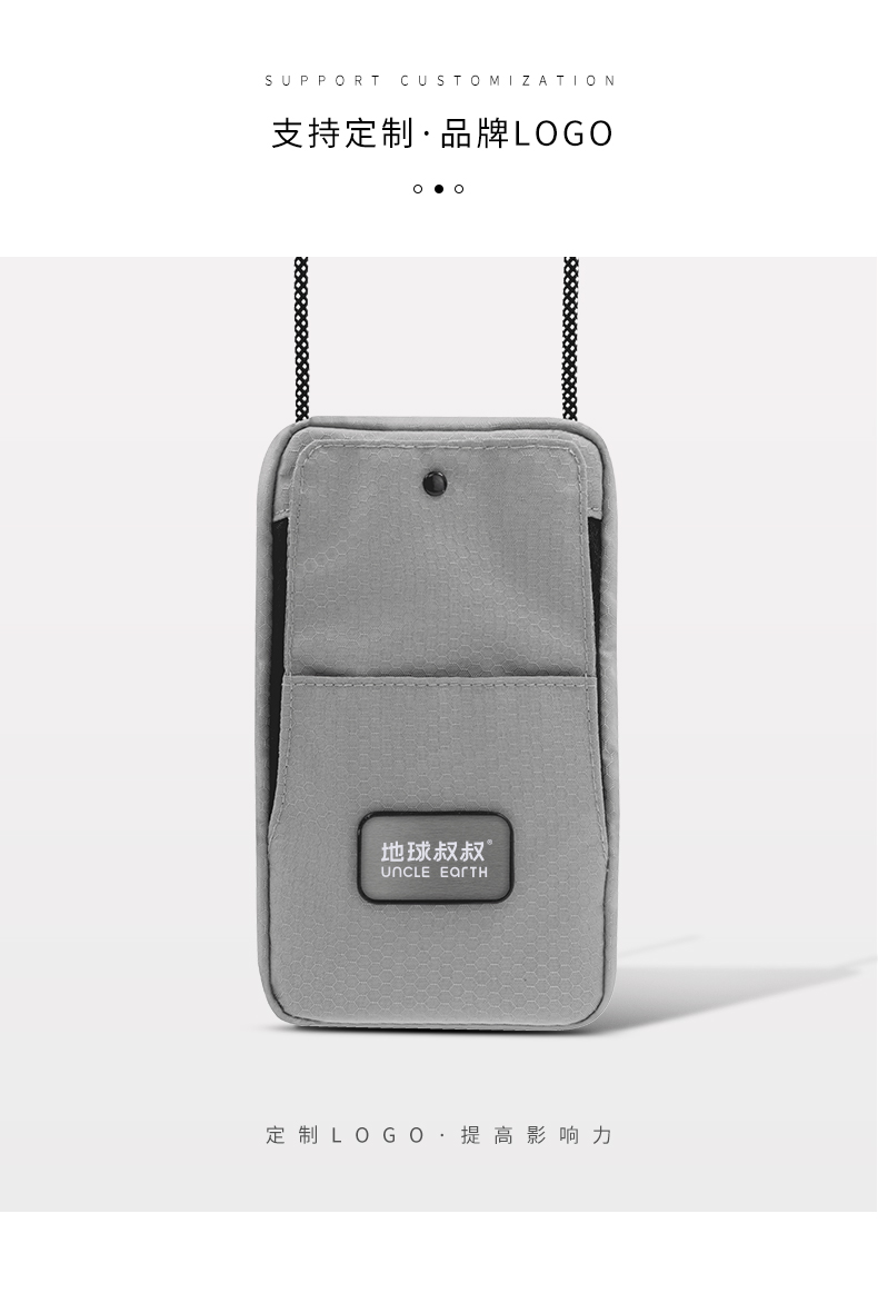1.由回收塑料瓶RPET制成,相当于回收利用了2个500ml的PET塑料瓶 2.挂绳一拉即和,磁吸封口,快速存取手机或者钱包 3.可调节携带挂绳,作为斜挎包佩戴 4. PET防水防污面料,无畏雨天 5.外部拉链口袋,存放硬币钥匙等小物件 6.拥有RCS国际环保回收认证标准