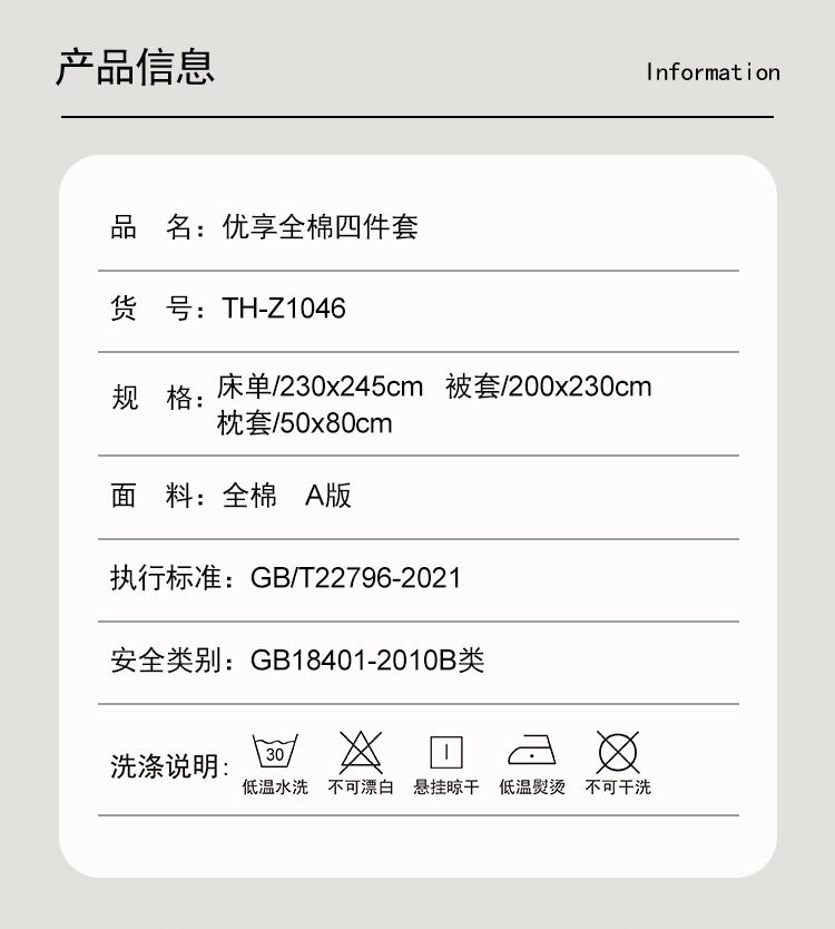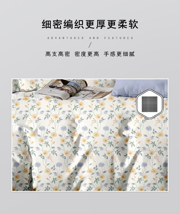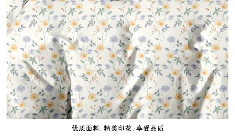 床单:230x245cm 被套:200x230cm 枕套:50x80cm 【面 料】全棉 A版 产品特点: 1.全棉织造,面料柔软细腻,透气性佳; 2.优质印染工艺,色彩丰富,层次感佳; 3.做工精良,款式简约大方。