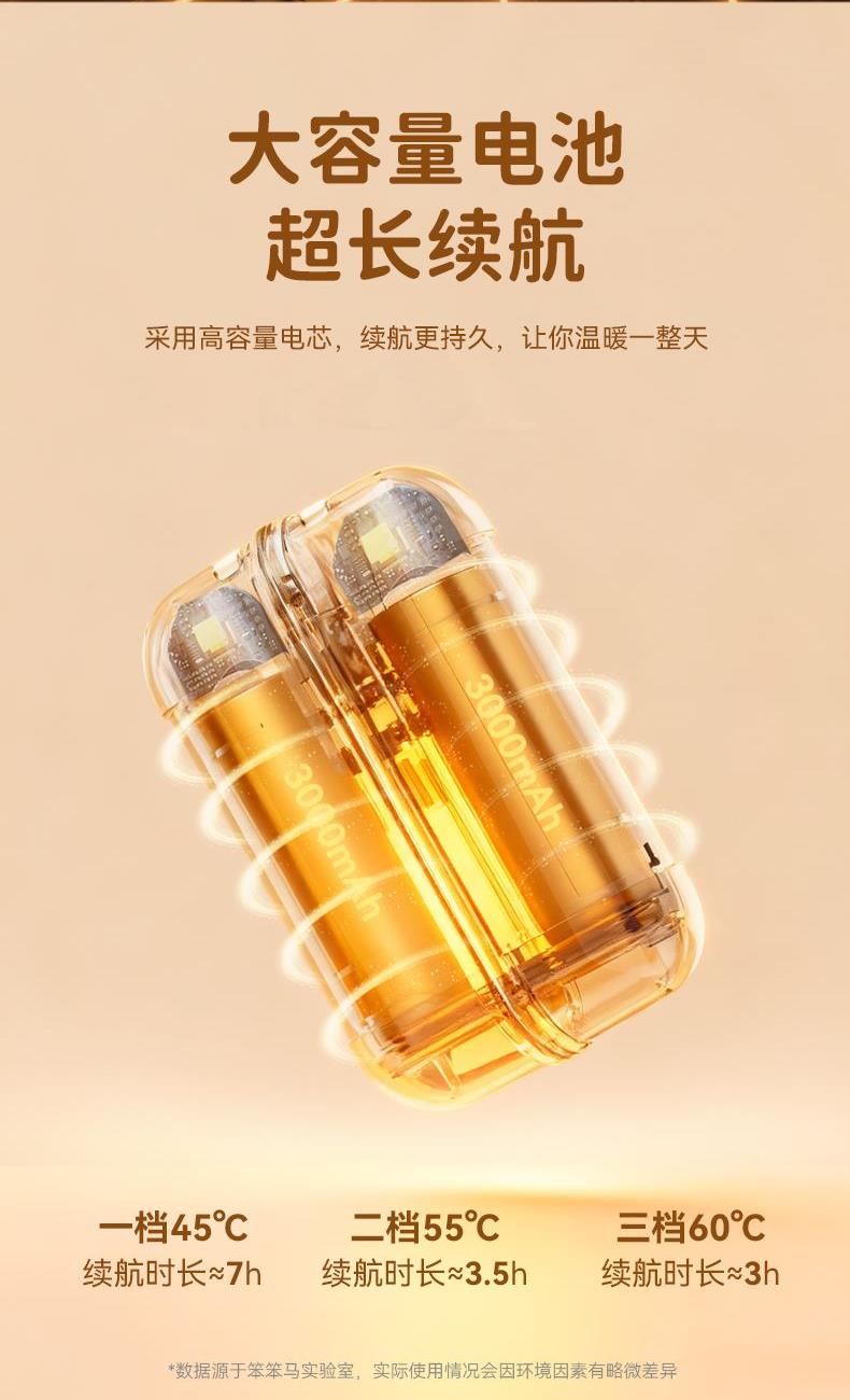 电池容量:3000*2mAh 产品尺寸:106.8*31.8*34.6mm 产品重量:225g 材质:ABS+铝合金+电子料 Type-C输入:5V/2A 额定功率:4.5W 充电:3.2H 续航:1档:7小时,2档:4.5小时,3档:3小时 颜色:米白色 材质:PC 双面毛绒触感,只手可握 采用PET发热膜双面发热,安全、可靠,使用寿命长 智能恒温三档可调温度: 45℃ 55℃ 60℃双面发热 理论发热时间3-7小时