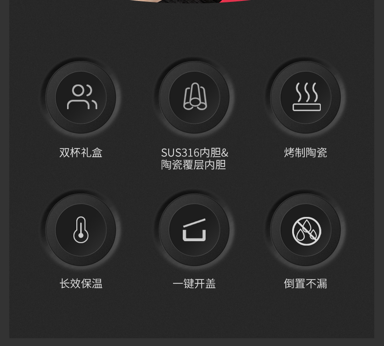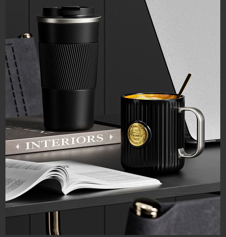 型号:VO-COF-B1TZ、VO-COF-B3TZ 颜色:耶加白,波盘黑 容量:500ml/400ml 尺寸:182*87mm/101*86mm 材质:SUS316不锈钢内胆/陶瓷覆层,陶瓷马克杯,硅橡胶,pp材质