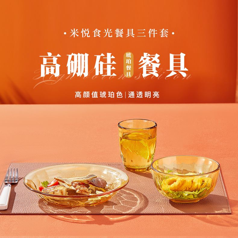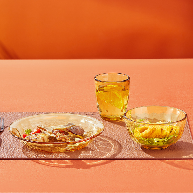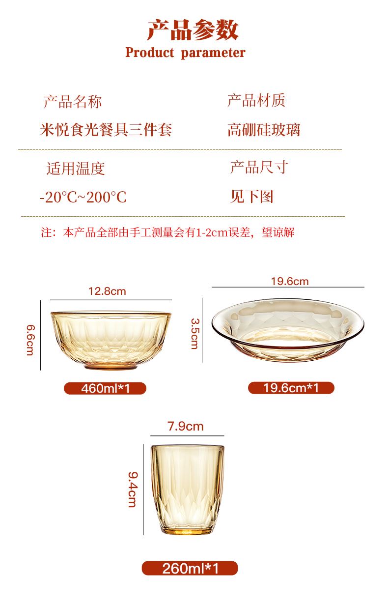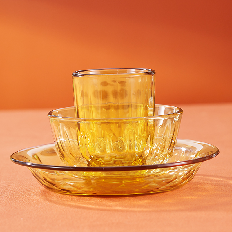 产品规格:小碗460ml*1、 杯260ml*1、 盘196mm*1 产品材质:高硼硅玻璃 彩盒尺寸:415*90*343mm 外箱尺寸:57.3*35.5*44.9cm 外箱毛重:15kg 产品特点: 1.产品采用高硼色料玻璃材质,颜色与生俱来,永不退色。烤箱、微波炉、冰箱冷冻放心使用。2.高硼餐具设计理念,用线条勾勒几何切面,以面为境折射时光、徜徉星空。3.触感温润,为您的餐桌增添一抹高雅。