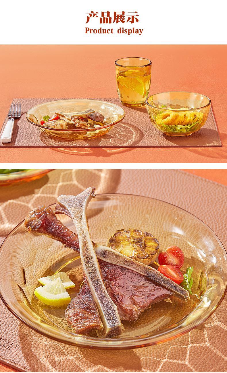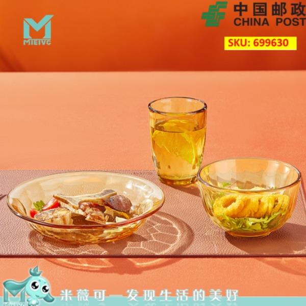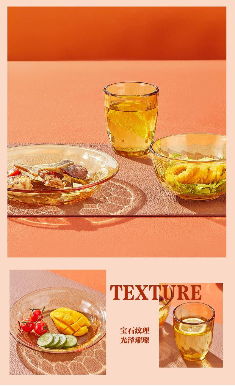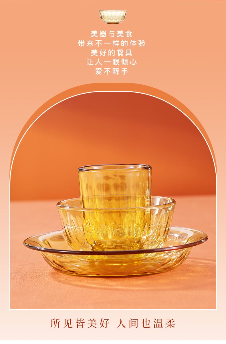 产品规格:小碗460ml*1、 杯260ml*1、 盘196mm*1 产品材质:高硼硅玻璃 彩盒尺寸:415*90*343mm 外箱尺寸:57.3*35.5*44.9cm 外箱毛重:15kg 产品特点: 1.产品采用高硼色料玻璃材质,颜色与生俱来,永不退色。烤箱、微波炉、冰箱冷冻放心使用。2.高硼餐具设计理念,用线条勾勒几何切面,以面为境折射时光、徜徉星空。3.触感温润,为您的餐桌增添一抹高雅。