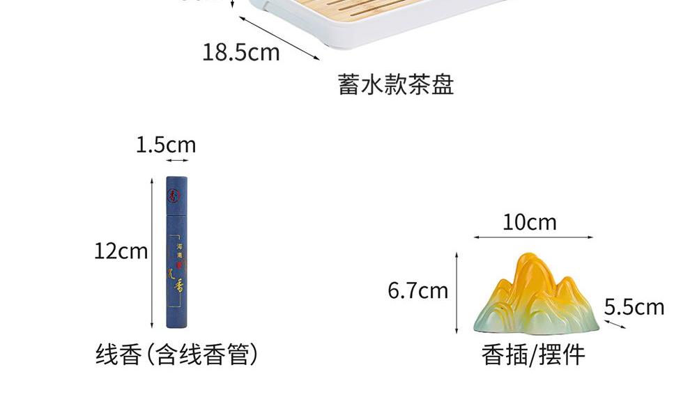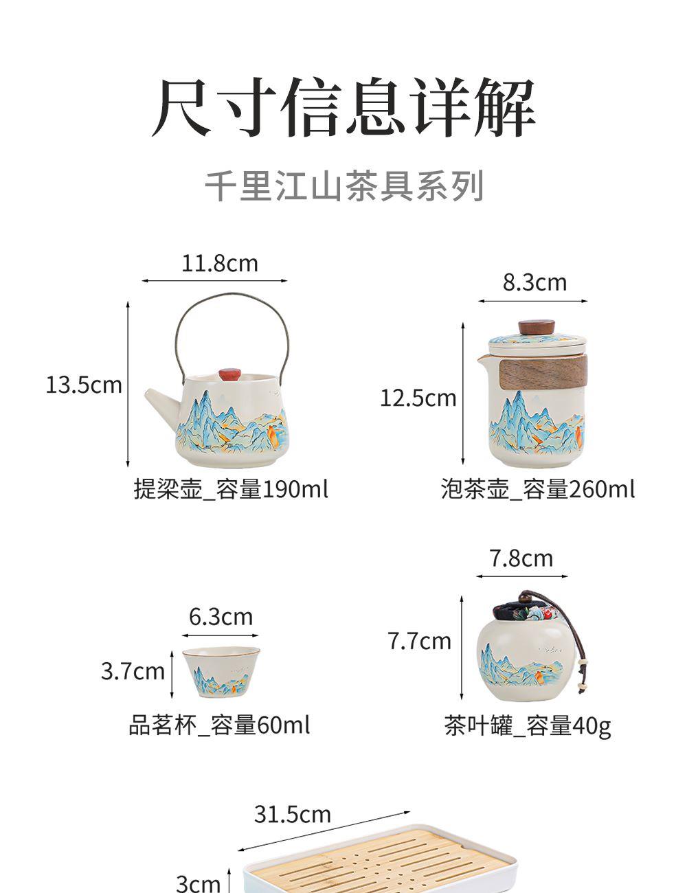 壶:11.8*13.5厘米 190ml 茶叶罐:7.8*7.8厘米 品茗杯:6.3*3.8厘米60ml 礼盒:30*13*14.5厘米 天然矿物釉,高温烧制无铅镉 ,精挑原料细筛瓷土,搭配礼盒包装,自用赠礼两宜,品质保障,甄选好礼。
