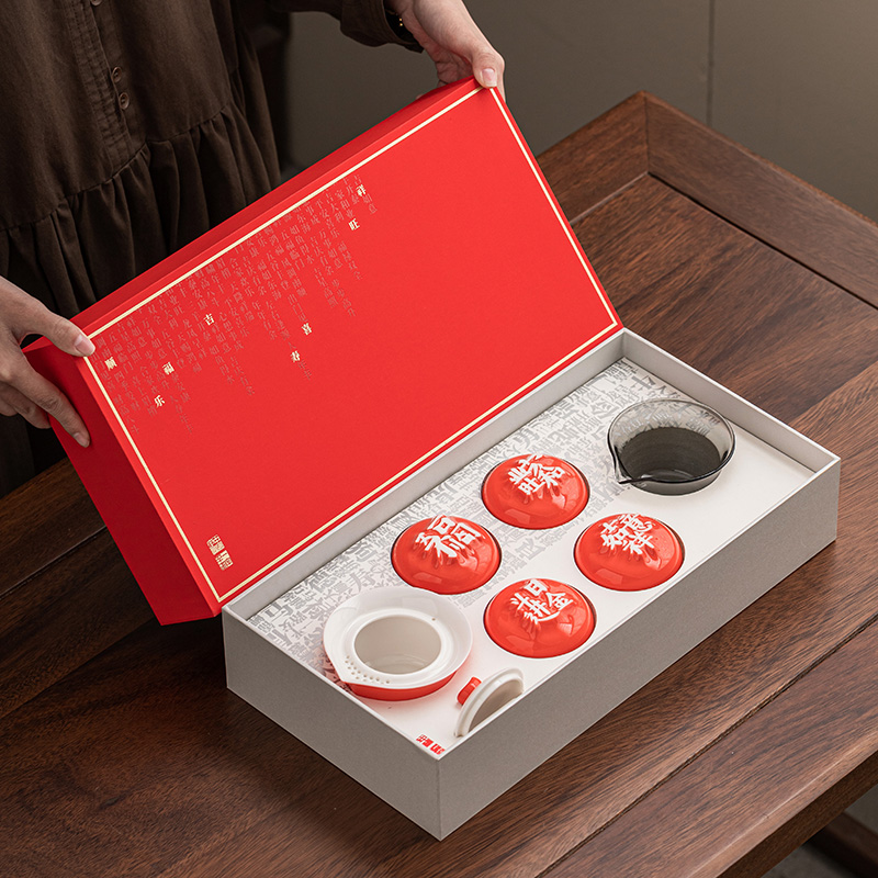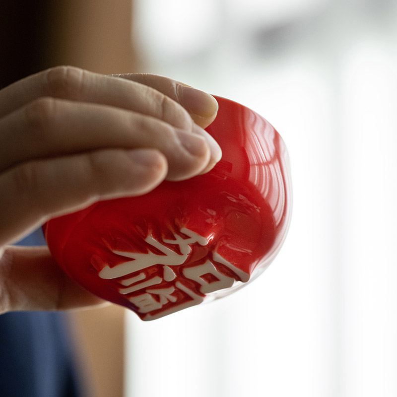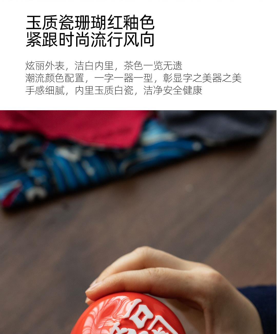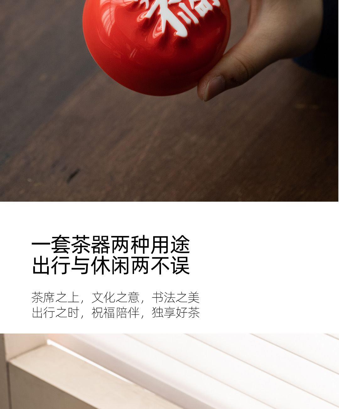 1:汉字杯历经1300度以上高温烧制,不含铅和镉等重金属。 2:杯底全新设计祝福文字,手工塑形。 3:休闲茶桌与旅行便携两用设计。 配置:合意杯*4(吉祥如意+日进斗金+家和业旺+五福临门) 快客易泡壶*1 玻璃公道*1 材质:白玉瓷胎 颜色:霏红