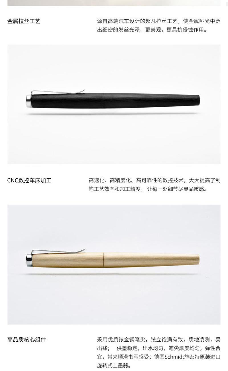 尺 寸:138*12.6mm 材 质:铝合金 外观颜色:黑色/银色/金色 1、德国原装进口的施密特SCHMIDT核心书写部分,铱立饱满有致 2、源自汽车设计的超凡拉丝工艺,使金属哑光中泛出细密的发丝光泽 3、德国Schmidt施密特原装进口旋转式上墨器 定制工艺:笔身激光Logo 笔盒印刷Logo 打样周期:3-5天 货 期:7-10天发货(不含重大法定假日) 包装方式:黑色触感纸礼盒