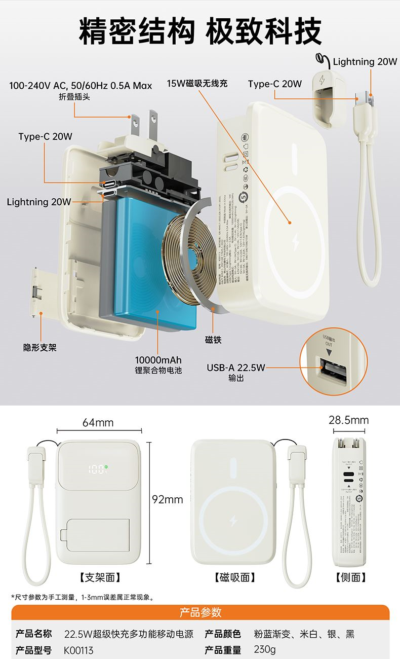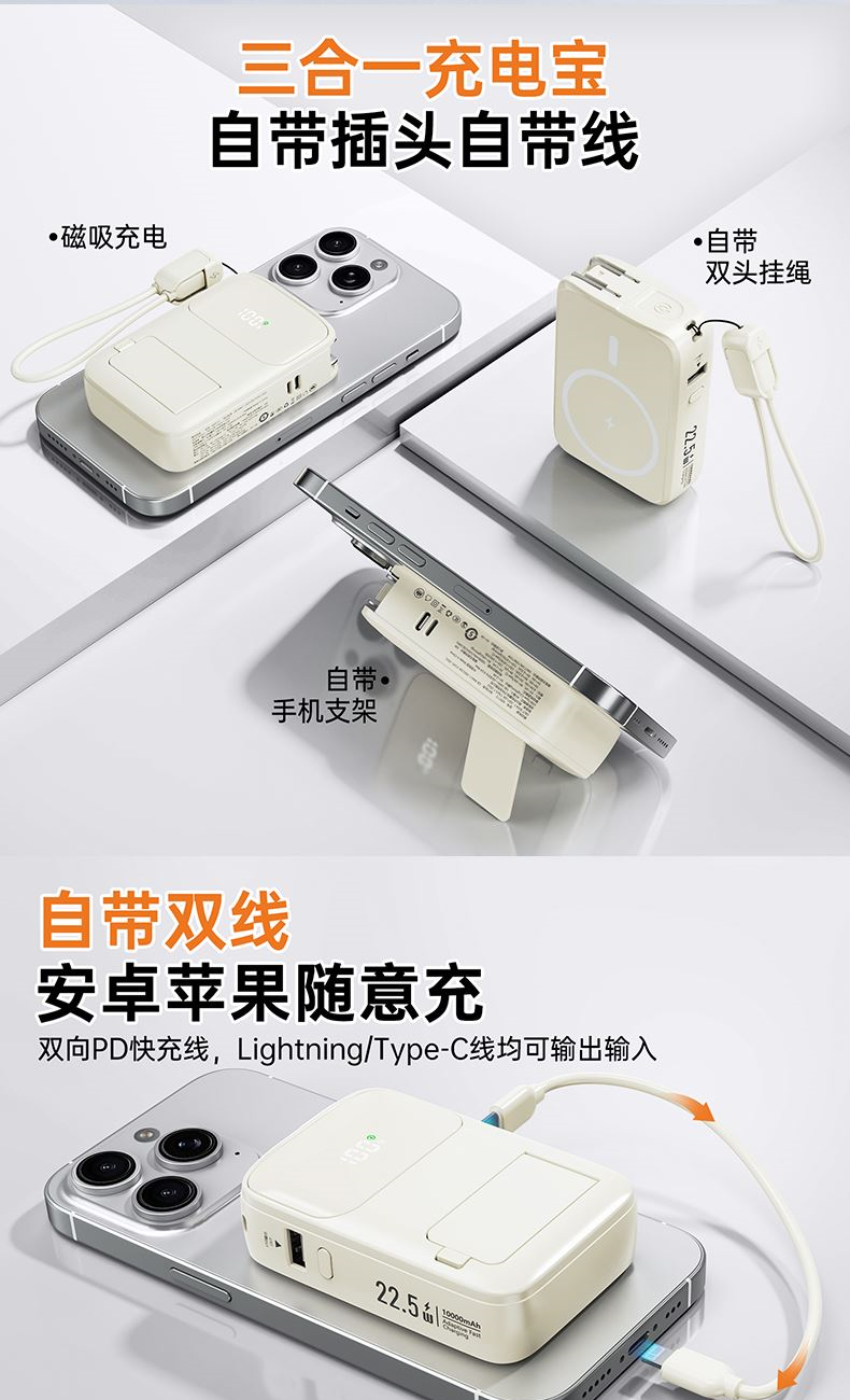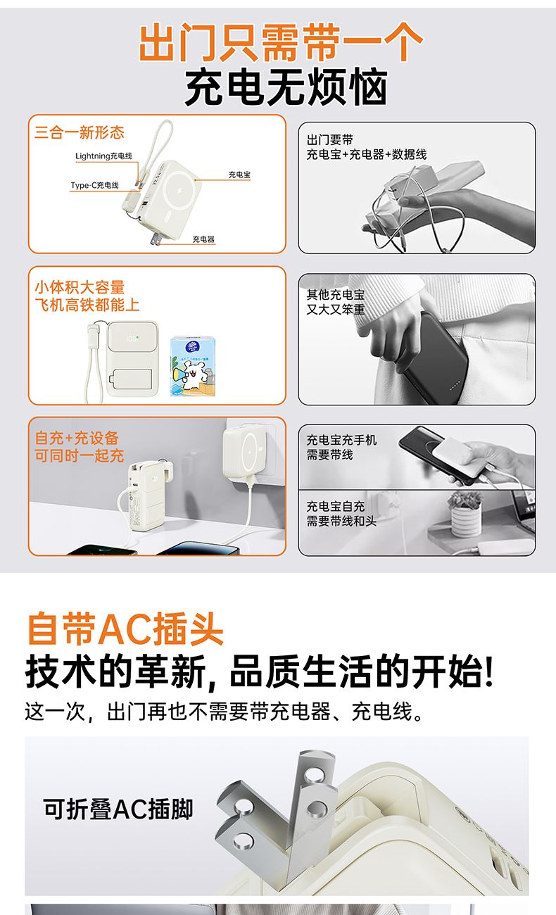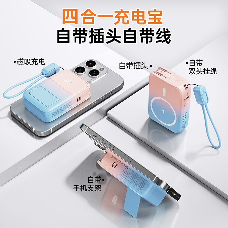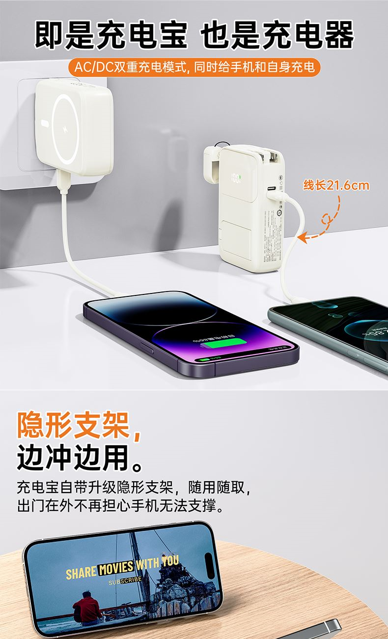 1.四合一充电宝自带插头、自带线、磁吸充电、自带支架; 2.自带双线安卓苹果随意充; 3.即是充电宝 也是充电器、AC/DC双重充电模式,同时给手机和自身充电; 4.充电宝自带升级隐形支架,随用随取出门在外不再担心手机无法支撑; 5.磁吸/有线同时充、配备多个输出端口,支持同时为多台设备充电; 6.自带AC插头、出门再也不需要带充电器、充电线